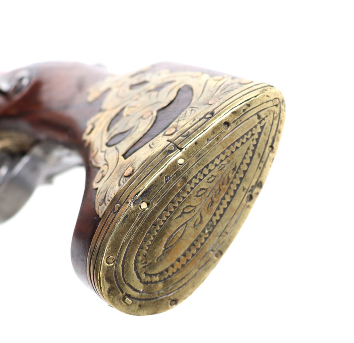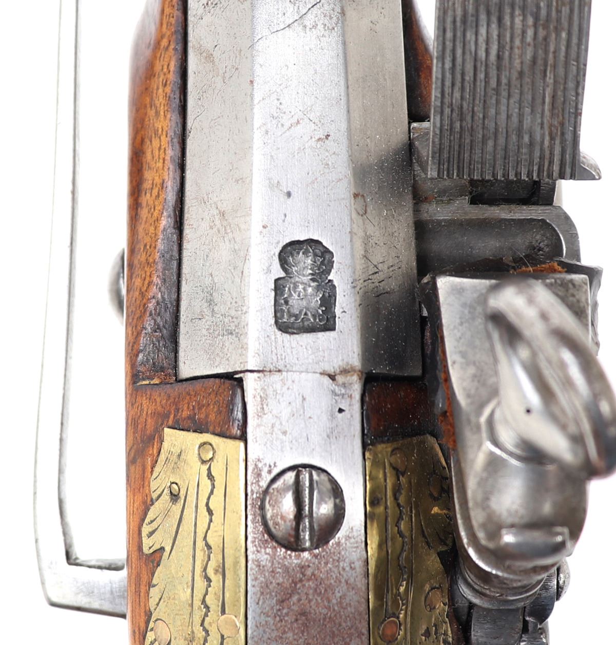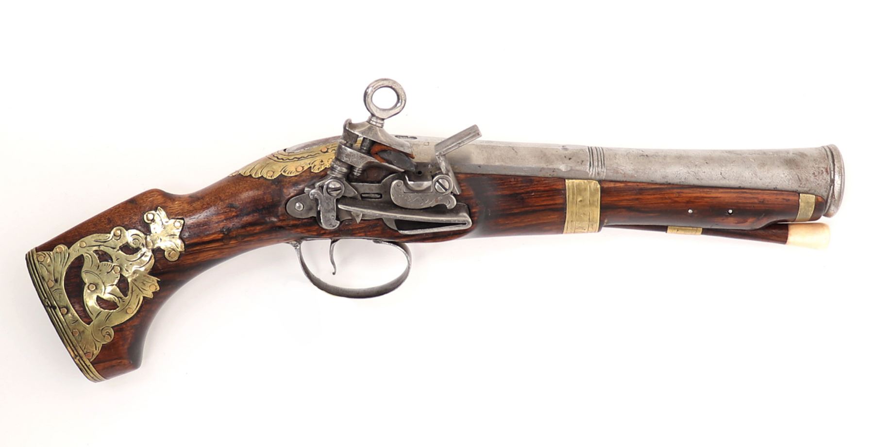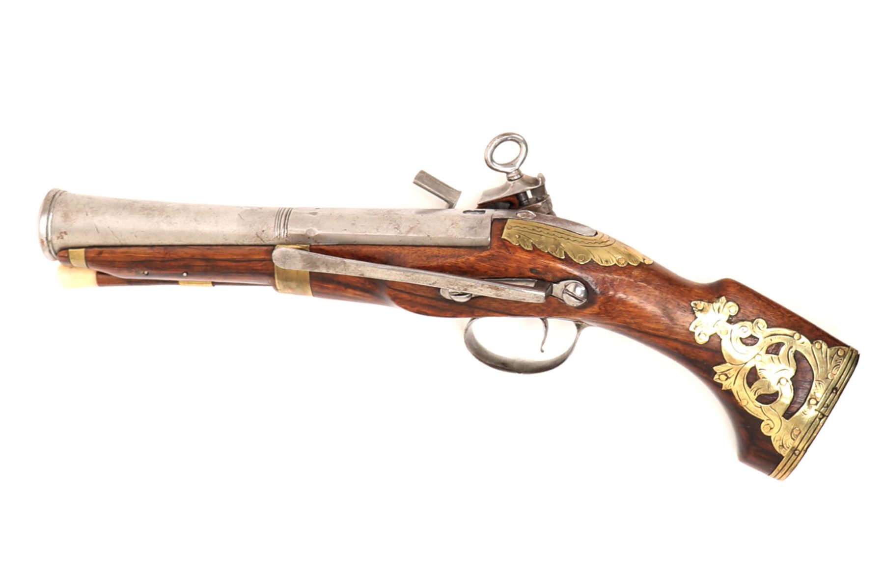 Iberian Peninsula, Catalonia, town of Ripoll. Fantastic very large Trabuco Spanish-Mexican miquelet flintlock blunderbuss pistol of the 18th century. Stock with refinishing in a blonde and brown color. Large panels of gilt brass to the classic (Catalan) butt. Engraved to gilt brass trigger stock plate with steel trigger guard. Octagonal to round large bore barrel with a flared blunderbuss muzzle. Lock with engraving of foliate motifs. Original side plate belt hook. Barrel with touch mark of size letters under the crown with the lower letters reading LAS?. Size 14" L, barrel 8" L. Condition: very good condition and state of preservation. Provenance: Ex-Southwest Arms and Armour Collection