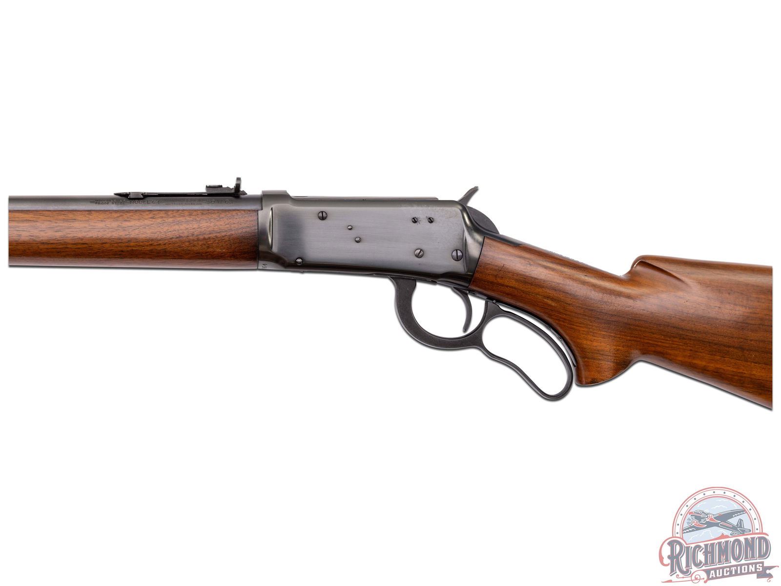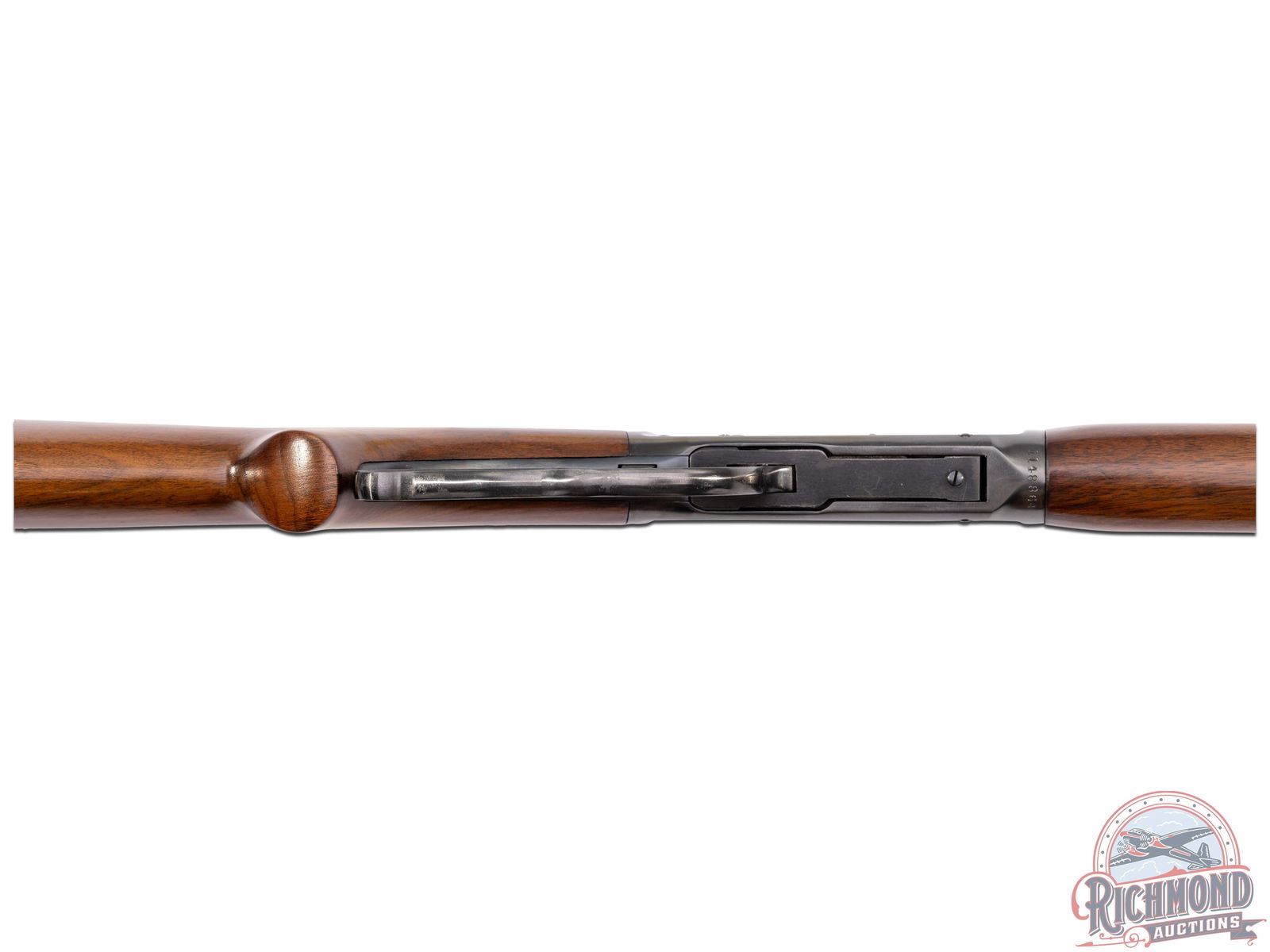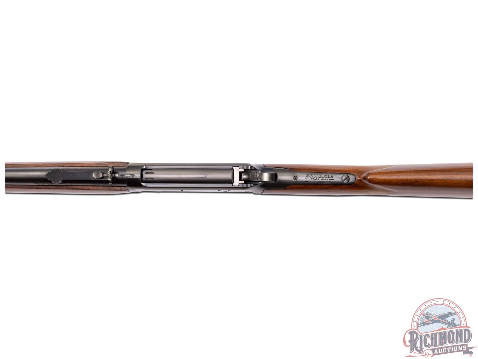 Manufactured in 1937. Features a 20" blued carbine barrel with all the standard Winchester roll marks and proof marks. Correct factory carbine hooded front ramp sight and rear adjustable buckhorn sight. Blued receiver with side loading gate and tubular magazine. Smooth walnut wood stock with pistol grip and matching forearm. Fitted with a factory checkered metal butt plate. Rare find carbine in this condition! LOP: 13". CALIBER: 30 WCF. S/N: 1148864. FFL STATUS: Curio & Relic.