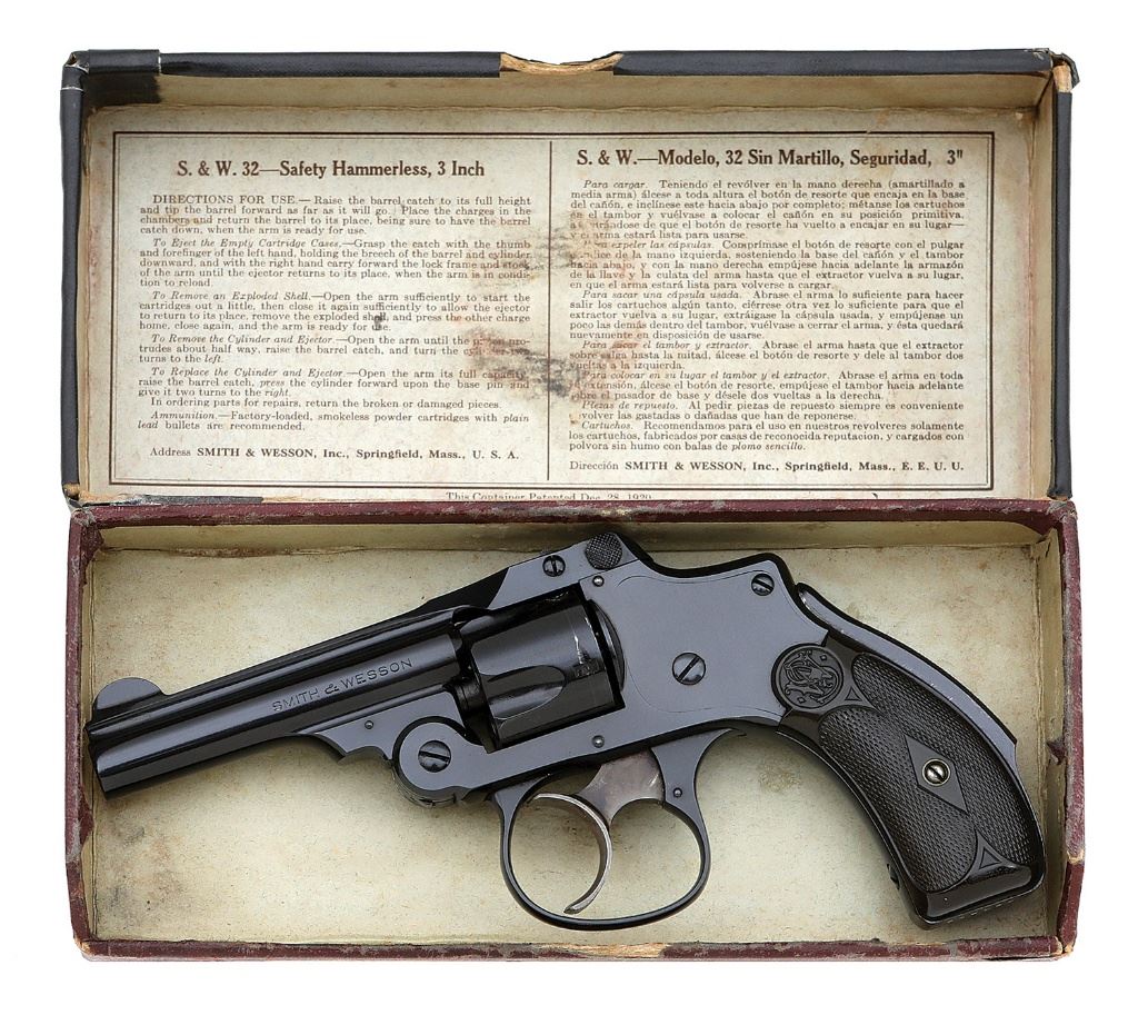 serial #232023, 32 S&W, 3'' barrel with a bright excellent bore. This Fifth Model remains in excellent condition, retaining 99% original blue showing minimal turn ring with only perhaps a scattered light handling mark or two and some scant silvering around the edges of the muzzle, and the trigger has toned to a smoky case-hardened patina. The checkered hard rubber grips remain excellent, showing some mild discoloration under direct light and little if any handling wear. Timing and lockup appear sound, ejector function remains robust, and the grip safety functions as it should. Included is the original hinged maroon cardboard box, correctly labeled to the gun, which shows some period tape repairs and light mottling but remains very good plus overall. A lovely and high-condition Fifth Model. (26A10826-247) {C&R} [Dr. W. Lloyd Hudson Jr. Collection] (1000/1500)