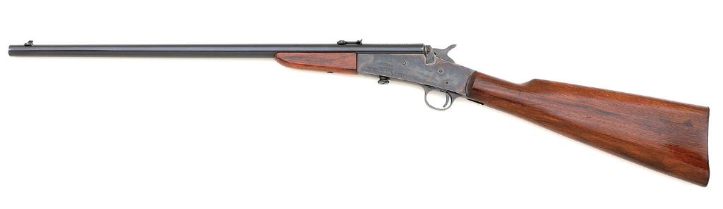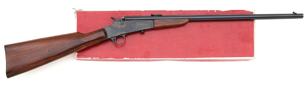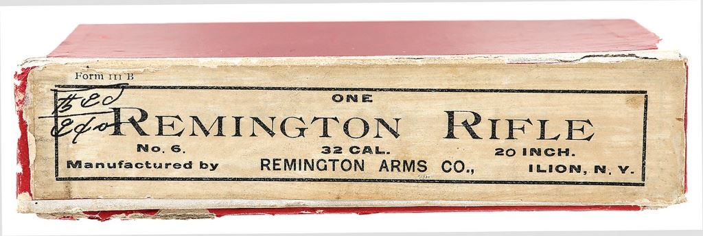 serial #457160, 32 RF, 20'' round barrel with a bright excellent, perhaps even unfired, bore. This lovely rifle comes in its original factory box, with end label that matches the configuration precisely. The barrel retains about 97-98% original blue, with loss due to some even fading with extremely light wear at the muzzle and breech. The frame retains 98-99% original vivid color case-hardening, as-does the pivoting breech block. The hammer retains darker case-hardened color while the trigger shows all its original gray-blue. The smooth walnut buttstock and scant forend rate excellent with all of their original varnish, showing a handful of minor handling marks here and there. The circled ''Remington UMC'' trademark buttplate retains nearly all its original blue showing only light wear at the heel and toe. The red two piece boxed rates very fine. The bottom shows a couple very light scuffs to the paper covering, with a couple of wear marks and scuffs on the interior but remains very solid. The lid is similar showing perhaps a bit more scuffing and wear along the edges with a fine condition printed label in black ink on buff colored paper, along with a bit of antique ink pen writing along its left edge. The interior has the factory ''Instructions for No. 6 Remington Rifle'' label centered on the lid and is mostly present with about 3'' piece missing from the lower left corner. The underside of the box is pencil marked ''gap / 3.25''. A beautiful investment-grade No. 6 falling block which appears to have seen very little if any use since leaving Ilion. (10C11696-3) {C&R} (1500/2000)