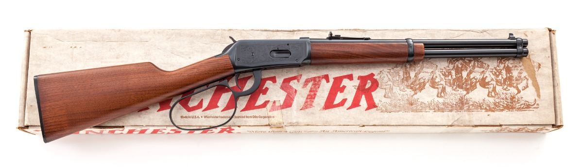 Experimental Prototype Winchester Model 1894 Large Loop Lever Action Carbine, #EXP22314, .30-30 cal., 16'' barrel, blue finish, wild game roll engraved receiver flats, walnut stock, pre-dates crossbolt safety, with saddlering, standard frame, and Winchester leather sling. Condition is excellent, appearing as new and unfired, in original white/red box with no paperwork. Box shows minor tatters and tape residue. Est.: $1,800-$2,400. (Modern)