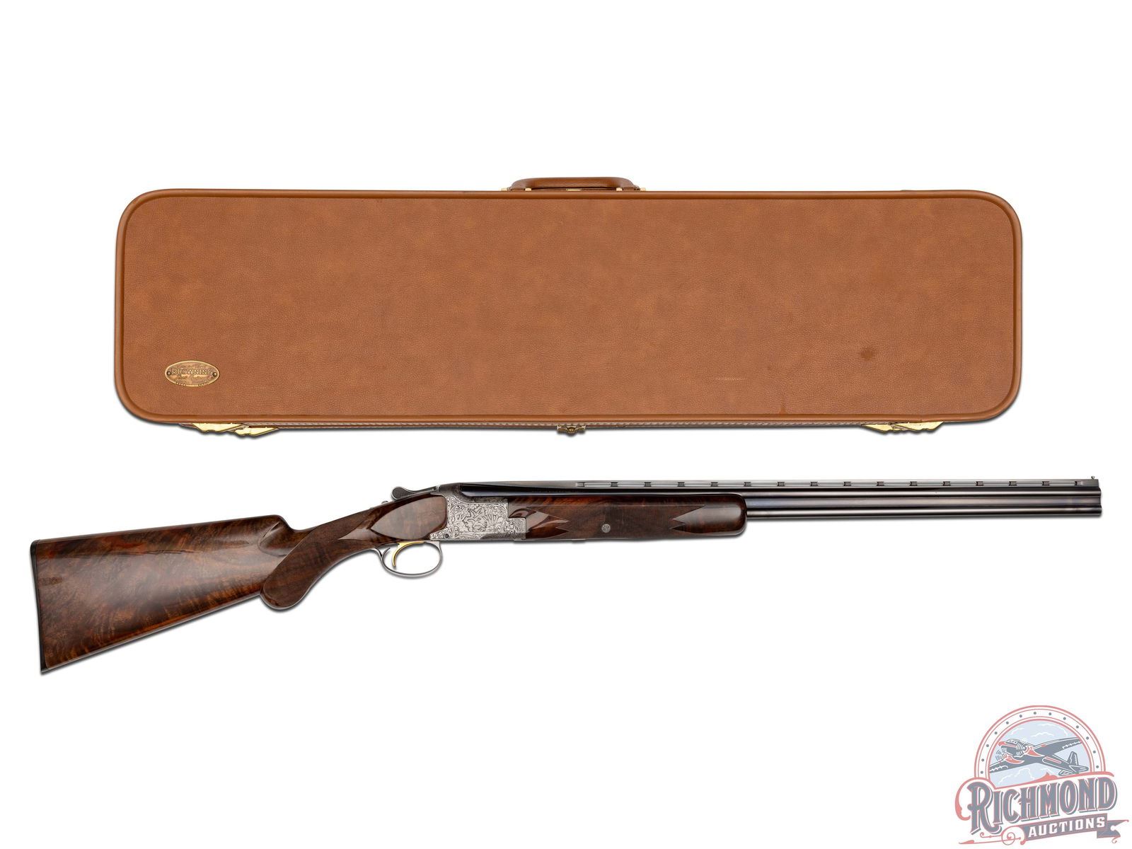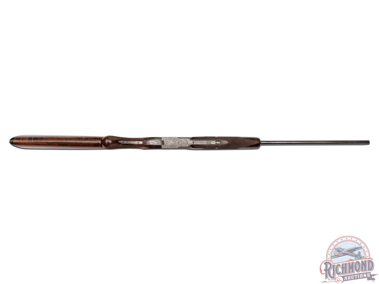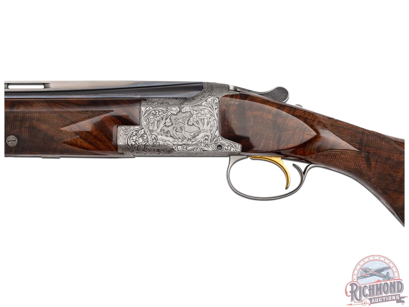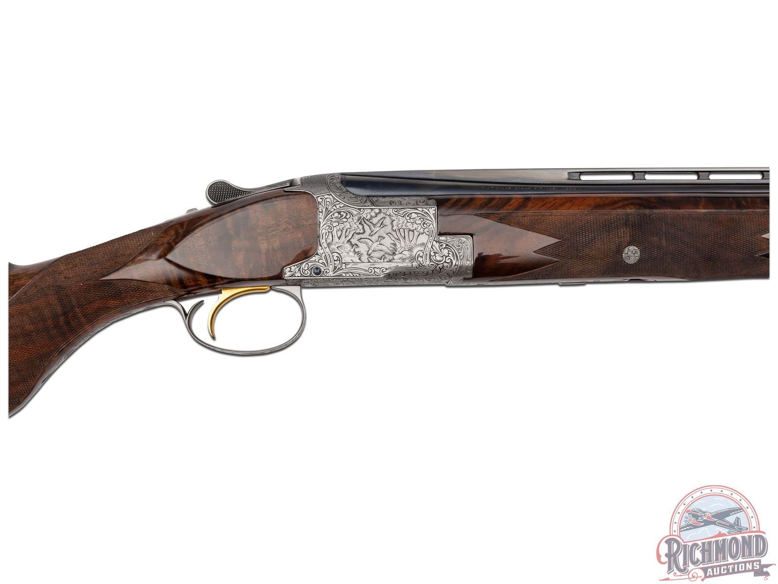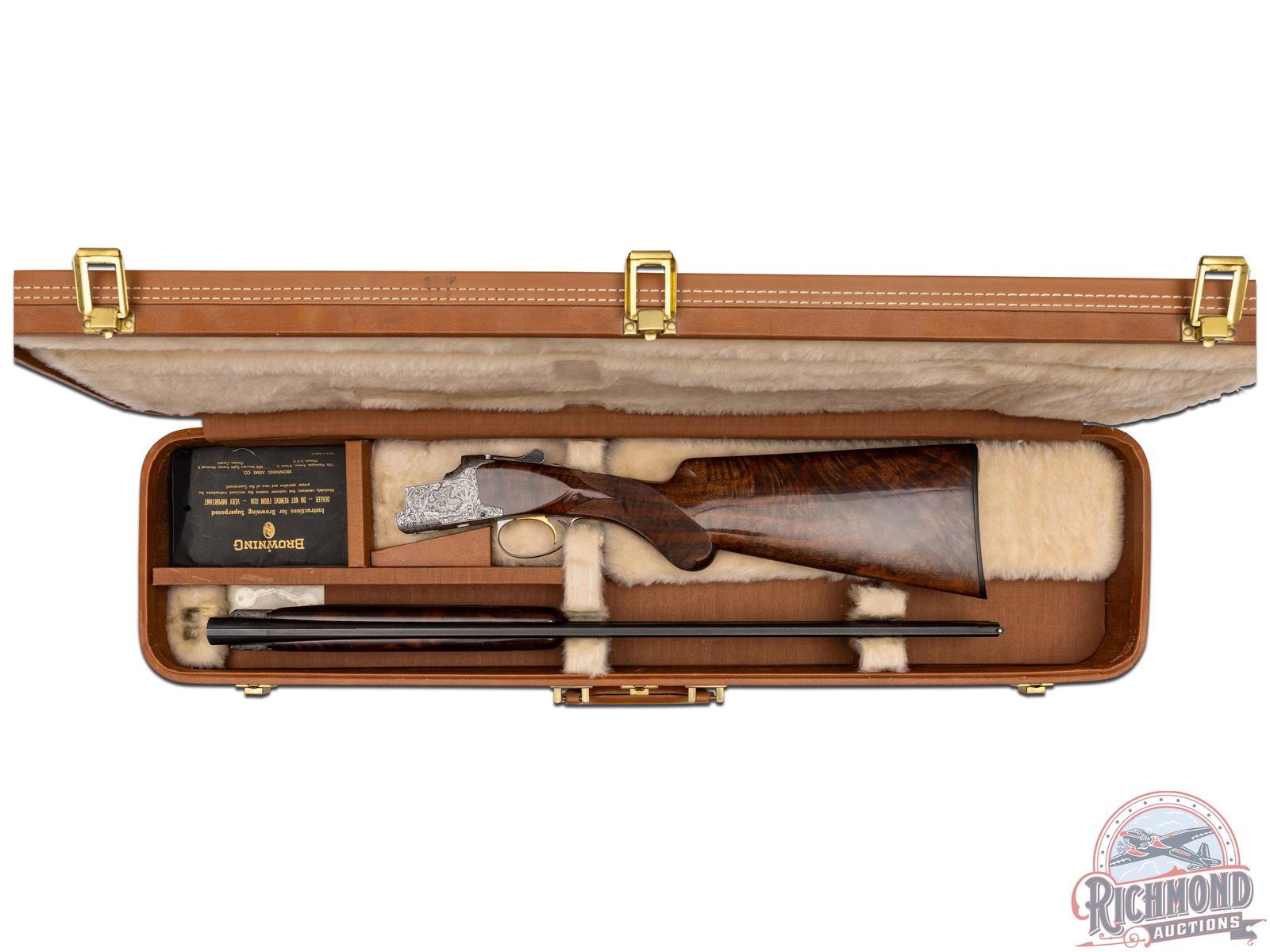 Made in Herstal, Belgium by Browning in 1969. 26-1/4" blued Special Steel barrels in desirable 410 caliber with ventilated rib, bead front sight, ejectors, 3" chambers, Browning Arms Company marking with Modified and Improved cylinder chokes. Satin finished floral engraved receiver with four ducks scene on right and engraver's signature "L. Acampo" Left side has five pheasants scene with bottom having two quail and trigger bow with 2 standing rabbits. Action is fitted with gold washed single trigger and top tang safety with barrel selector. Sectect high lustre finish walnut checkered round knob long tang pistol grip stock with "Browning" hard rubber butt plate. Matching attached checkered sporting style forearm with latch release. Comes in factory Browning luggage trunk case with original paperwork. LOP: 14-1/4". DAC: 1-1/2". DAH: 2". CALIBER: 410. S/N: 3028J69. FFL STATUS: Curio & Relic.