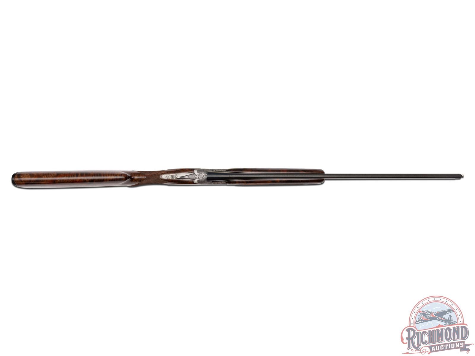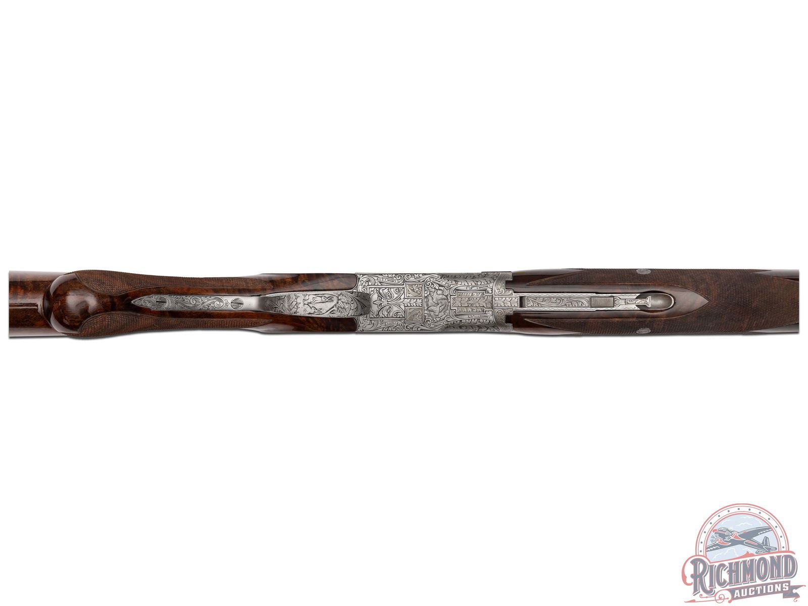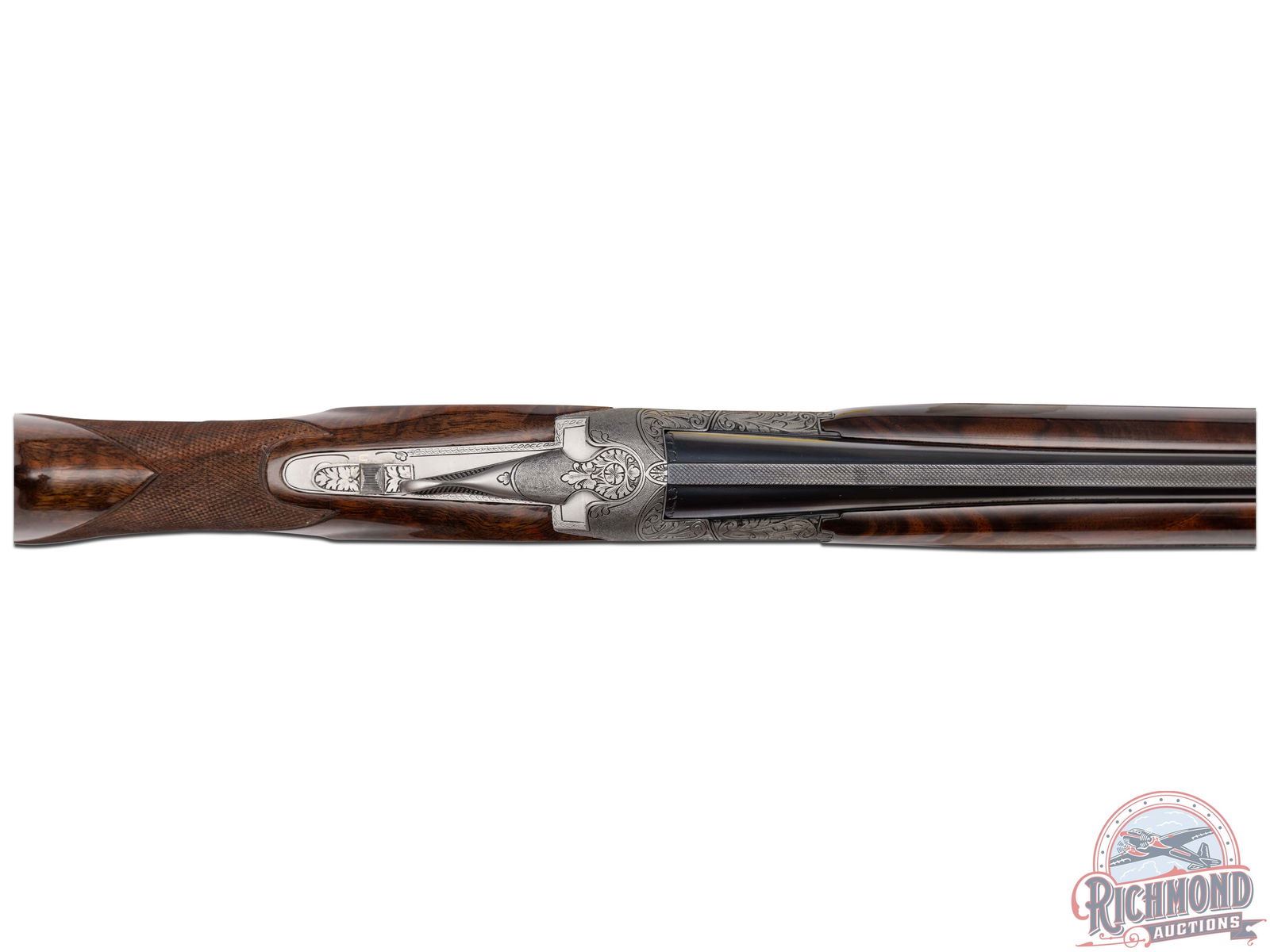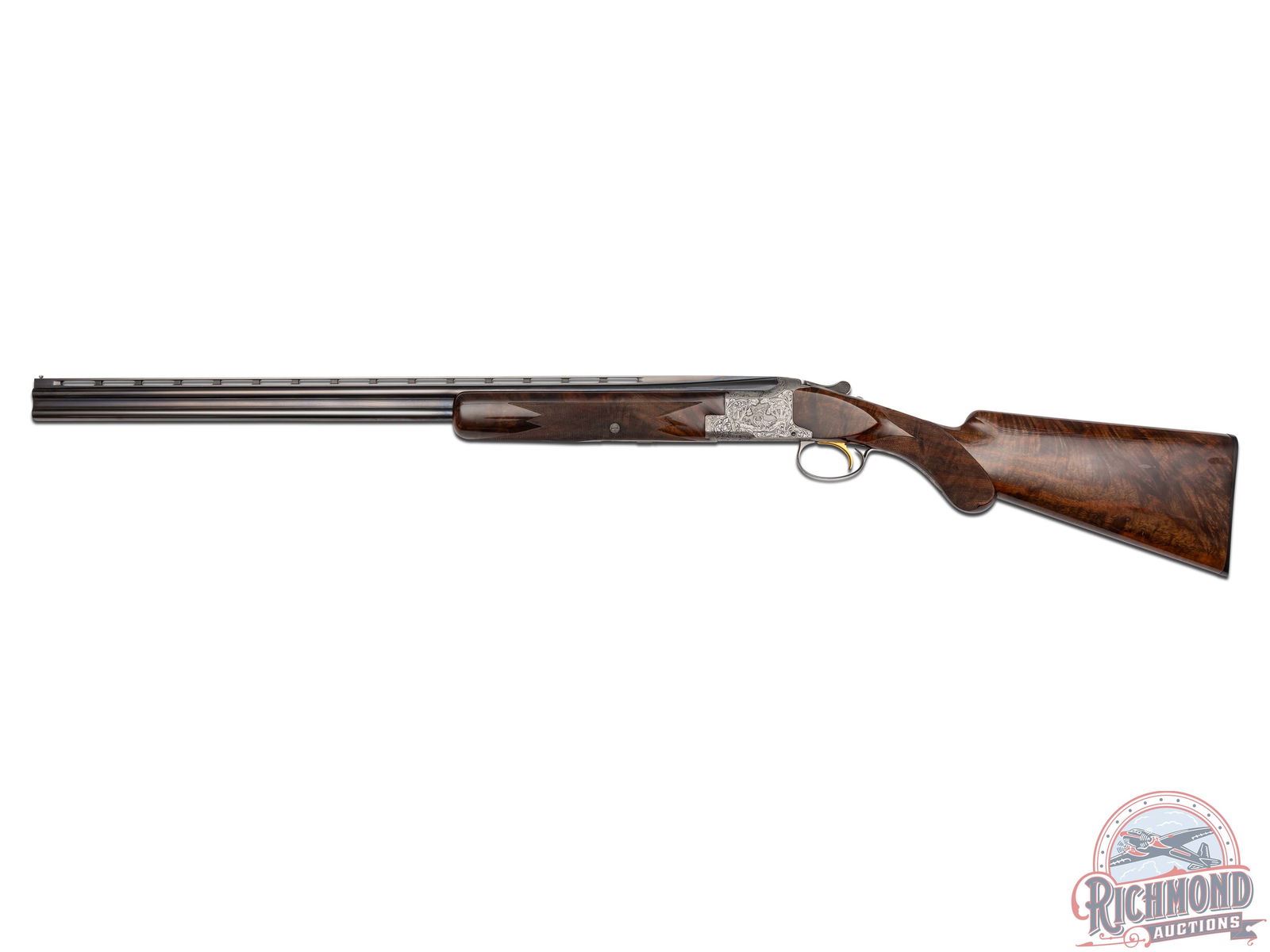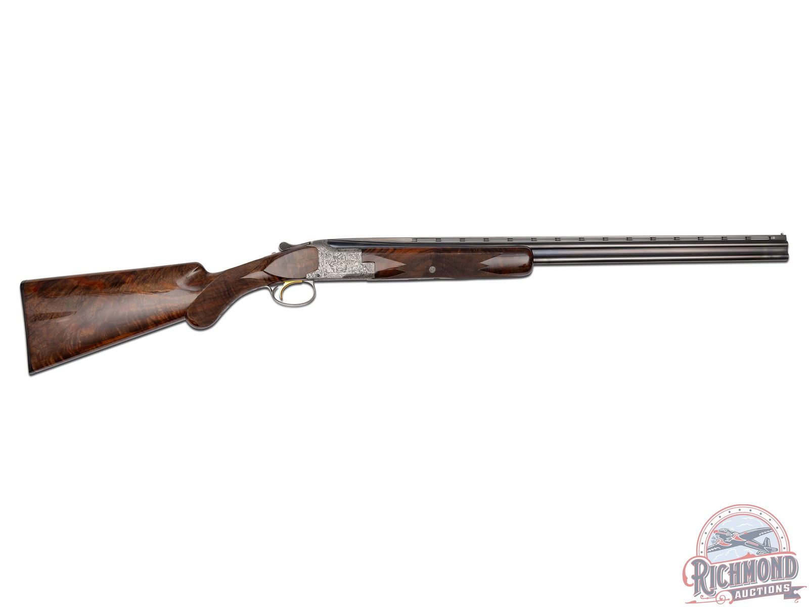 Made in Herstal, Belgium by Browning in 1969. 26-1/4" blued Special Steel barrels in desirable 410 caliber with ventilated rib, bead front sight, ejectors, 3" chambers, Browning Arms Company marking with Modified and Improved cylinder chokes. Satin finished floral engraved receiver with four ducks scene on right and engraver's signature "L. Acampo" Left side has five pheasants scene with bottom having two quail and trigger bow with 2 standing rabbits. Action is fitted with gold washed single trigger and top tang safety with barrel selector. Sectect high lustre finish walnut checkered round knob long tang pistol grip stock with "Browning" hard rubber butt plate. Matching attached checkered sporting style forearm with latch release. Comes in factory Browning luggage trunk case with original paperwork. LOP: 14-1/4". DAC: 1-1/2". DAH: 2". CALIBER: 410. S/N: 3028J69. FFL STATUS: Curio & Relic.