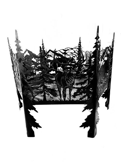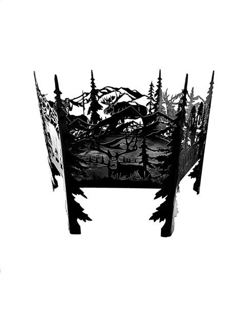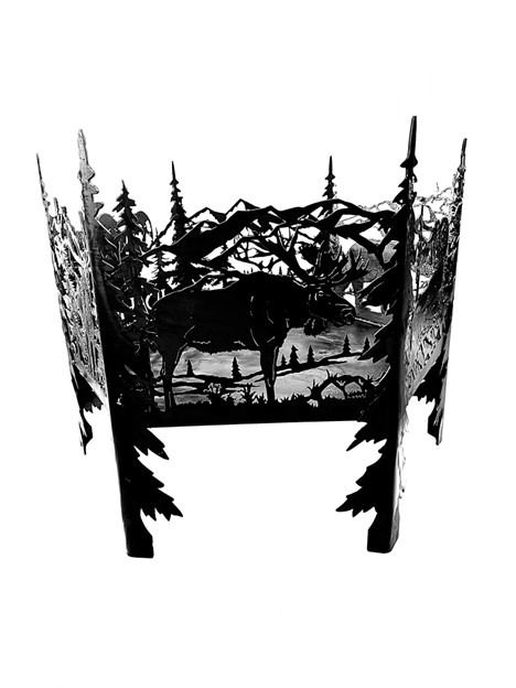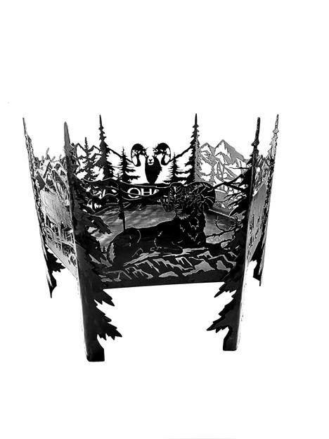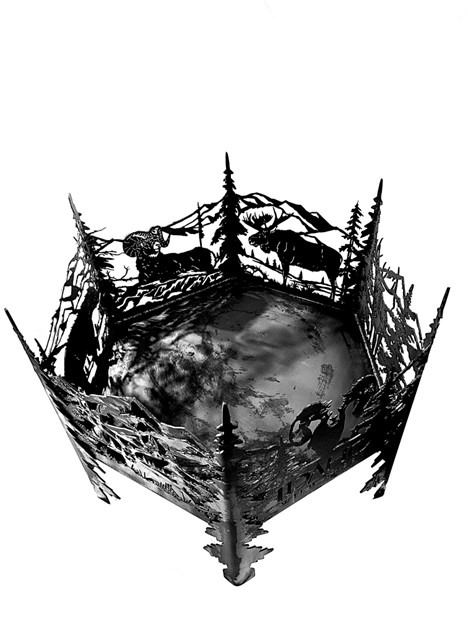 One-of-a-kind custom metal fire pit with the Idaho WSF logo, a bighorn sheep, elk, bear, deer and a moose.