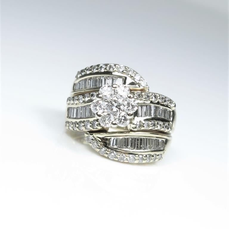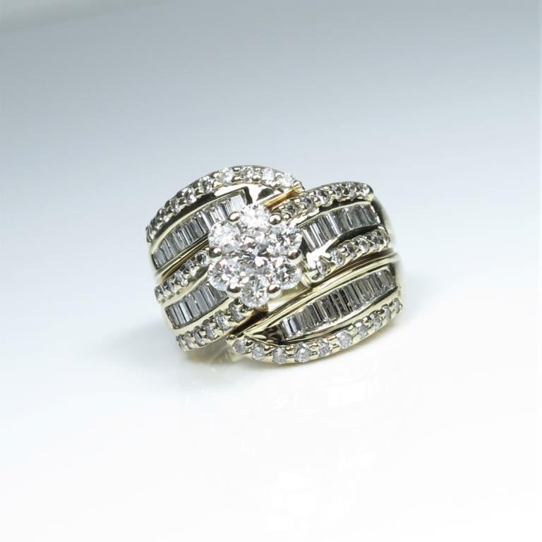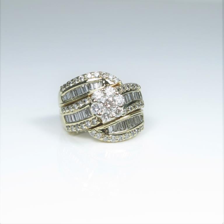 Exquisite Diamond Ring featuring 77 ‘IDEAL’ cut round and baguette cut Diamonds weighing approx. 2.25-2.50 carats with G-H colors and VS/SI clarity set in a labor intensive 14 karat yellow gold setting. Retail $4,500-$6,000