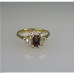 Approx. 0.75 carat FINE Emerald cut Ruby surrounded by 14 baguette and round cut Diamonds weighing approx. 0.70 carats total with G-H colors and VS clarity set in 18 karat yellow gold.