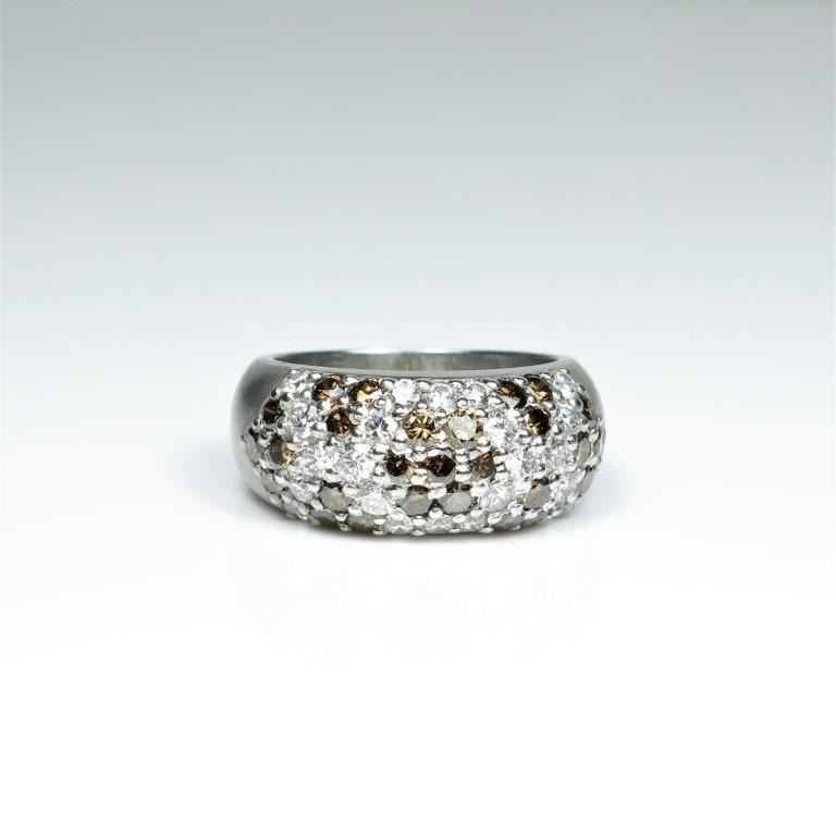 Exquisite Platinum White and Chocolate Diamond Ring featuring 26 pave set ‘IDEAL’ cut white Diamonds weighing approx. 1.00 carat with F-G colors and VS/SI clarity and 27 ‘IDEAL’ Fine chocolate Diamonds weighingapprox. 1.30 carats total Diamond weight 2.30 carats set in 15.5 grams of Platinum. High Quality Piece. Retail $5,000-$6,000 Estimates $3,000-$4,000