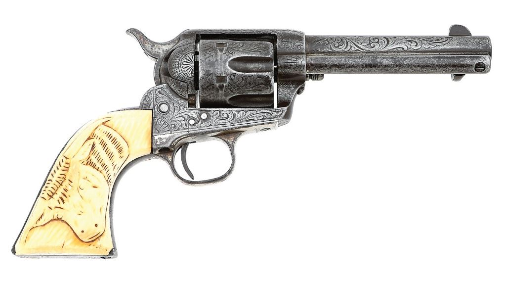 serial #123494, 45 Colt, 4 3/4'' barrel with a good plus bore showing wear and scattered light pitting but rifling is quite strong throughout. This revolver is one of only 89 factory engraved revolvers produced in 1887 and one of only 11 that were assembled and shipped with carved ivory grips. Adding to this already rare and desirable revolver is the fact that it was part of a 2-gun shipment to E.J. Post and Company in Albuquerque. The engraving on the revolver is in quite full coverage with unusual 1/4 fan designs on each side of the frame and with barrel engraving extending to the front sight. The revolver shows intertwined zigzag patterns along the backstrap and ejector rod housing. The left side of the recoil shield along with the loading gate show sunburst motifs as does the top of the backstrap. The triggerguard shows no engraving and appears to be a period replacement with serial number engraved to match. The natural patina on the triggerguard matches the balance of the revolver perfectly and it appears period in all respects. The metal surfaces of the revolver show a rich gray brown patina with engraving remaining quite strong and with the two-line barrel address full legible. The barrel address is bordered in Nimschke style intertwined double line border with punch dot accents. There are traces of dull original nickel plated finish in protected areas such as the spine of the hammer and bottom surface of the ejector rod housing. The triggerguard shows a bit more of the same dull nickel plated finish with exposed areas bearing a rich, natural brown patina. The two-piece ivory grips are relief carved on the right side with a steer head motif which shows light wear and has a wonderful appearance. The grips show age cracks on the butt and show a lovely yellow patina with a tiny chip at the toe of the right grip. The gun includes two factory letters dated January 1983 and December 2014 both confirming the configuration, engraving, carved ivory grips and shipment to E.J. Post on September 9, 1887. Guns shipped to the southwest in the late 19th century typically show hard use, this revolver was clearly well-carried but also well-cared-for showing honest wear from its days in the often-dangerous New Mexico Territory. While examining this wonderful Single Action revolver you can't help but find yourself wondering what stories it could tell. A fabulous, very honest and extremely rare relic of the American Southwest. (1E11523-118) {ANTIQUE} [Jim Thrash Collection] (15,000/25,000)