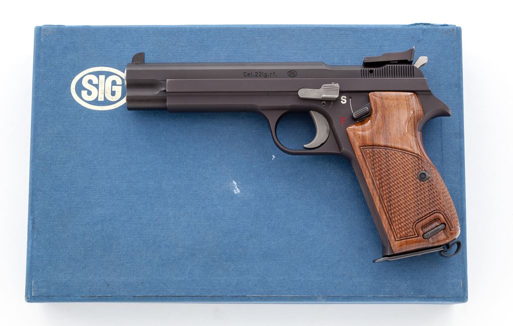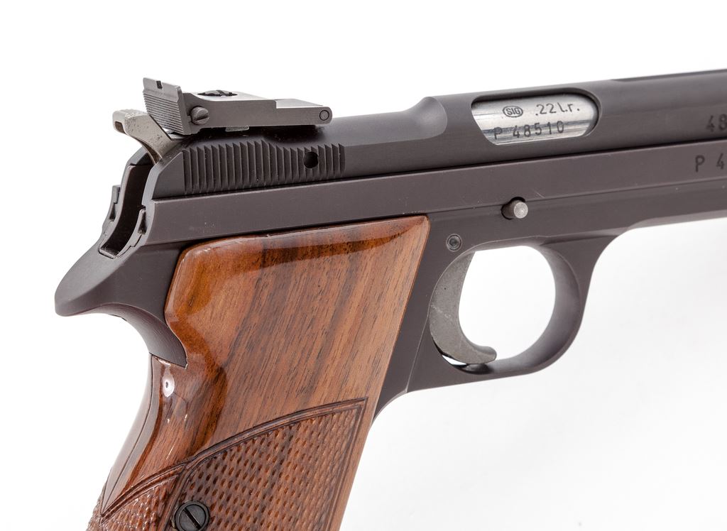 Extremely Rare Sig P210-7 Semi-Automatic Pistol, #P48510, .22 LR cal., 4.75'' barrel, blue finish, gloss-finished two-piece checkered walnut grips, tall blade front sight, fully adjustable rear sight, with one magazine. Lower left side with lanyard bar. In original blue one-piece box that is numbered to the gun, with owner's manual, SIG patch, test target, additional pair of checkered black plastic grips, and other misc. factory paperwork. Right side of barrel, frame, and slide with matching numbers; slide number does not include the ''P'' prefix. Barrel is also marked with ''SIG'' logo and ''.22 Lr.'' Left side of slide is marked ''Cal.22lg.rf.'' with ''SIG LOGO''. Approx. 99% original finish remains and pistol rates as excellent and appears near new overall. Finish with a normal light arch at the slide stop and safety, otherwise showing only a few slight handling marks. Wood grips retain all of their finish and appear as new. All factory lettering is sharp. Action is extremely smooth with a bright bore. Interior foam portion of lid has separated at the seam but is present; top and bottom piece of foam both show some deterioration. Box exterior shows normal light storage wear. Extra grips rate as excellent. A rare opportunity for the Sig or Swiss arms collector. Est.: $5,000-$7,000. (Modern/PPT)