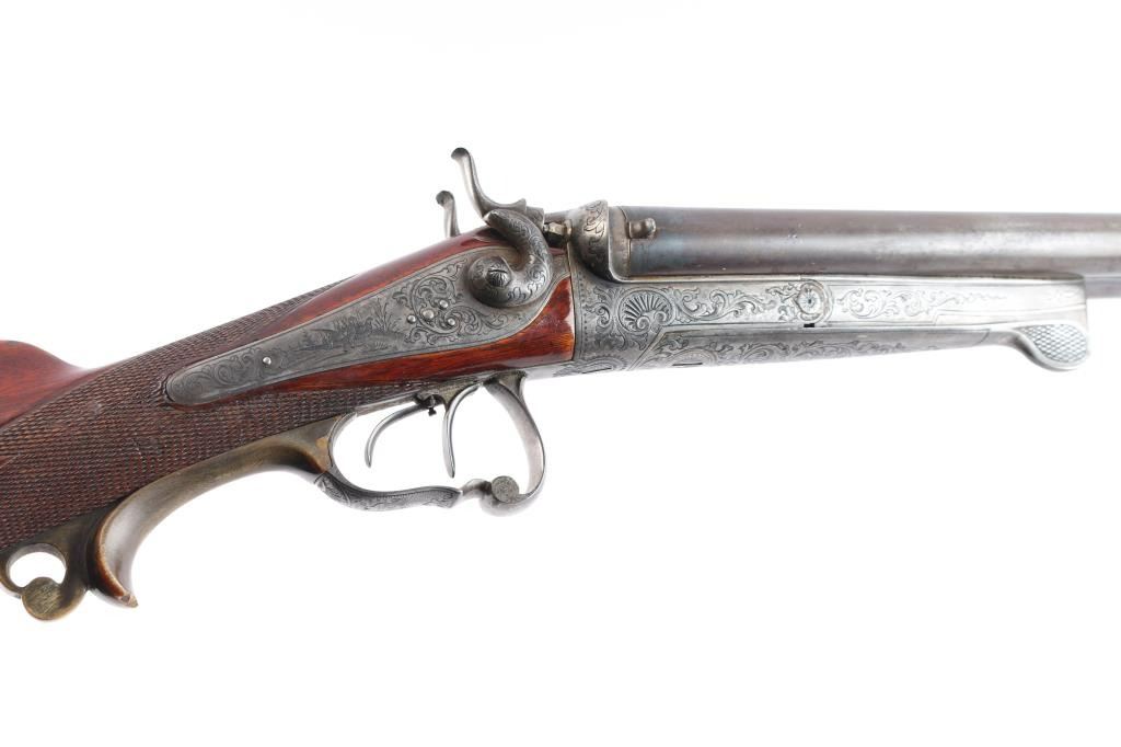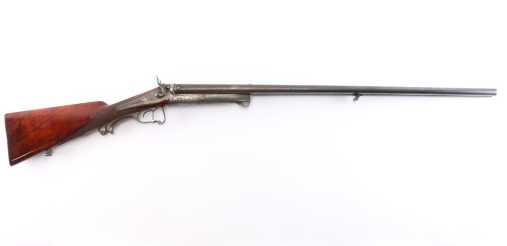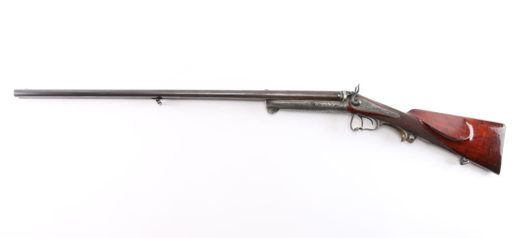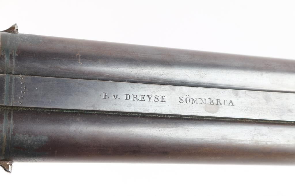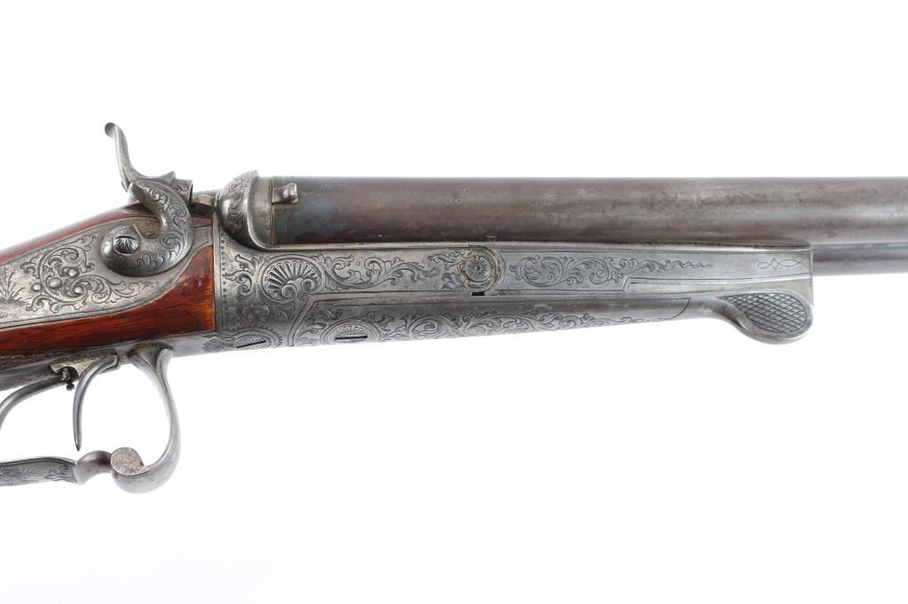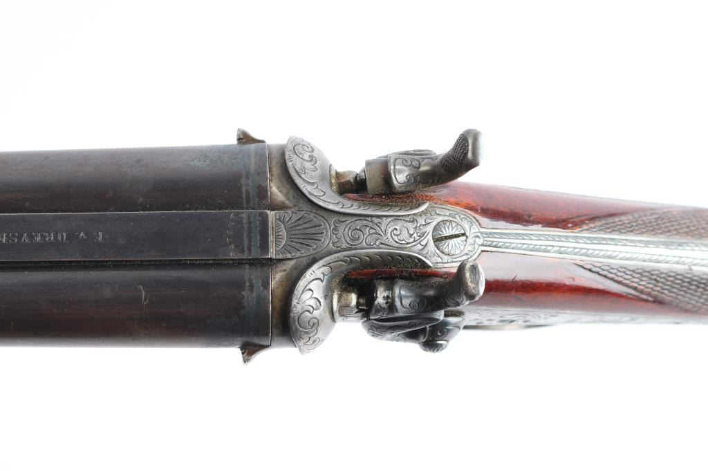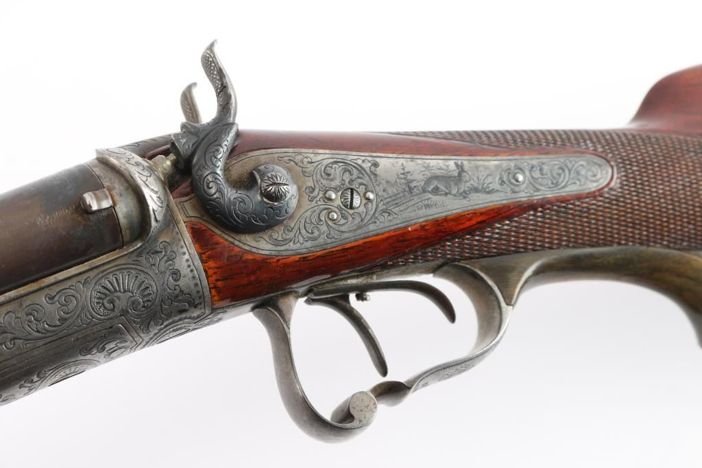 #17599. Engraved double barrel pin-fire hammer gun based on the Le Faucheaux system. Patented by Casimir Lefaucheux in 1835. Made in Sommerda, Germany (Prussia) by Franz Von Dreyse circa 1870. The son of the famous inventor of the Prussian needle fire rifle M/41 Nikolaus von Dreyse. Franz v. Dreyse was born in 1822 and died in 1894. 30 1/4" barrels with dovetailed German silver low-profile front sight blade, flip v-notch rear sight, double set triggers, exposed hammers, bottom lever break-top, one-piece walnut stock with checkered and carved straight wrist, scrolled,carved horn guard behind the ornate triggerguard, shadow line cheekpiece (right-handed shooter) steel buttplate with scroll engraving around the mounting screws, sling swivels. The lock plates, 'rabbit ear' hammers, triggerguard and the metal forearm are fully engraved with intricate floral/scroll designs with pheasants on the right lock, rabbit on the left and hunting dog on the triggerguard. Maker marked on the solid rib. The bores are very good/bright, mechanically excellent, barrels lock-up tight, the barrels have turned a brown patina, the engraving is crisp with fine detail, the wrist checkering is fine, there is a couple of minor chips in the horn and the stock is very good with minor chips/dings, has been varnished at some point. LOP is 14", chokes measure IC.
