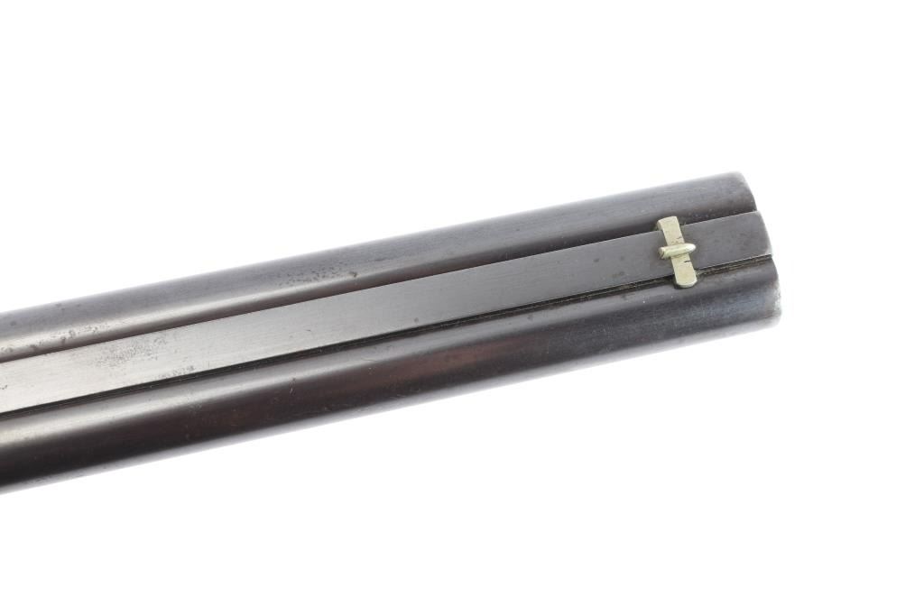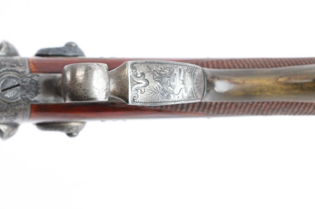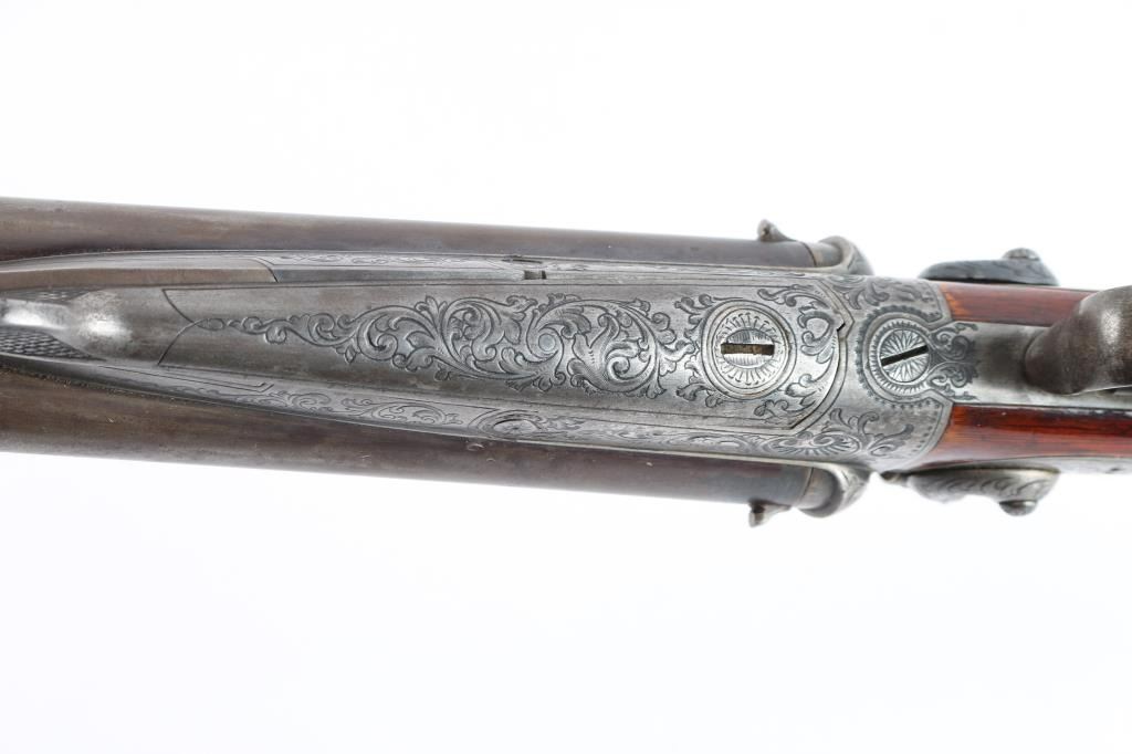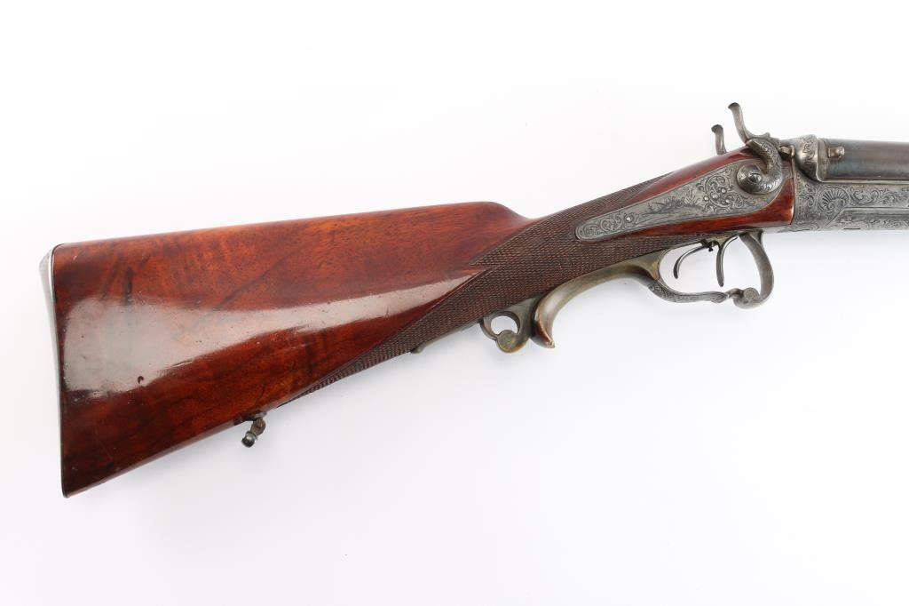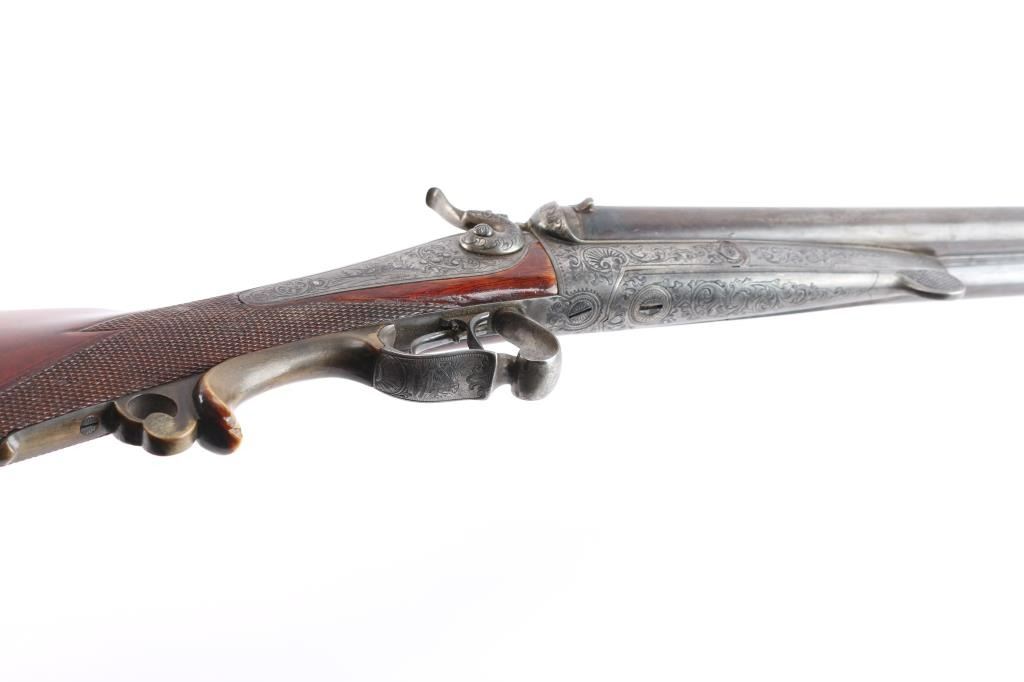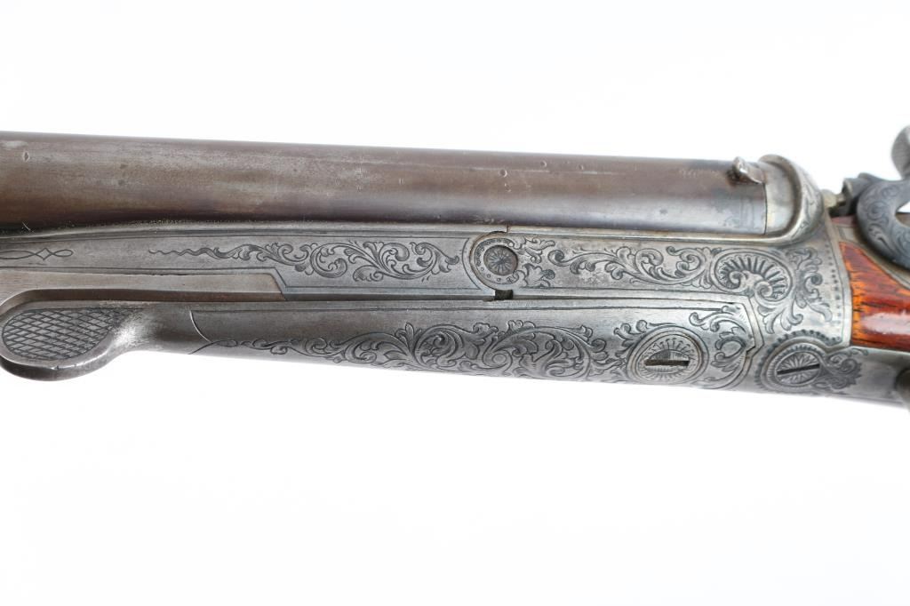 #17599. Engraved double barrel pin-fire hammer gun based on the Le Faucheaux system. Patented by Casimir Lefaucheux in 1835. Made in Sommerda, Germany (Prussia) by Franz Von Dreyse circa 1870. The son of the famous inventor of the Prussian needle fire rifle M/41 Nikolaus von Dreyse. Franz v. Dreyse was born in 1822 and died in 1894. 30 1/4" barrels with dovetailed German silver low-profile front sight blade, flip v-notch rear sight, double set triggers, exposed hammers, bottom lever break-top, one-piece walnut stock with checkered and carved straight wrist, scrolled,carved horn guard behind the ornate triggerguard, shadow line cheekpiece (right-handed shooter) steel buttplate with scroll engraving around the mounting screws, sling swivels. The lock plates, 'rabbit ear' hammers, triggerguard and the metal forearm are fully engraved with intricate floral/scroll designs with pheasants on the right lock, rabbit on the left and hunting dog on the triggerguard. Maker marked on the solid rib. The bores are very good/bright, mechanically excellent, barrels lock-up tight, the barrels have turned a brown patina, the engraving is crisp with fine detail, the wrist checkering is fine, there is a couple of minor chips in the horn and the stock is very good with minor chips/dings, has been varnished at some point. LOP is 14", chokes measure IC.