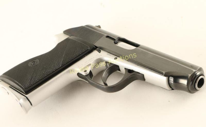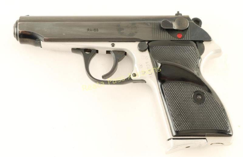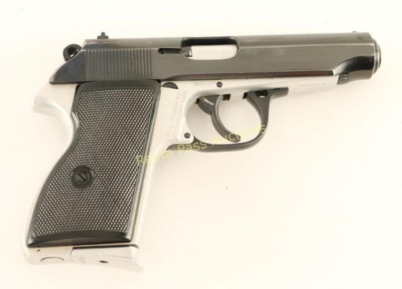Hungarian made compact double-action semi-automatic pistol chambered in 9x18mm Makarov. Imported by C.I,A. of Georgia, V.T. with marks on the frame. Features a dual tone finish with blued steel slide & brushed alloy frame, 4" barrel, fixed patridge front sight, dovetailed rear window sight, serrated trigger, serrated round hammer spur, thumb safety, push button magazine release, 7 round magazine, and two-piece checkered black plastic grips with a thumb rest on the left side. Pistol retains approximately 92% of it's blued finish showing light holster wear, few handling marks and few specs of surface rust observed on the right side of the slide behind the rear sight. Action performs well, bore is excellent and plastic grips are fine. Condition is very good+. ***Modern Firearm***