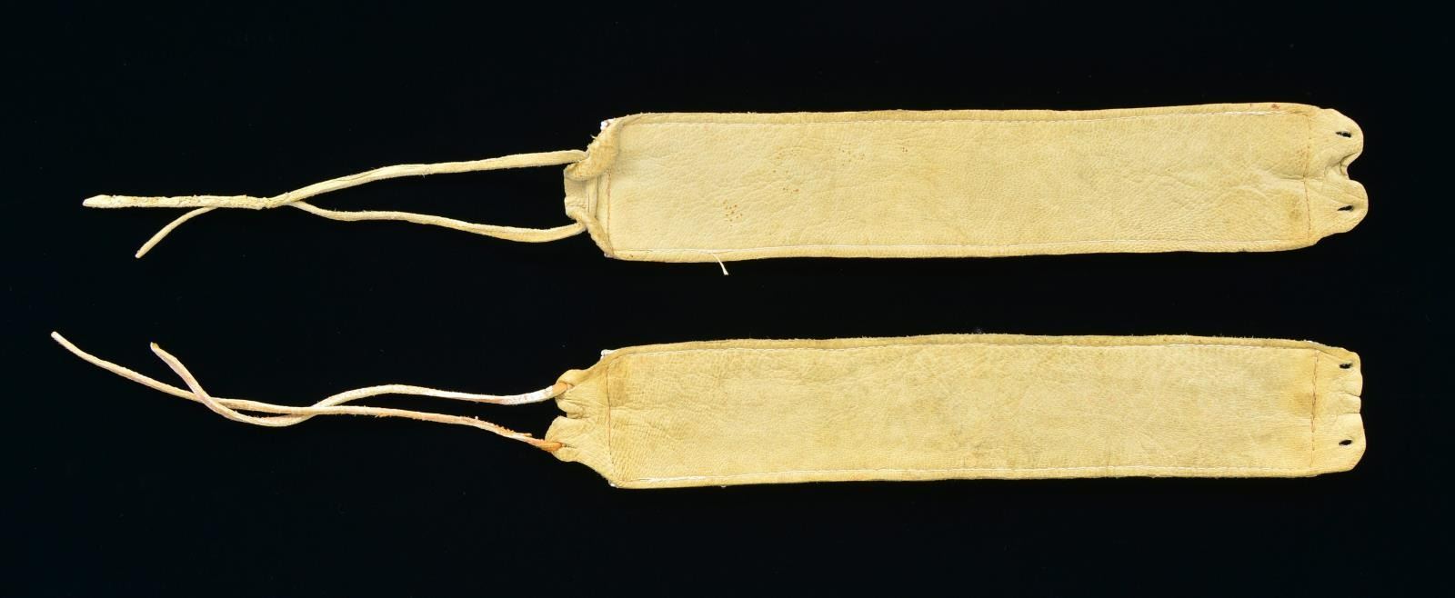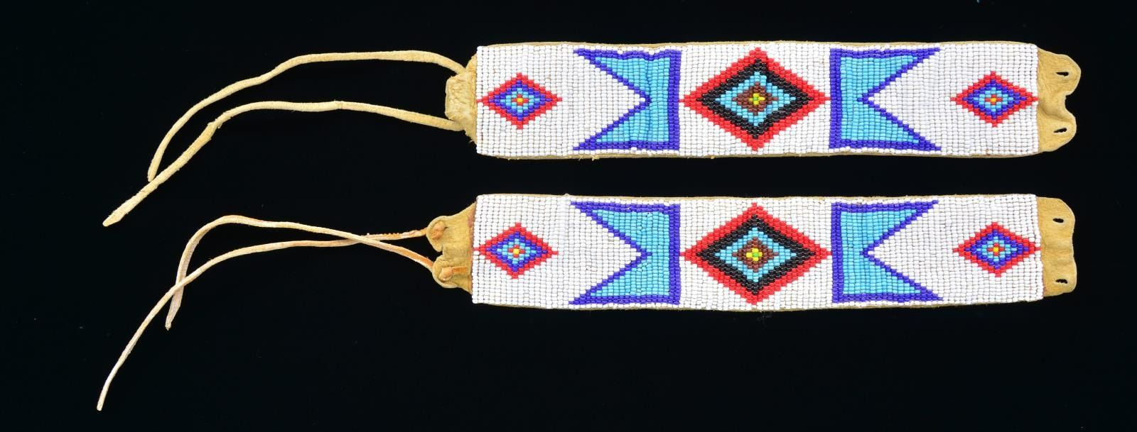 1-2) FINE PAIR AMERICAN INDIAN BEADED ANKLETS. Each is 9.5" x 2" multicolor beads on white bead ground. CONDITION: very good to fine overall. (02-17015-5/JS). 3-4) PAIR OF AMERICAN INDIAN BEADED BRACELETS. Each about 10" around, geometric design w/ multicolor beads on sky blue ground. CONDITION: good overall, one bracelet missing stitching where canvas backings meet. (02-17015-6/JS). 5) AMERICAN FLAG BEADED INDIAN HAT BAND. Made for a Stetson or similar, about 22" diameter, American flags alternating with geometric design, sinew & cord sewn with earlier white heart red beads. Very unusual and presents well. CONDITION: fair to good, 1/2" area of loss and torn sinew, still sound. (02-17015-8/JS). 6) ARMBAND OF CHIEF BARNIE OLSON, MINOT NORTH DAKOTA. Red, blue & yellow beads on white bead ground. Sewn cloth tag “BARNIE OLSON / MINOT ND”. CONDITION: has seen use, good overall w/ cracking on thong that holds drop. (02-17015-11/JS). 7) PAIR OF BLUE WOOL TROUSERS WITH BEADED DECORATION. Circa 1920, blue wool w/ mother of pearl button front & belt loops, patent catch, 26" x 2.75" red, yellow & blues beaded panels on white bead ground. CONDITION: fair, beaded panels complete, mothing & several holes. (02-17015-13/JS). 8) DECORATIVE AMERICAN INDIAN SHIELD. 21" diameter rawhide, painted decoration, red trade cloth trim and feathers attached, 20th century. CONDITION: very good overall. (02-17015-16/JS). $600-900.