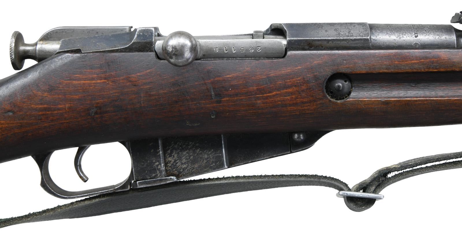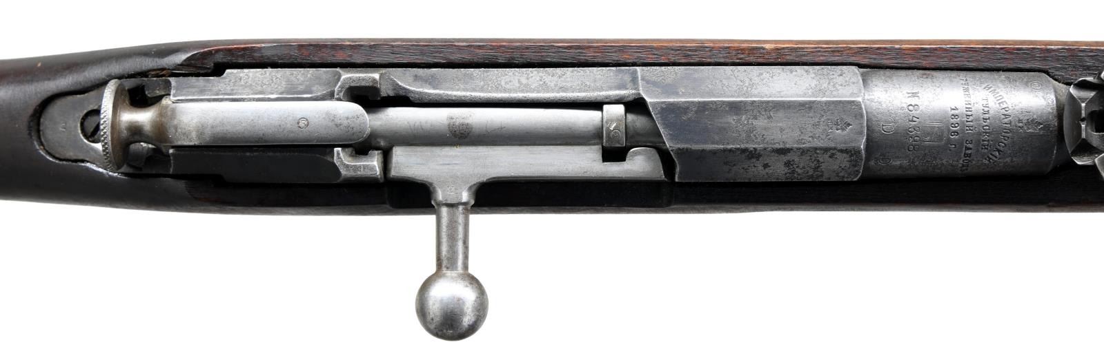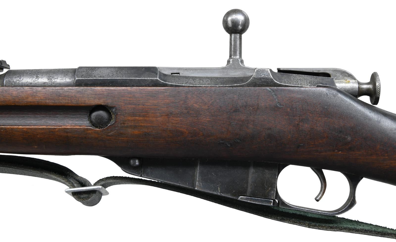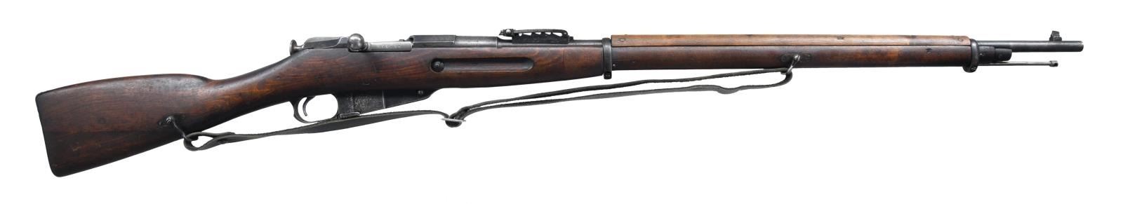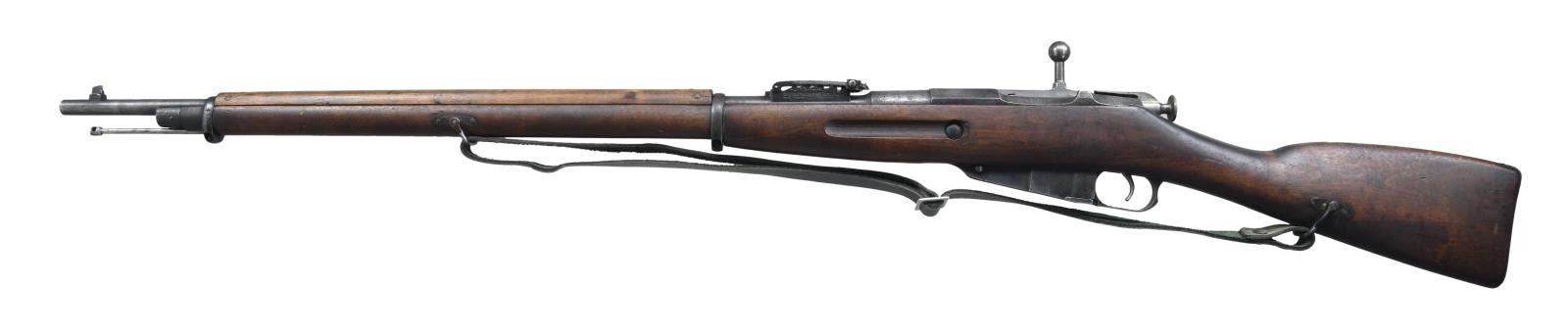 RIFLE. Cal. 7.62x54R. S# 84398. Bbl. 31 1/2". Mismatched numbers throughout. Top of bbl. has Tula markings, 1896 date, boxed Finn army "SA" stamp, serial & "D" marking for D166 round. Ladder rear sight graduated to 3200 Arshins w/ Finnish renumbering on base. Blade front sight. Finnish two-piece stock set w/ sling hangers & leather sling. Cleaning rod present. CONDITION: arsenal reworked stock set has a couple light chips near receiver, a small crack on handguard, some wear from improper band removal, scattered dings, staining & handling wear. Metal is mostly a silvery gray patina w/ a large area of dings on mag body, scattered pitting, further dings & oxidation. Good bore w/ scattered frosting but strong rifling. (01-23845/MJC). ANTIQUE. $500-700.