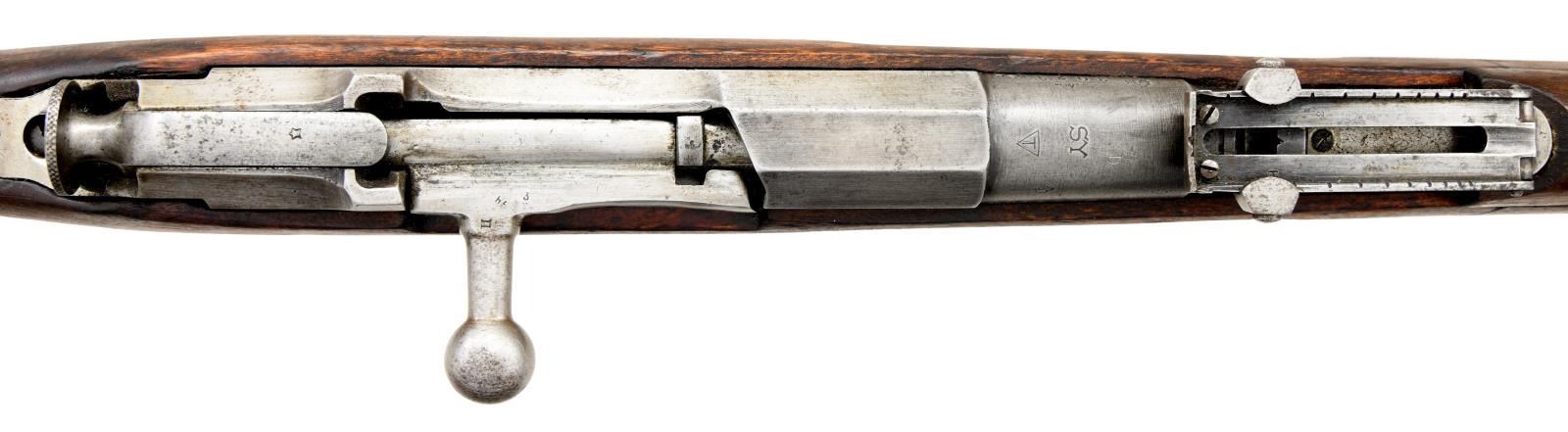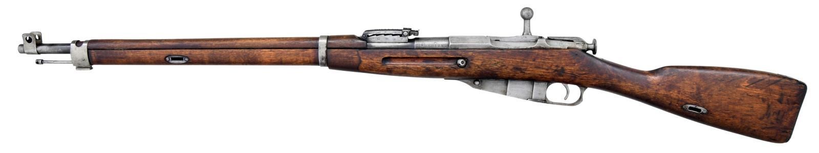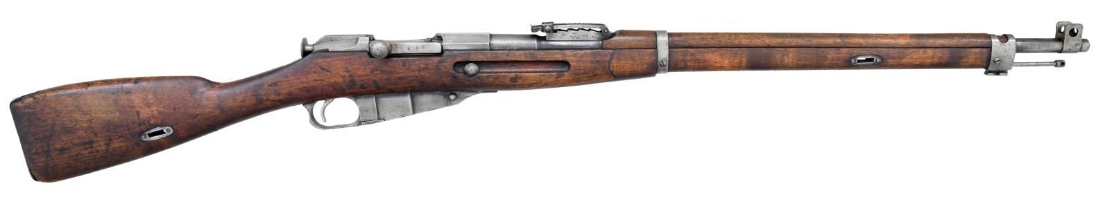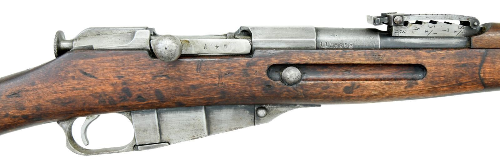 MILITARY RIFLE. Cal.7.62X54R. S#30235. Bbl. 27". Import marked on right side of barrel. Barrel is marked over chamber "SY" indicating Civil Guard issue. The barrel also has the Tikkakoski "T" in a triangle and "D" for the use of "heavy ball" ammunition. The left side of the barrel has the SAKO "gear" marking & a boxed "SA" property mark. There is also a "KE" inspection mark which are the initials for "Kosti Eakola" & are found on Tikkakoski rifles. The right side of the bbl. has 2 "S" Civil Guard acceptance marks & the S prefix Civil Guard S# s105703. The ladder rear sight has been re graduated in meters. Blade front sight w/ protective ears. Bolt has straight handle & bolt rib has been re ground & given a S# which does not match rifle. Solid upper band w/ open top & bayonet lug. Lower band is flat solid type retained by screw. The hard wood stock fitted w/ sling slots has the typical 2 piece finger joint construction. The buttstock portion has faint & legible Soviet Era markings w/ recoil bolt offset slightly, typical of Soviet practice. Buttplate has Izhevsk Arsenal "bow & arrow" marking. Cleaning rod is present. CONDITION: stock set has worn arsenal rework finish w/ staining & numerous handling marks. Buttstock has 1" crack on right side at toe; 2 sm. cracks at each end of the butt sling slot & 2 sm. cracks on the right side of the forend at the sling slot. Metal retains only traces of glue w/ wear turning gray & patina. Dark oxidized bore w/ worn rifling. (23-1094/RW). CURIO. $300-400.