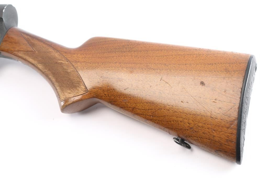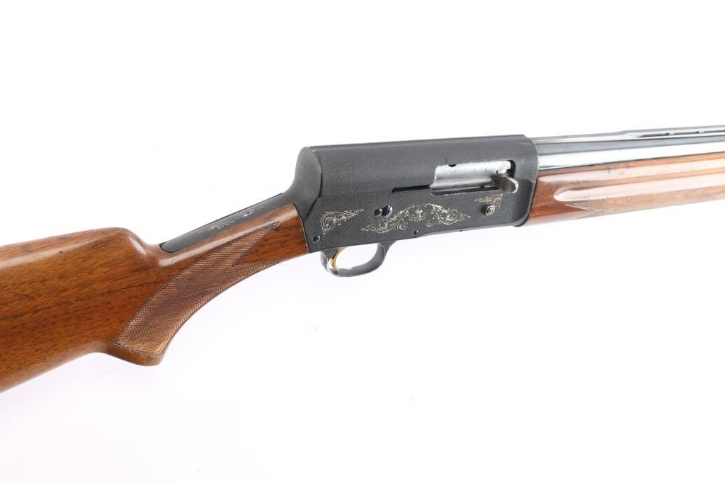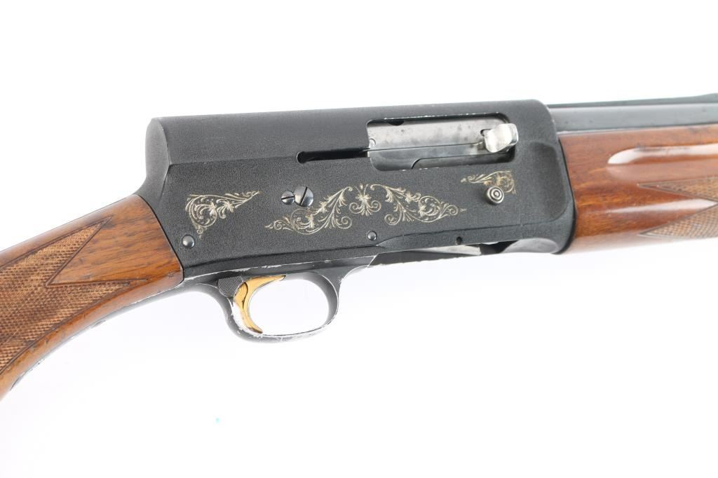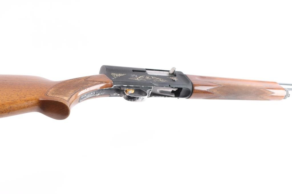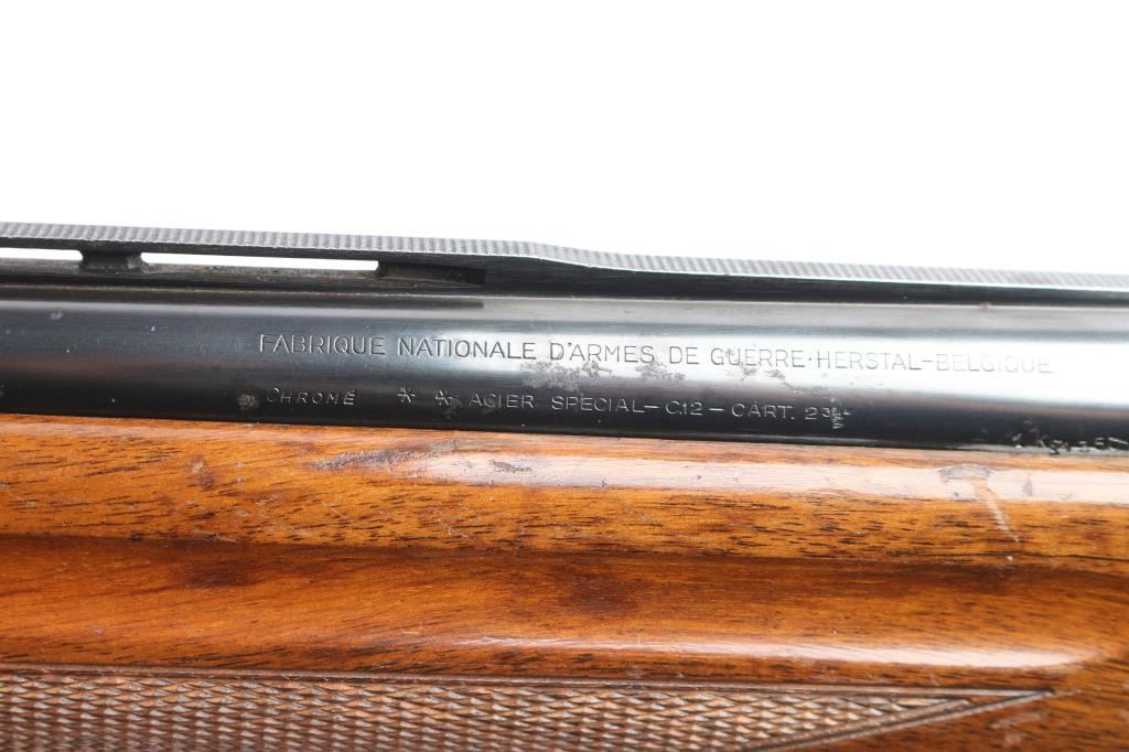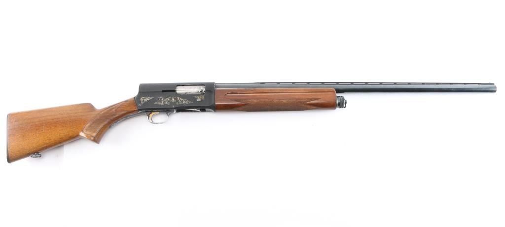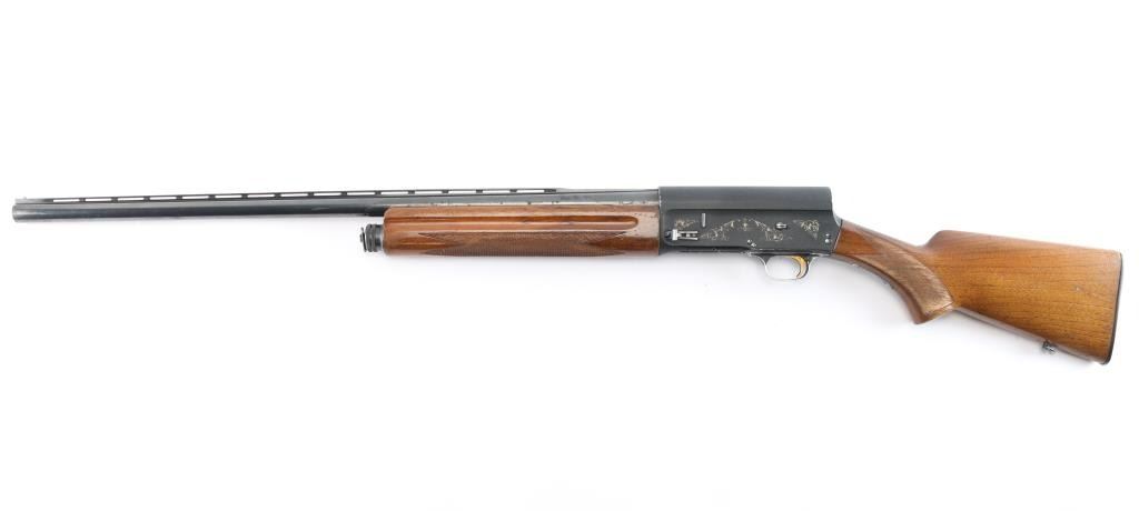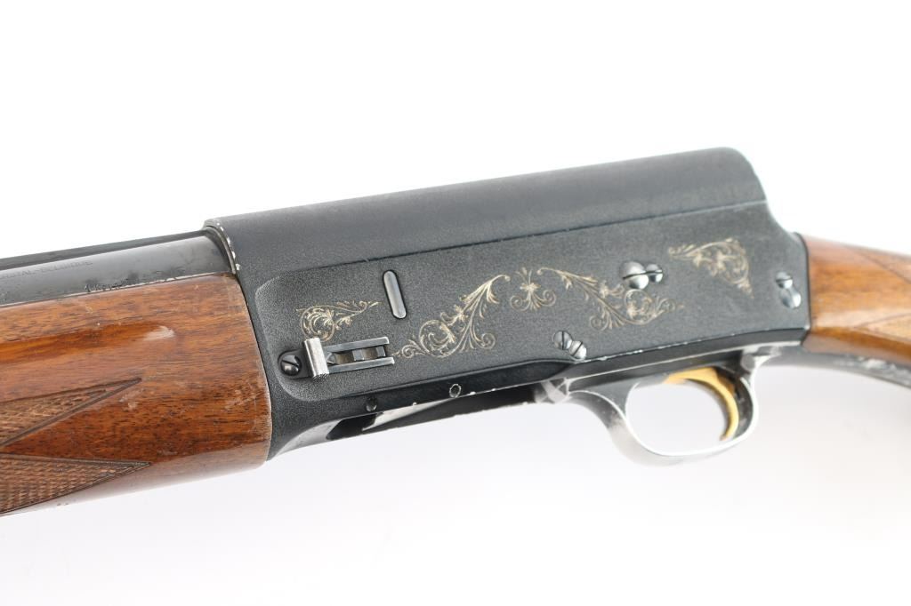 Made in Belgium by FN. No Browning markings. (FN) made Auto-5s for the European market starting in 1903 and continued until 1973. Classic Auto 5 designed by John Moses Browning. It is a standard weight semi-auto shotgun chambered for 2 3/4" 12 gauge shells. 27.1/2" blued vent rib barrel with steel bead front sight, matte black receiver, magazine cut off, alloy trigger guard, sling swivels, smooth gold toned trigger and manual safety in rear of the trigger. It has two piece wood stocks with checkering at the wrist and forearm and grasping grooves above the checkering on the forearm, Hard rubber FN buttplate. Belgium proofs, floral scroll engraving on receiver highlighted in gold tones. barrel blued metal finish is about 95% with minor scratches/edge wear, a couple of light spots of pitting on the lower left, the matte black receivers finish is mostly there with edge wear, and handling wear on the triggerguard and lower tang. Bore is excellent/bright, wood is very good sound with a few very minor scratches and some finish loss from handling. LOP is 13 3/4". Choke measures 'IM'.
