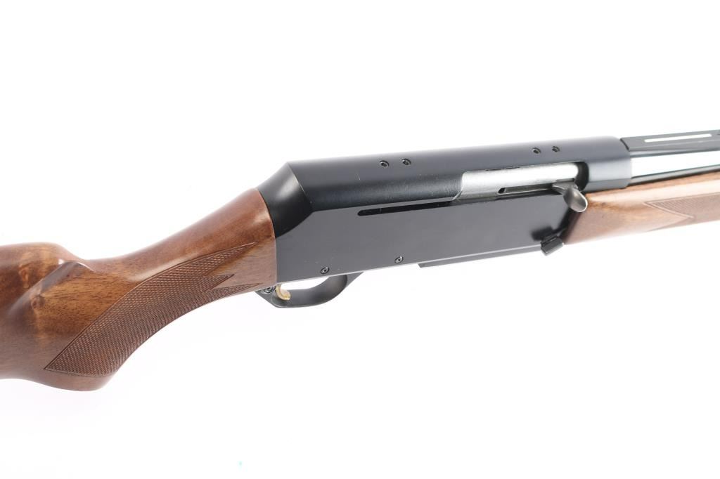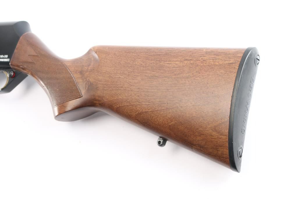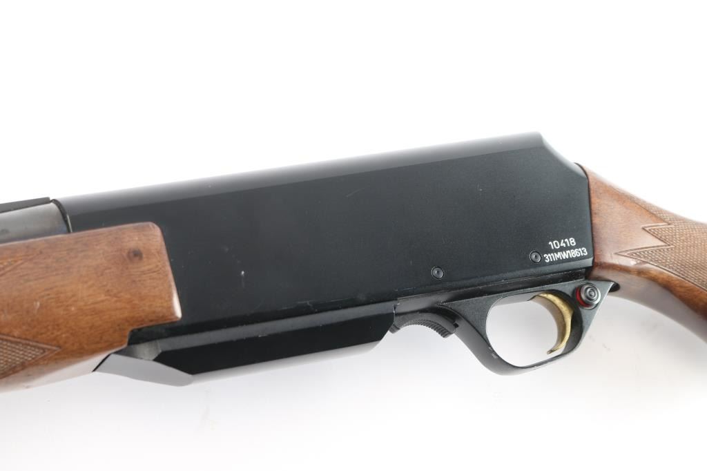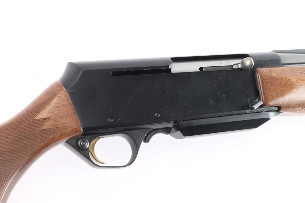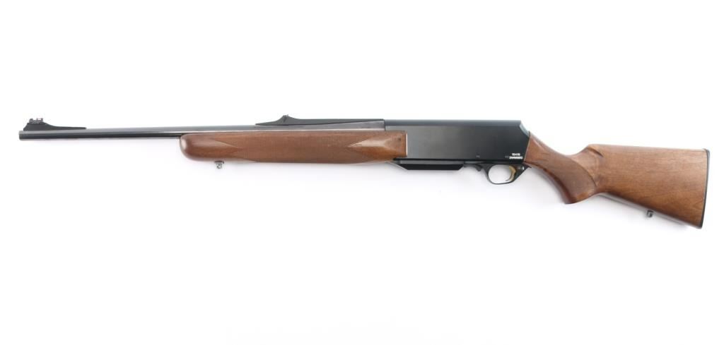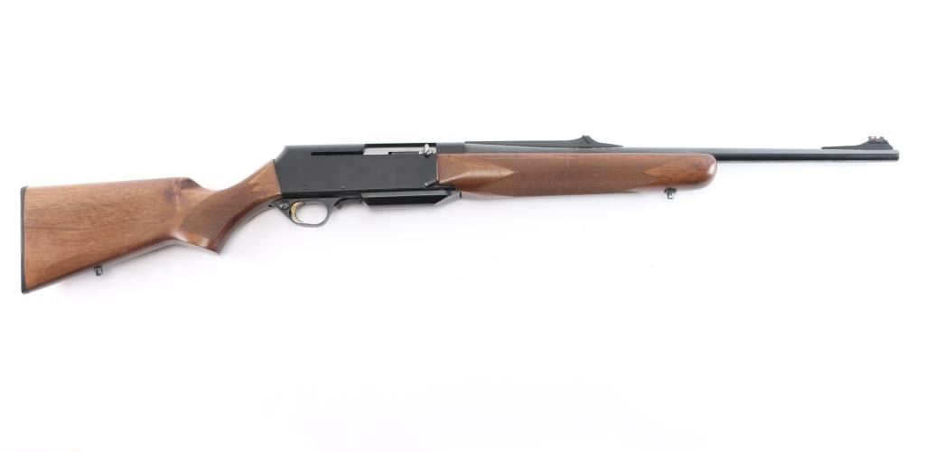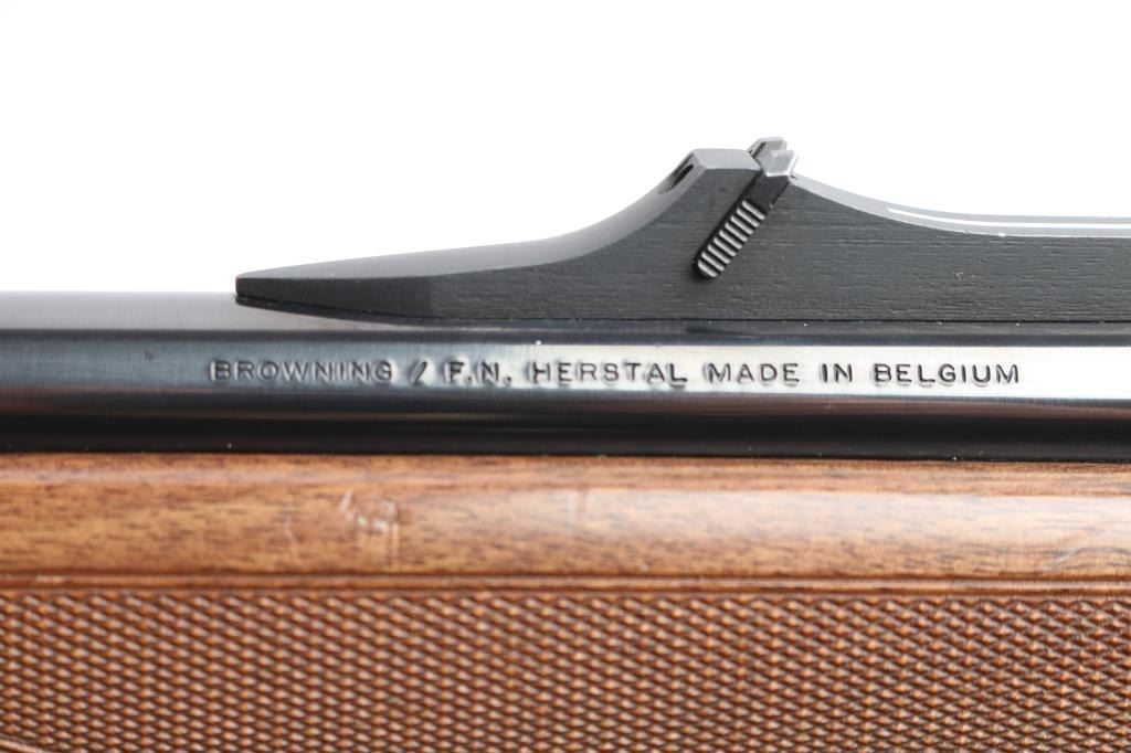 Grade I. Gas operated semi-automatic sporting rifle chambered in .270 Winchester, manufactured in Belgium by Fabrique Nationale circa 2004. Features a high polish blued barrel, matte black receiver, 20 1/2" tapered round barrel, ramped red fiber optic front sight (Missing a small piece in the middle), adjustable v-notch rear sight on rib with white sighting lines, receiver drilled/tapped for optics (no filler screws in holes), smooth gold toned trigger, alloy trigger guard with cross-bolt safety, bolt release on right receiver, hinged floorplate with detachable 3 round magazine, installed swivel studs, point checkered walnut forend with high gloss finish and semi-pistol grip shoulder stock with factory hard rubber buttplate. 12 1/2” LOP. Rifle retains approximately 96% of its finish showing light muzzle wear, some minor scratches/rubs, some light scattered patina on the upper underside of the barrel. Action is smooth with a crisp trigger pull, the bore is excellent/bright, and the wood stocks are very good with minor scratches/dents.