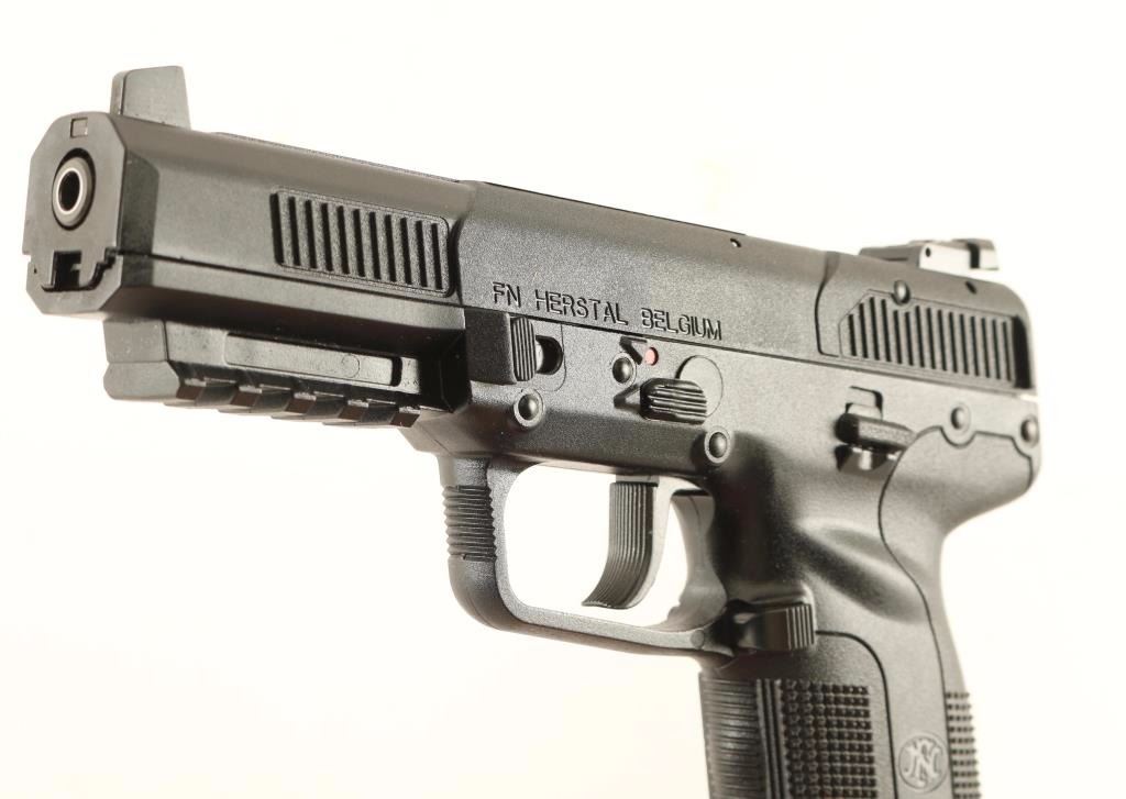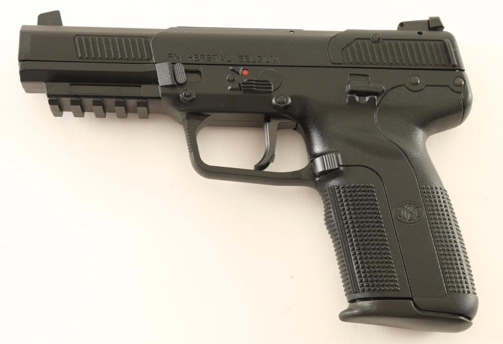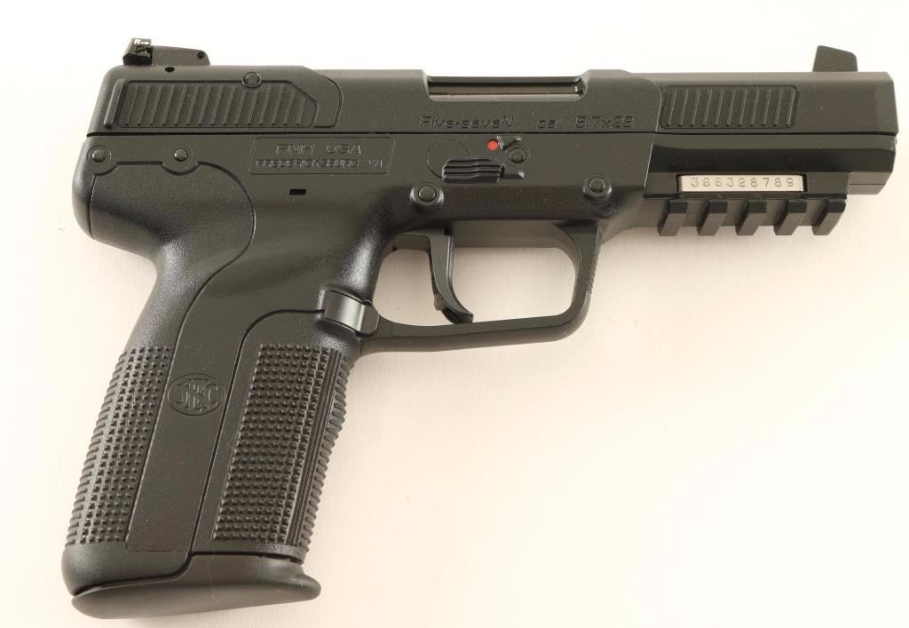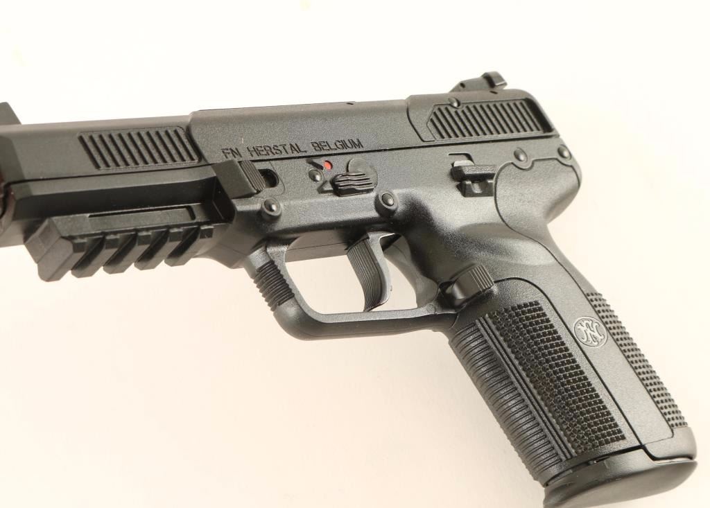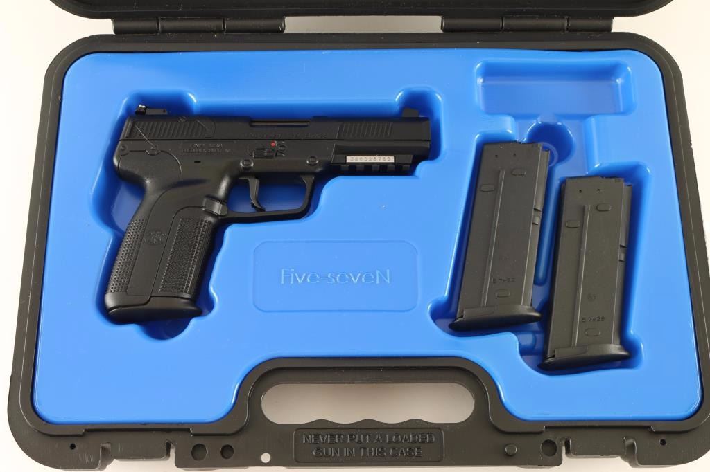 Belgium made single-action semi-automatic pistol chambered in 5.7x28mm. Features a chrome lined 4.9" stainless steel barrel. white-dot patridge front sight, adjustable two-dot rear window sight, polymer covered steel slide with dual cocking serrations, ambidextrous safety, serrated polymer trigger, push button magazine release, 20 round factory magazine and black polymer frame with integral accessory rail & knurled grip. Includes the original factory hard case with documents, lock, spent case and two extra 20 round factory magazines. Pistol exhibits little to no visible wear. Action is crisp, bore is excellent and polymer is fine. Condition is like new in case. ***Modern Firearm***