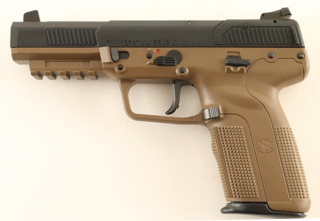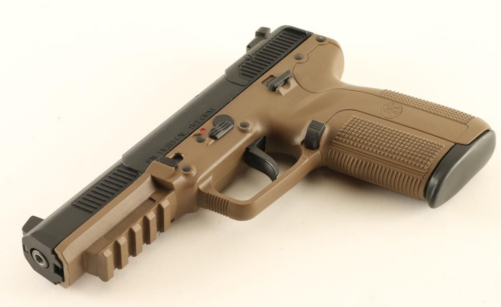 Belgian pistol chambered for the 5.7x28mm cartridge, imported by FNH USA, Fredericksburg VA. Features single action operation, manual safety, loaded chamber indicator, 3 dot sights with adjustable rear, dark earth color polymer frame, approx 4.75 inch barrel. Bore is excellent. Metal finish and frame are in excellent condition. Includes factory fitted plastic case, 2 spare magazines (3 total), fired case, manual. Condition is NRA Excellent - Like New ***Modern Firearm***