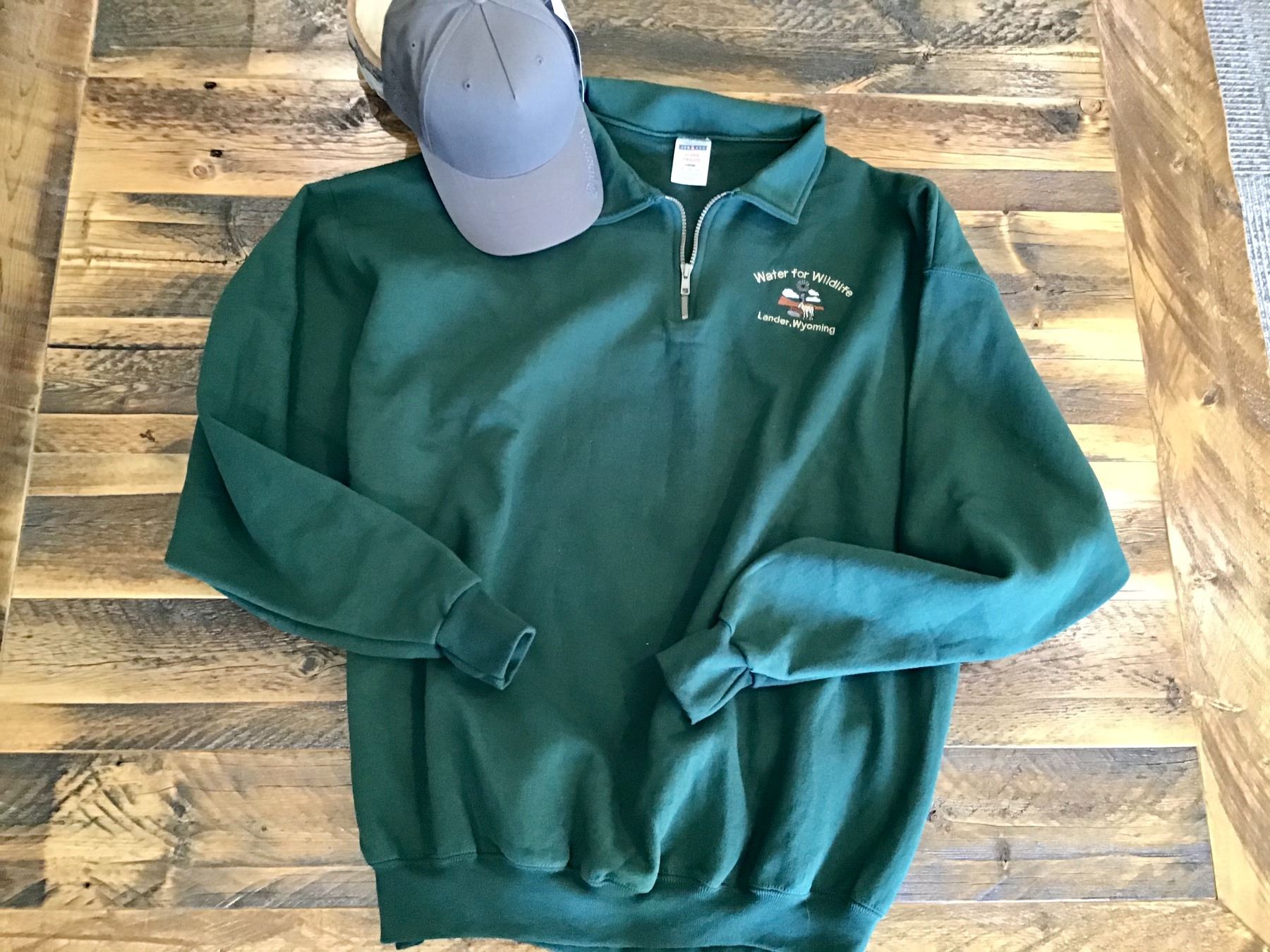 The Jerzee sweatshirt is 50% cotton/50% poly, a heavier weight and features a stand up collar. It is monogrammed with Antelope and Water for Wildlife. Forest green size 2x.