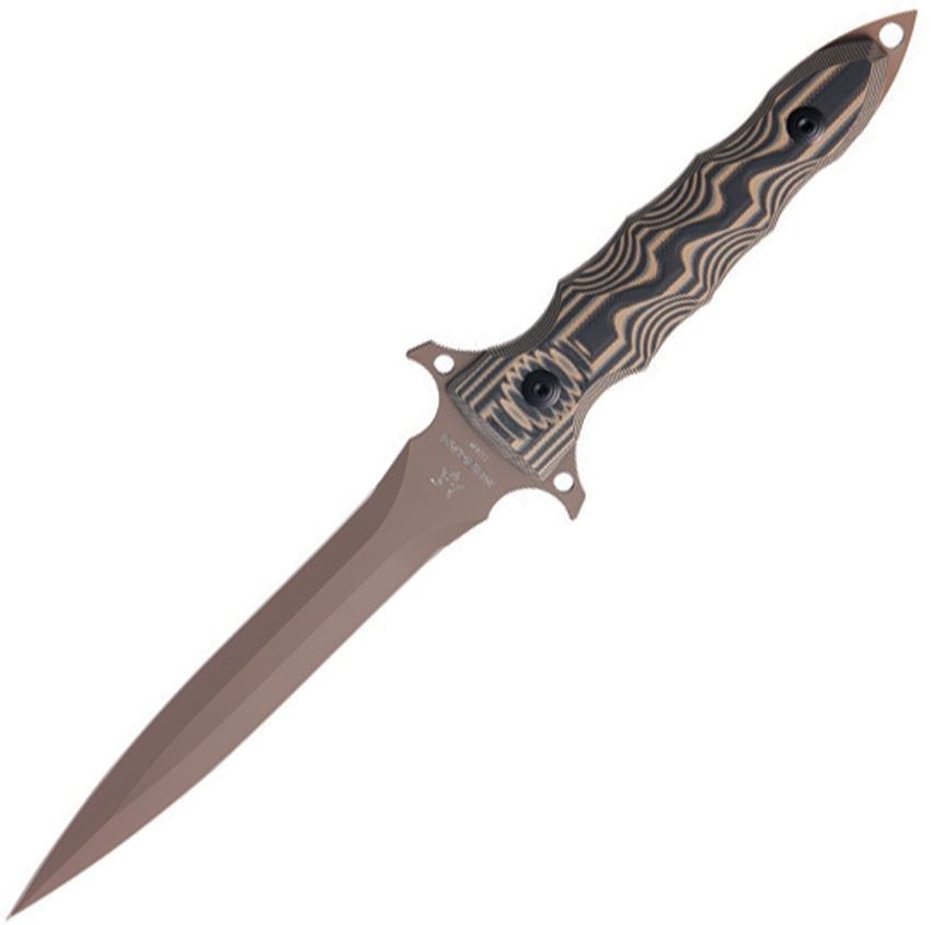 "Fox" FOX508 SRP: $368.95 13" overall. 7" N690Co stainless double edge dagger blade with coyote tan finish. Full, extended tang with integrated guard, pointed pommel, and lanyard hole. Grooved black and coyote tan G10 handles. Black leather MOLLE. compatible belt sheath with black cord lanyard. Weight: 1.35lbs Country of Origin: Italy