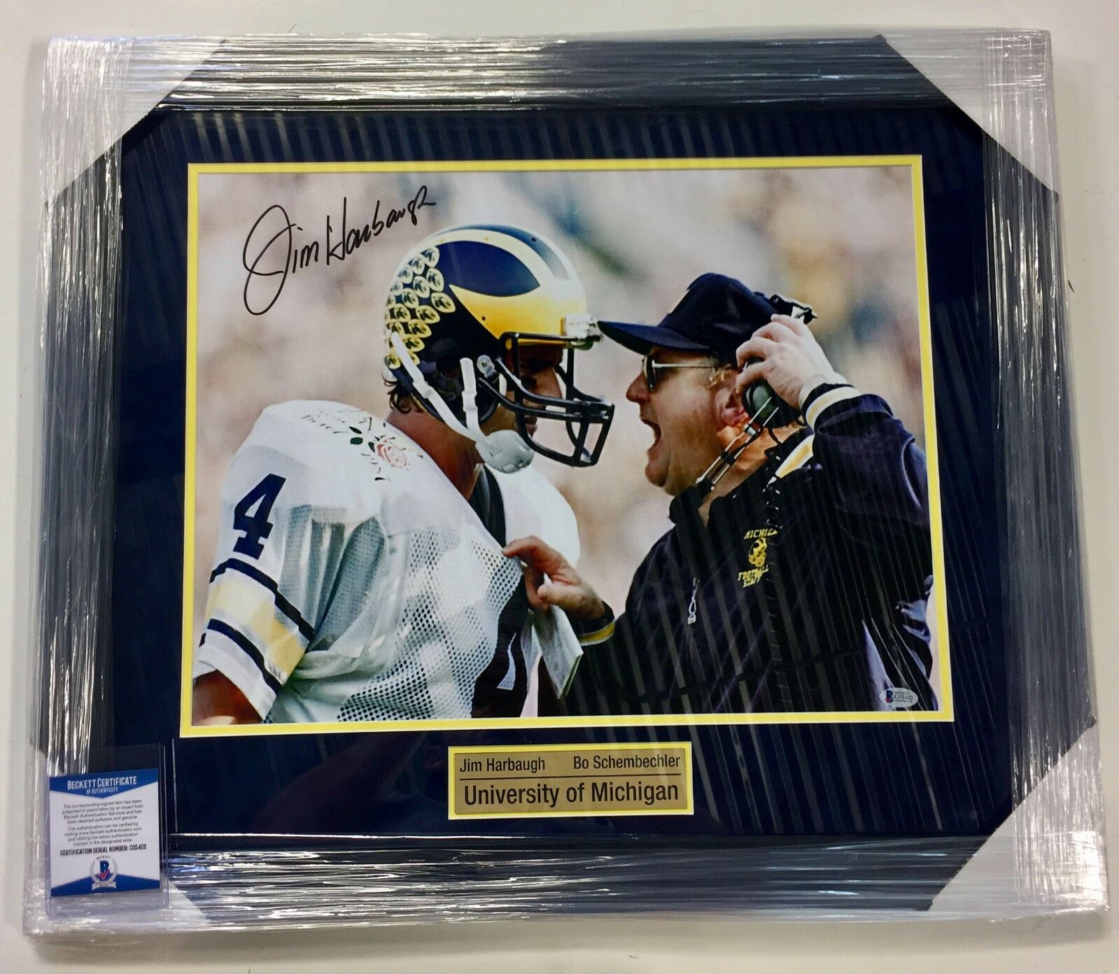 FRAMED PHOTOGRAPH OF JIM HARBAUGH AND BO SCHEMBECHLER SIGNED BY HARBAUGH