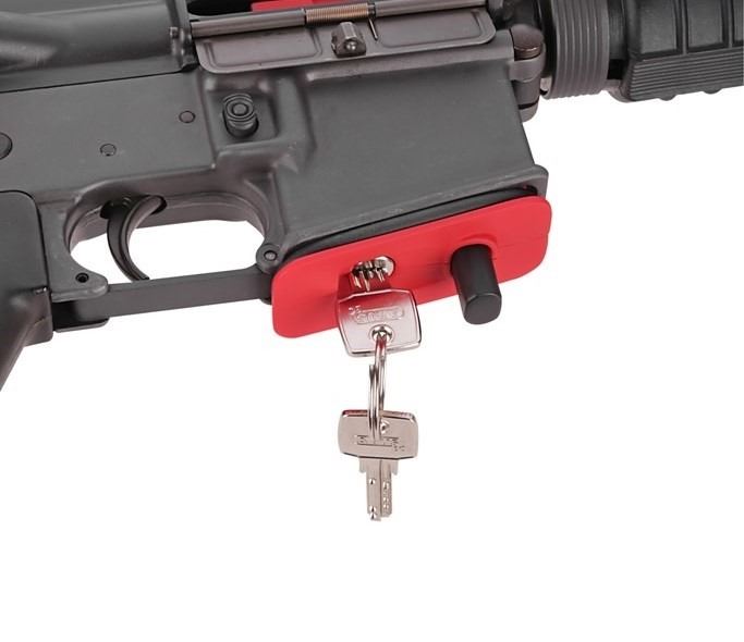 The AR 15 magazine lock serves as protection against theft and misuse of the weapon. Inability to fire is immediately guaranteed and evident after insertion into the weapon. In addition, the weapon is prevented from being dismantled with the lock in place, as the security device is inserted in the cocked state. This makes it impossible to insert a cartridge into the chamber.
