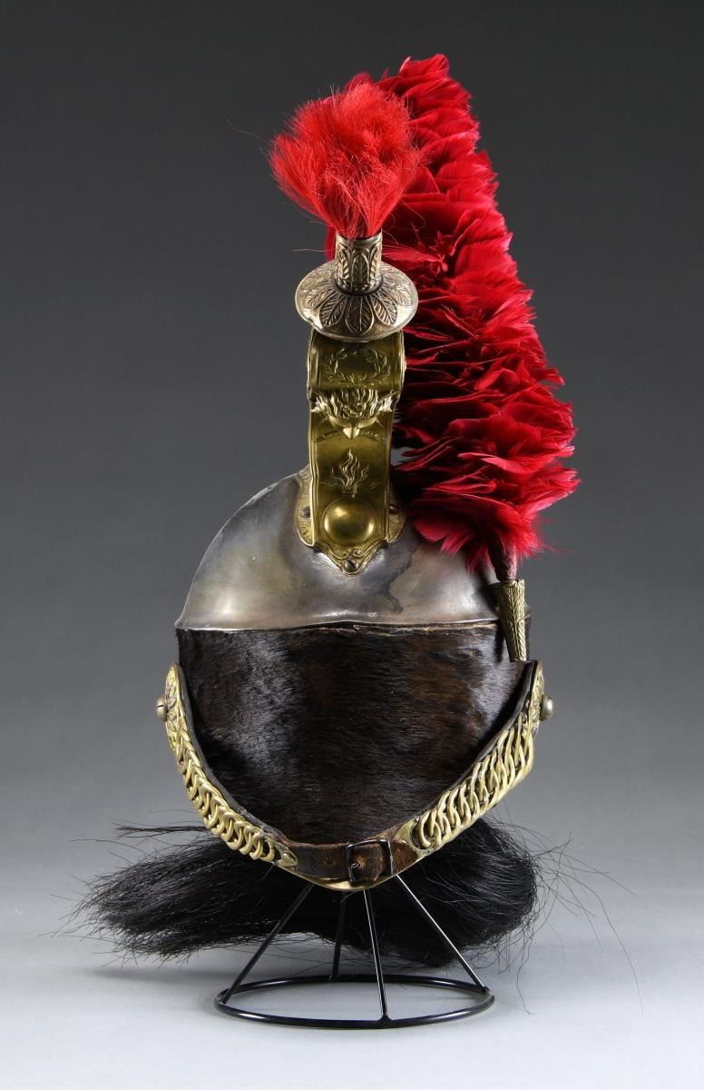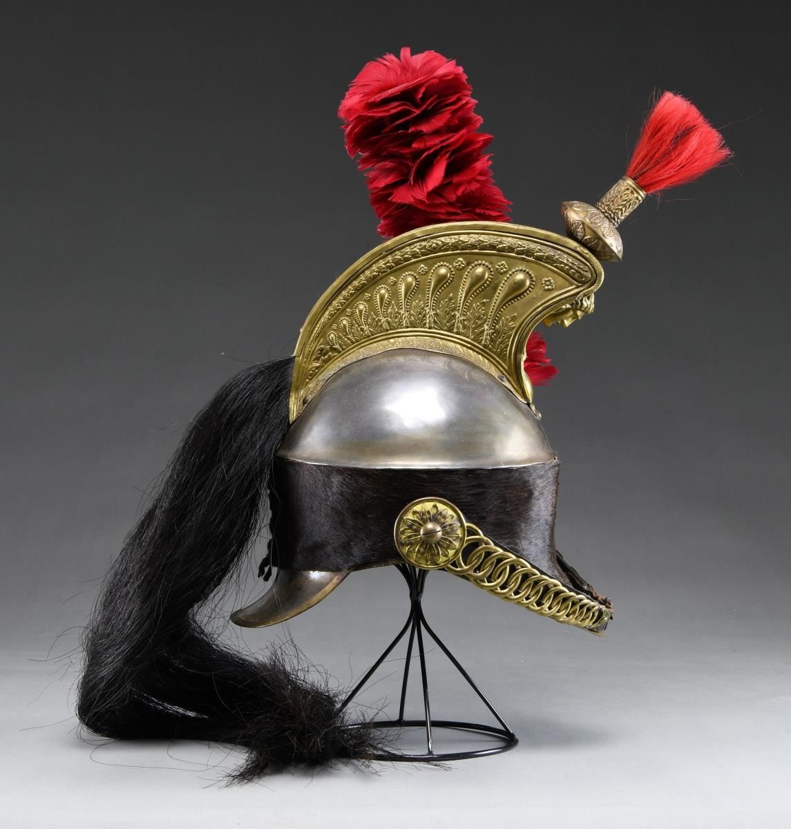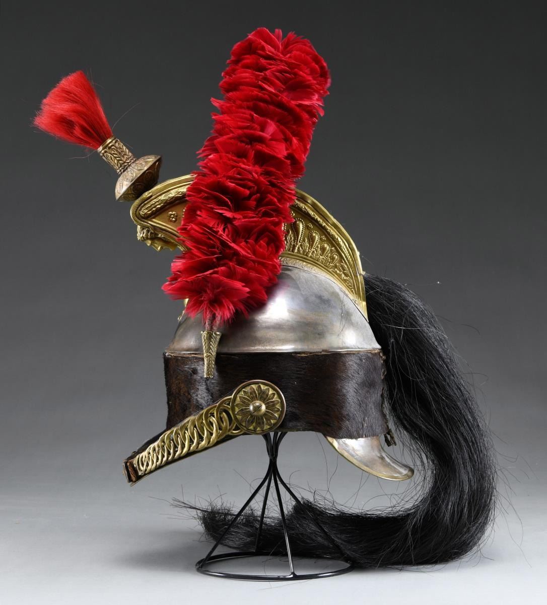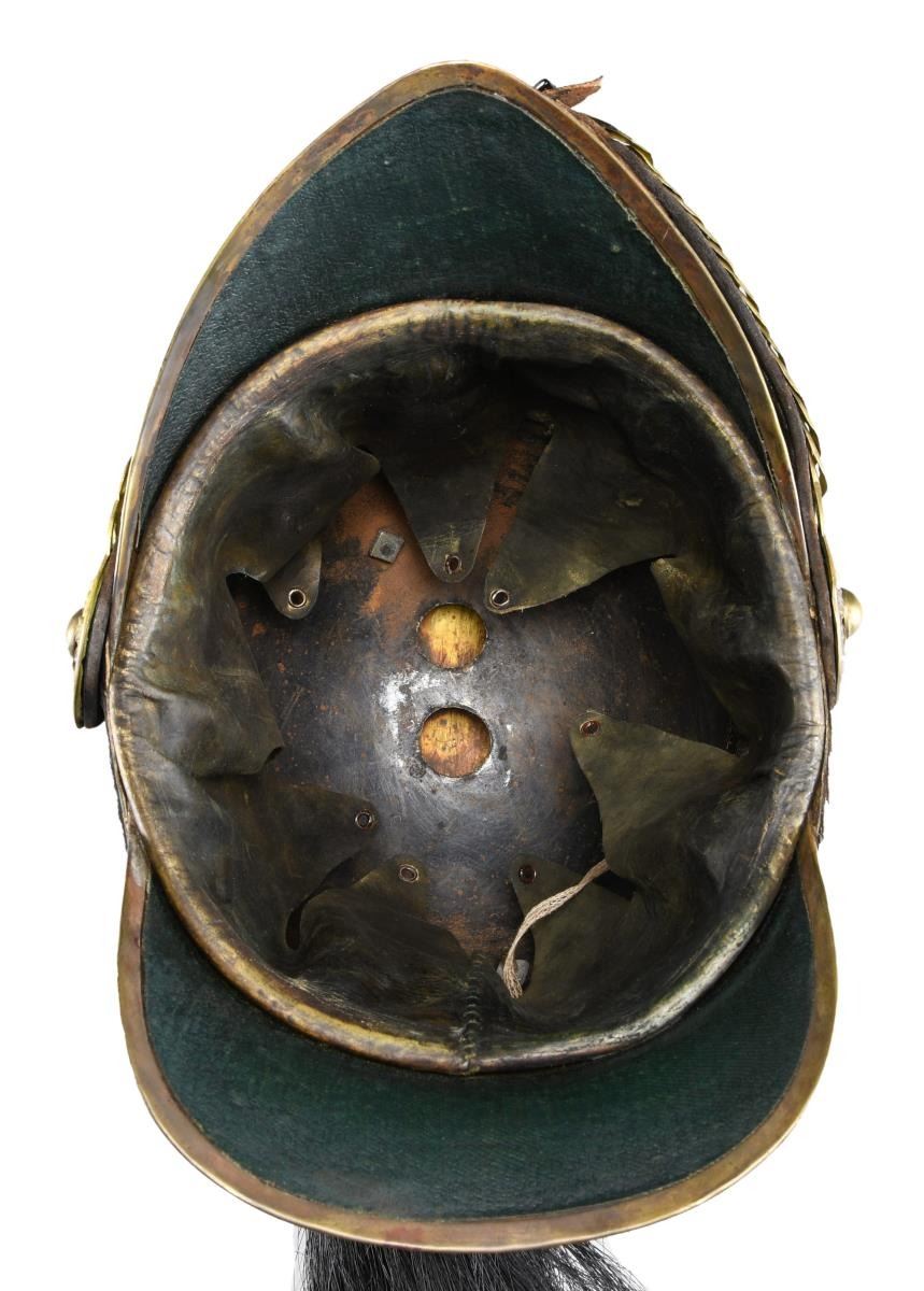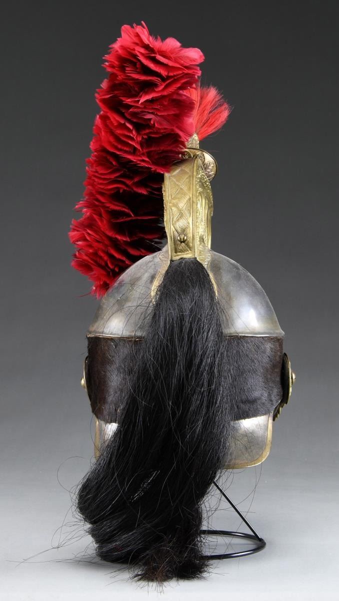 This helmet features a polished magnetic steel body with brass trim on the visors and a large fanciful brass comb featuring a flaming bomb on the front along with the head of Medusa. The front of the comb has a 5” red horsehair plume, and there is a lengthy black 25” horsehair tail coming out of the back of the helmet. There is a 12” red plume on the left side of the helmet as worn. The lower half of the helmet is covered with laced up calf skin, and there is a large linked chinstrap with large floral side posts. The interior visors are finished in green leather and the brown leather liner exhibits 9 tongues with eyelets at the end. CONDITION: helmet generally shows light wear, but was definitely used. The side feather plume & horsehair tail may be replaced, but are correct for the helmet. (02-19400/BF). $500-900.