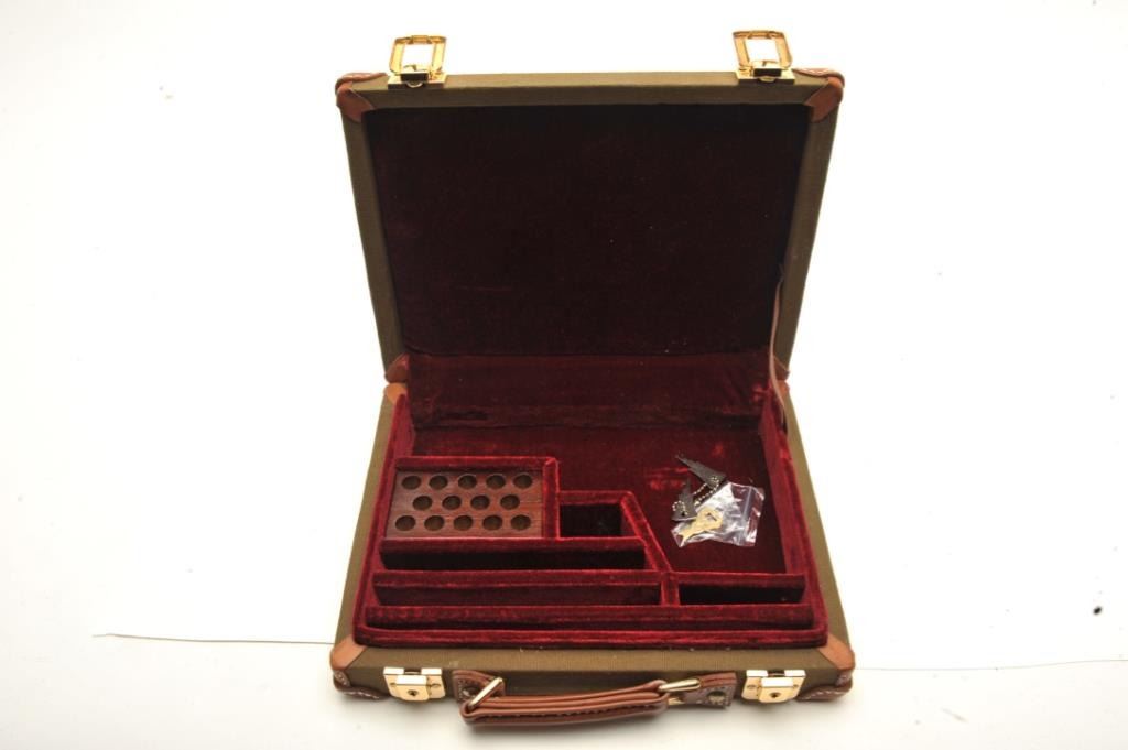 for a pocket size semi-automatic pistol in fine condition with wood cartridge block and compartments for additional magazines. Est.: $50-$100.