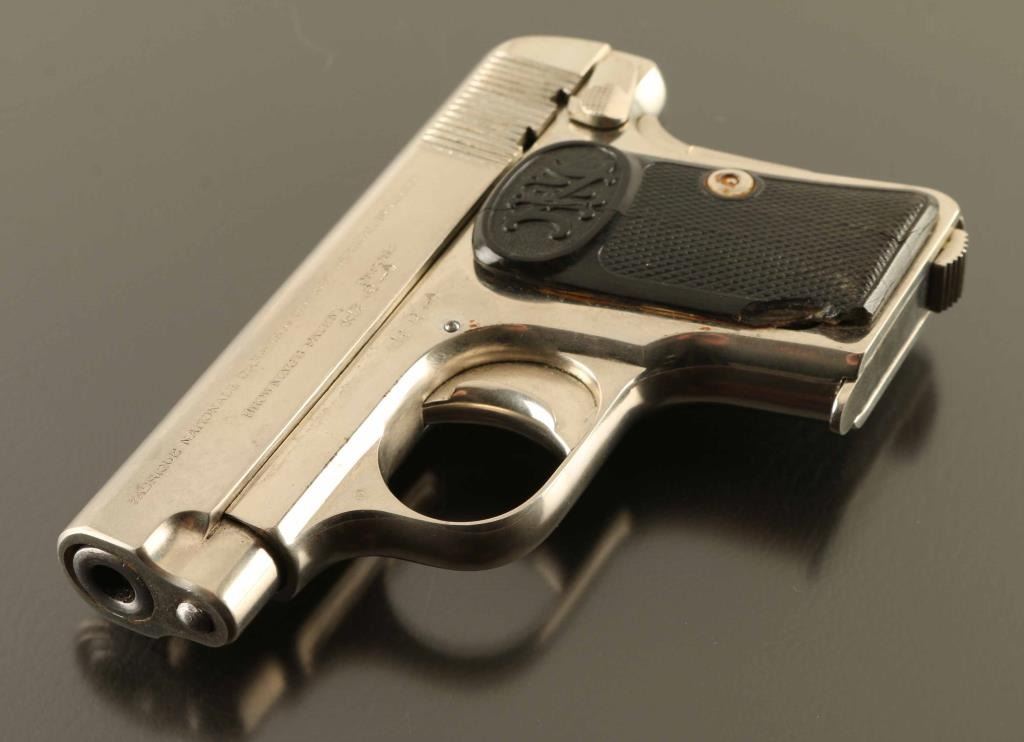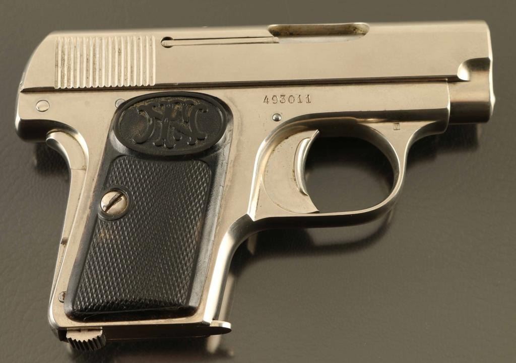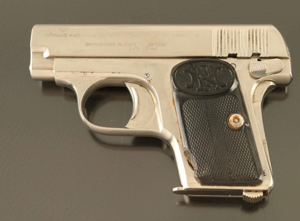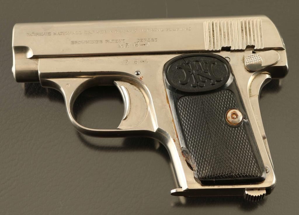 Vintage striker fired semi-automatic pocket pistol chambered in .25 Auto, manufactured in Belgium. Features a nickeled finish, 2" barrel, full-length steel guide rod, fixed sights, smooth trigger with wide pad, manual safety/slide stop on the left side of the frame, grip safety, heel magazine release, 6 round magazine, steel frame and two-piece checkered black hard rubber grips with "FN" logo. Bore is good condition, bright with strong rifling, ring of pitting close to muzzle. Nickel finish is very good condition with few signs of clouding or peeling. Grips are fair, chipped corner from left panel. Condition is NRA Good+ *** C&R Firearm ***