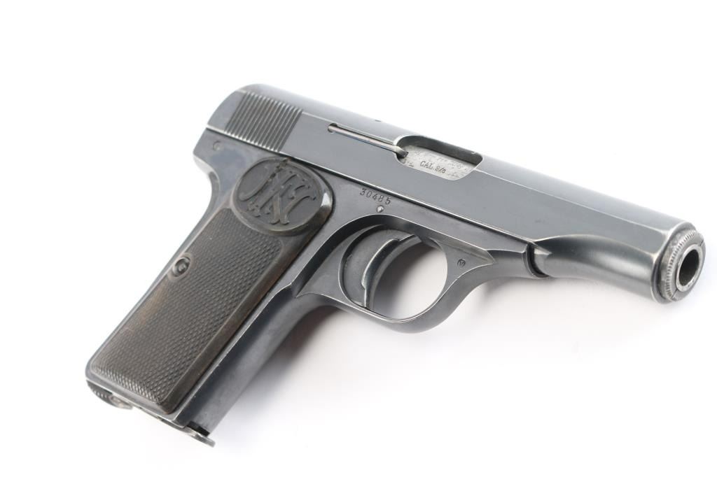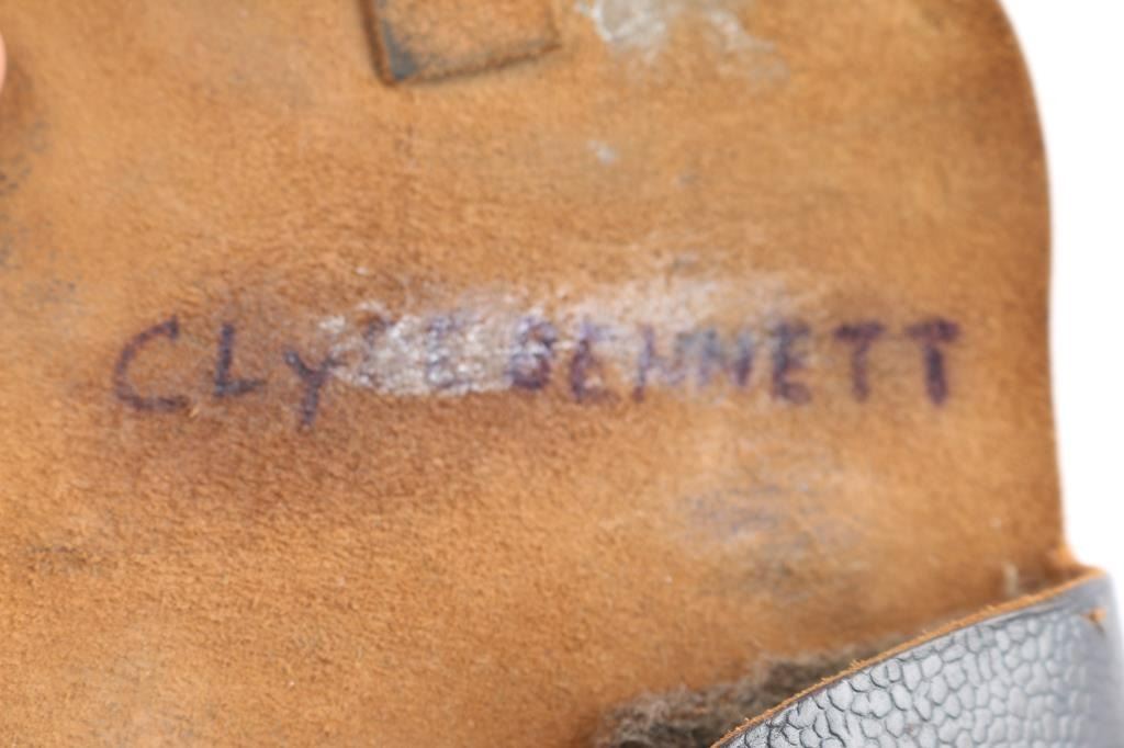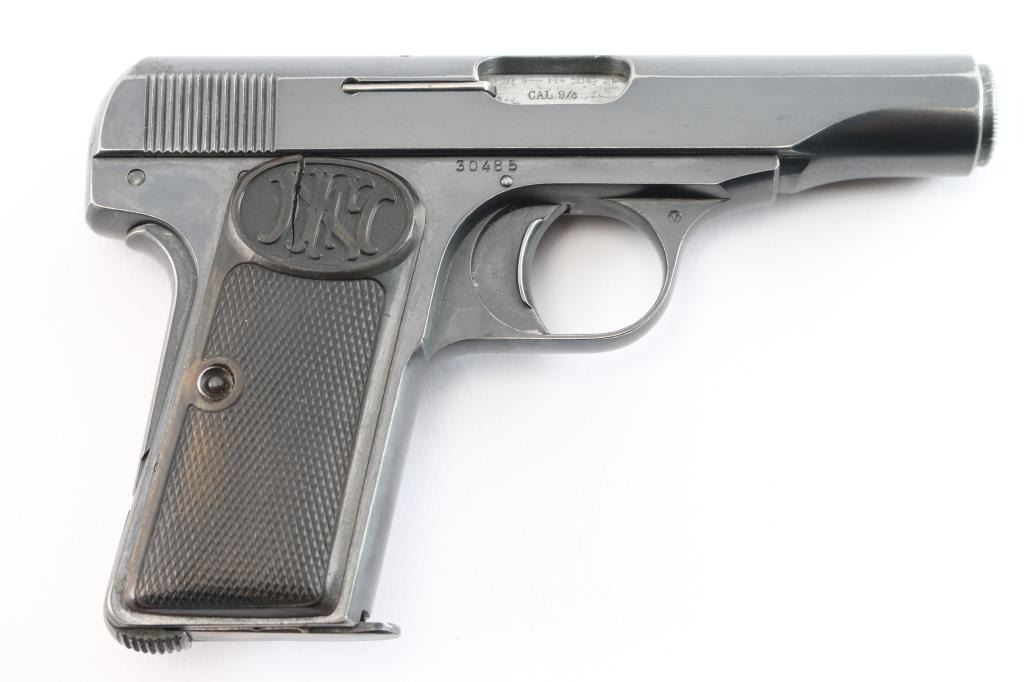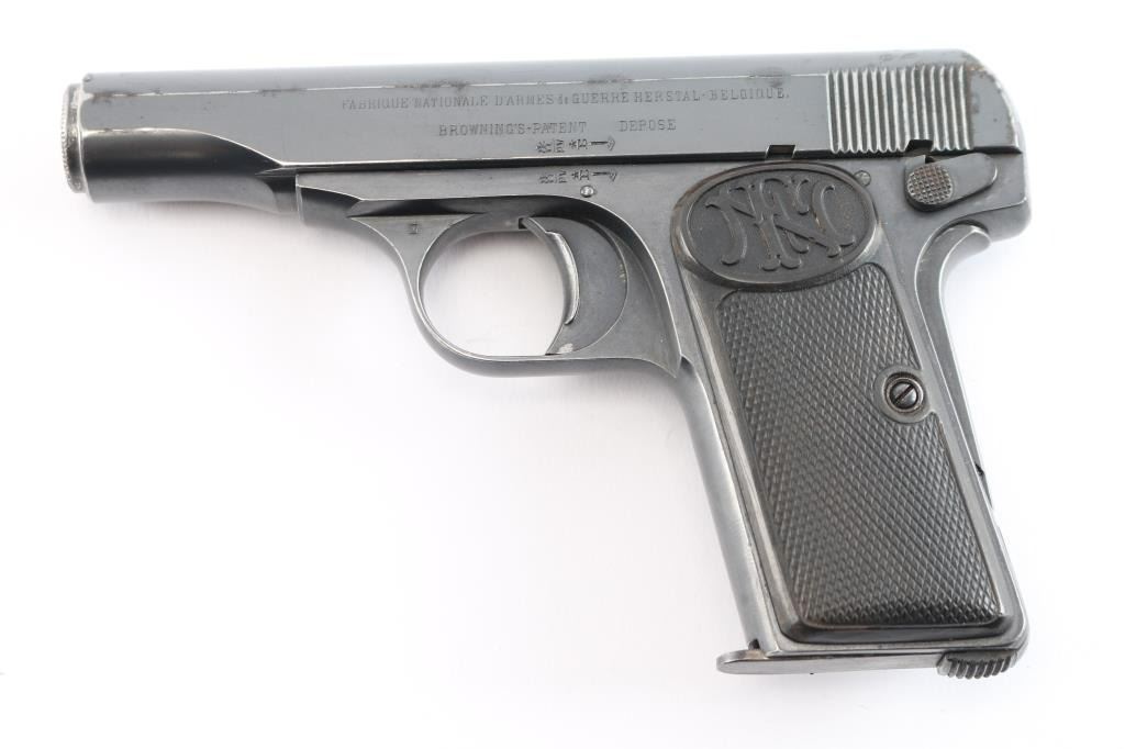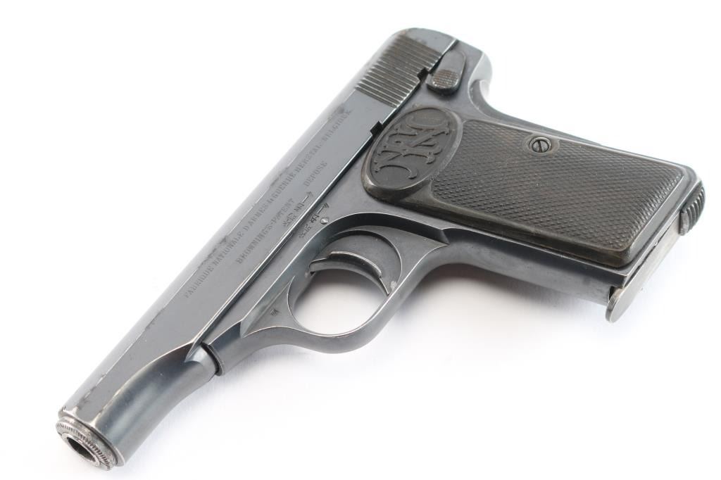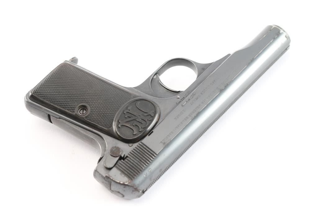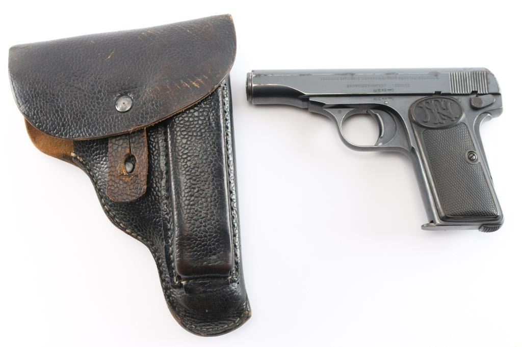 Belgian made striker fired semi-automatic pocket pistol. Features a blued finish, 3.4" barrel, fixed sights, rounded trigger, manual safety/slide catch on the left side of the frame, grip safety, heel magazine release, factory 7 round magazine, steel frame, two-piece checkered black composition grips with FN monogram on the tops. The sideways E with an asterisk is the mark of inspector Auguste Jamart, who worked as an inspector between 1924 and 1959. (On slide & frame). Early production grips and the gap between "Patent" and "Depose" indicated this is a early pistol Bore is good condition/bright. Retains about 80% finish with edge losses, some fading, handling marks. Grips are overall good with a crack in the top right panel. Comes with a black leather military/police style flap holster with the name "Clyde Bennett" written inside the flap, most likely the vet who brought it home.