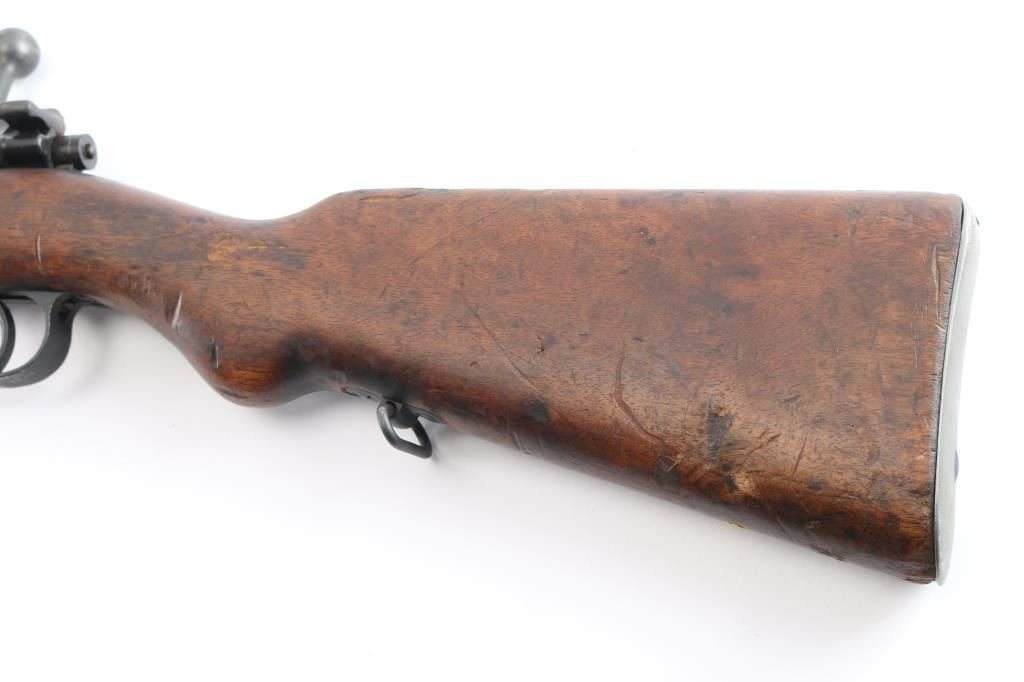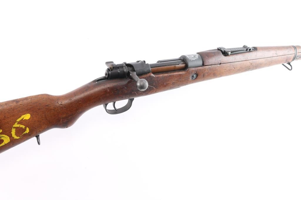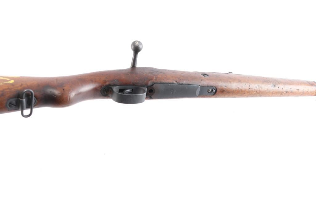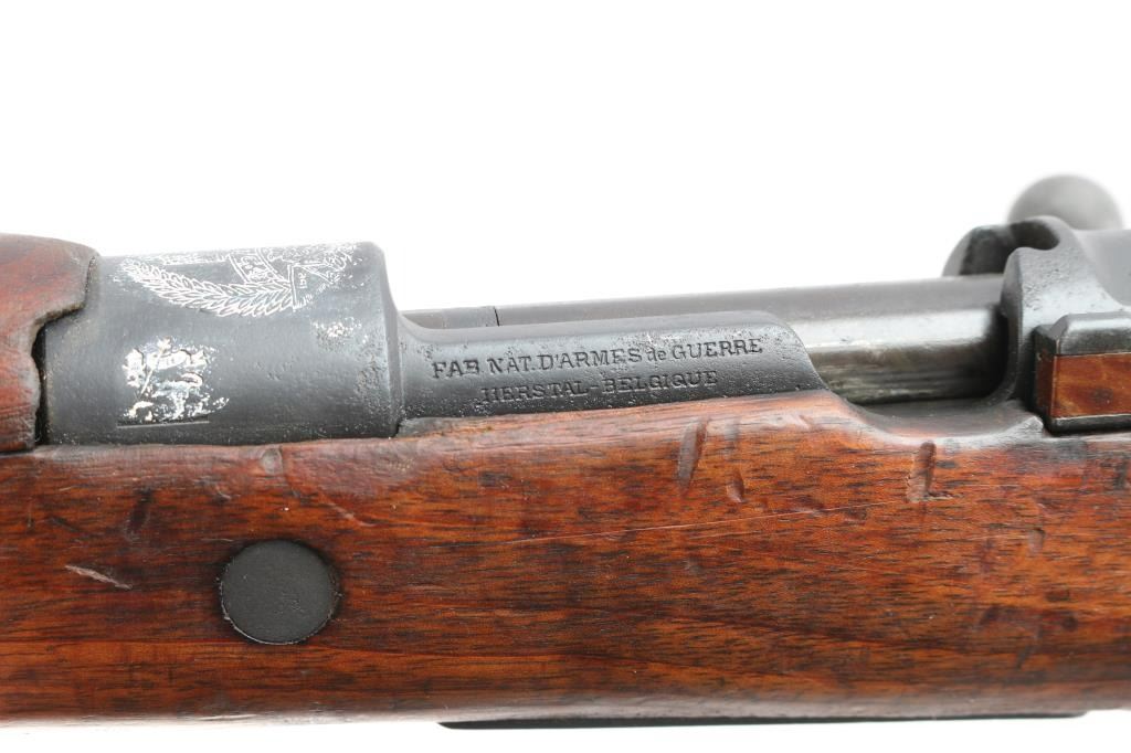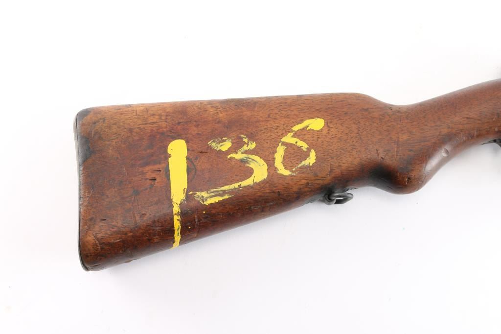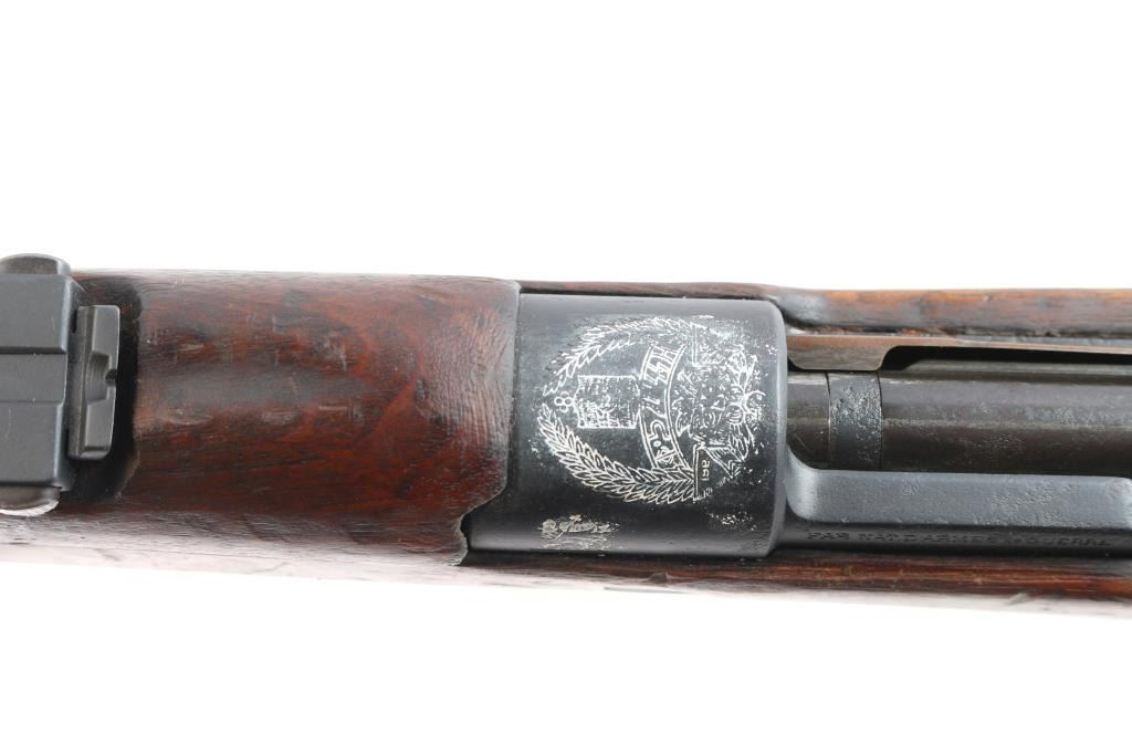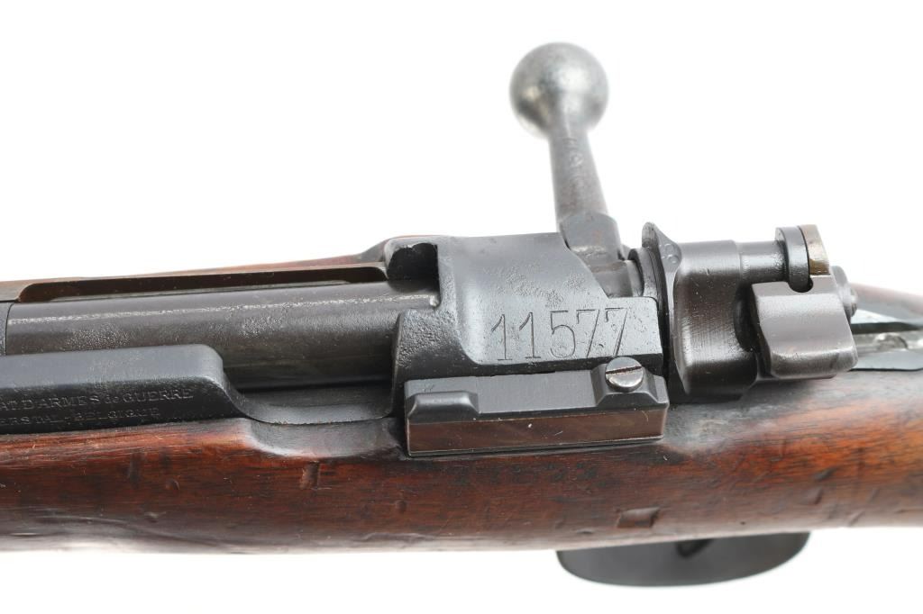 SN: 11577. Rare Ethiopian military issued 1930 Short Mauser rifle. Manufactured by Fabrique Nationale in Belgium. Ethiopia, under Emperor Haile Selassie, heavily armed its military in the 1930s by purchasing thousands of FN Mauser rifles from FN for national defense against Italian aggression These rifles feature the Abyssinian Crest on the top of the receiver and the Lion of Juda on the left side of the receiver. marked “Fab. Nat. D’Armes de Guerre/Herstal, Belgique” on the left receiver rail. Imported by TMC, marked on underside of barrel. Serial number matched on receiver, bolt and stock, 23" barrel, inverted V front, tangent rear sight, straight bolt handle, floorplate marked with German waffenamt eagle WaW77, "H" barrel band. Large "136" rack number written in yellow paint on right buttstock, crest and lion highlighted in white. Bore is rough/dark, finish and wood are overall very good with scratches/dings. Cleaning rod present.