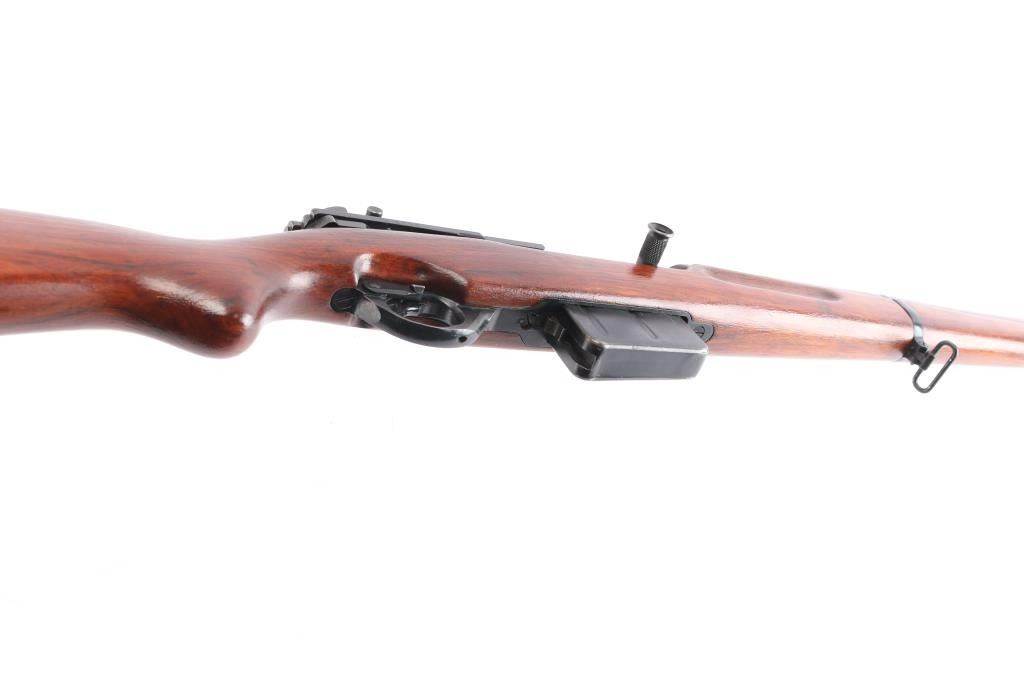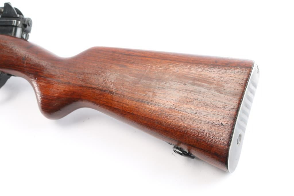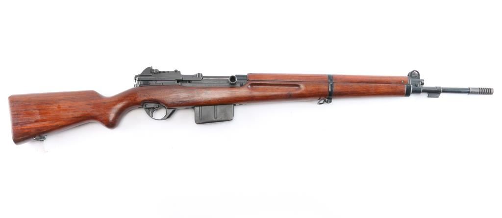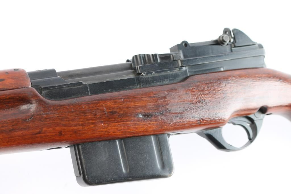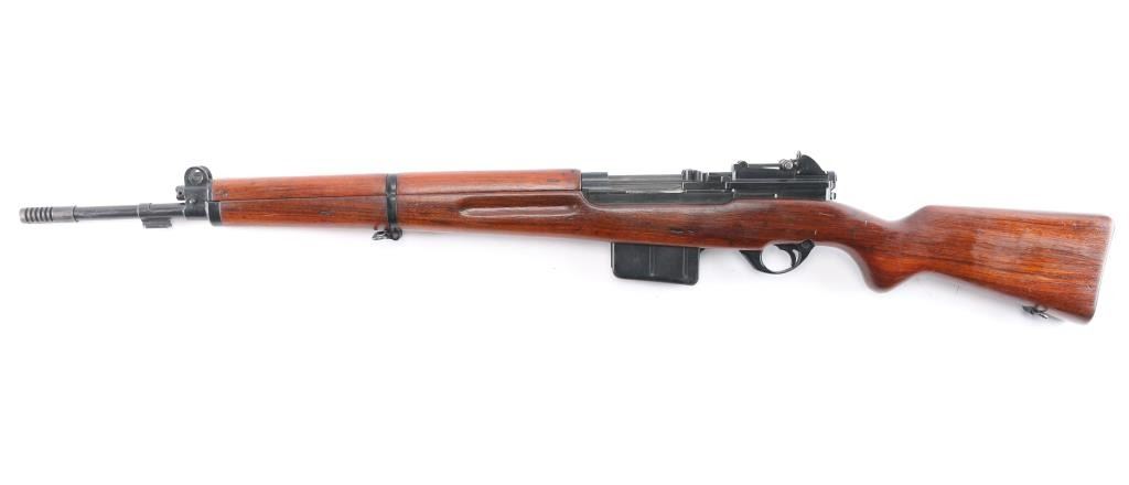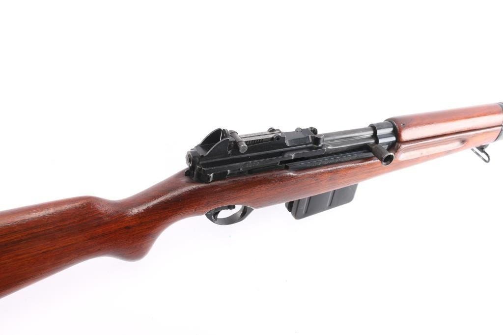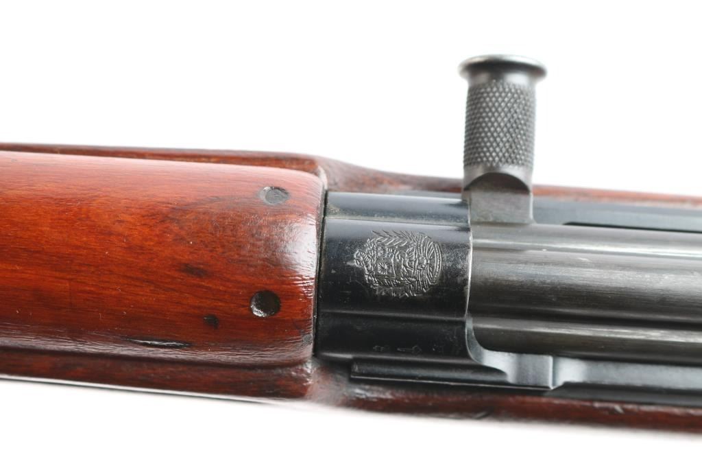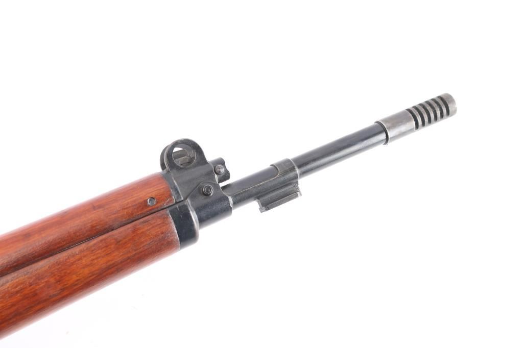 'FN49' Rifle. Semi-Automatic. Venezuelan Military issue. Belgium made by Fabrique Nationale. First FN 49 with vented muzzle break. Gas operated short-stroke piston, tilting bolt. 23.2" barrel, with protected front blade, and tangent rear sights. muzzle break and bayonet lug. 10-rd box magazine. Thumb safety on triggerguard. Venezuelan crest on receiver. FN markings on right receiver. Belgium proofs. Action is crisp/tight. Bore is very good/bright with strong rifling. Blued metal finish is about 98%, with some minor scratches/rubs. Magazine has a little edge wear, wood is overall very good/sound, appears to have been lightly sanded as no cartouches are visible, coat of varnish applied, sling swivels, ribbed steel buttplate. Low serial number. No import marks. Manufactured 1949-61. Matching serial numbers.