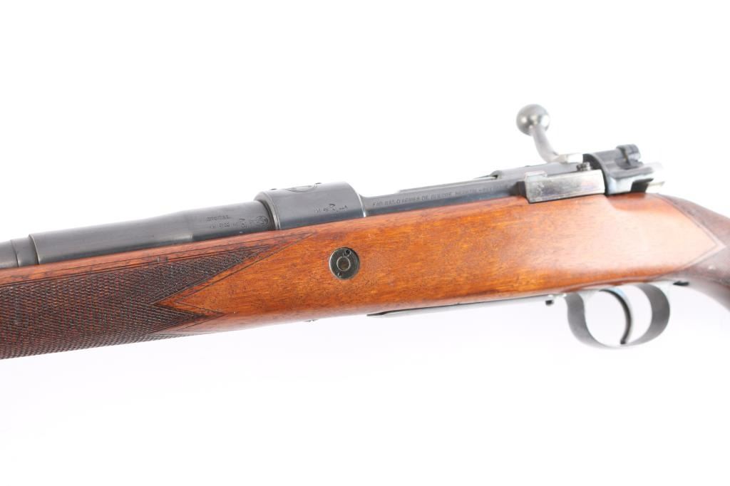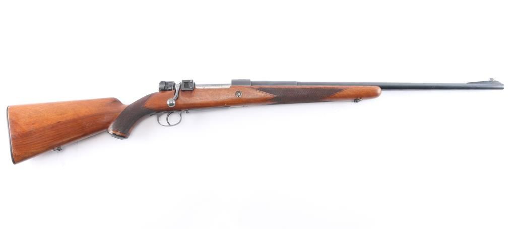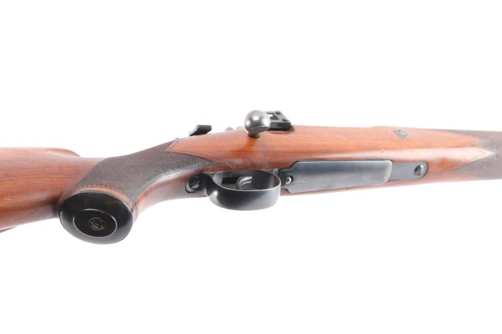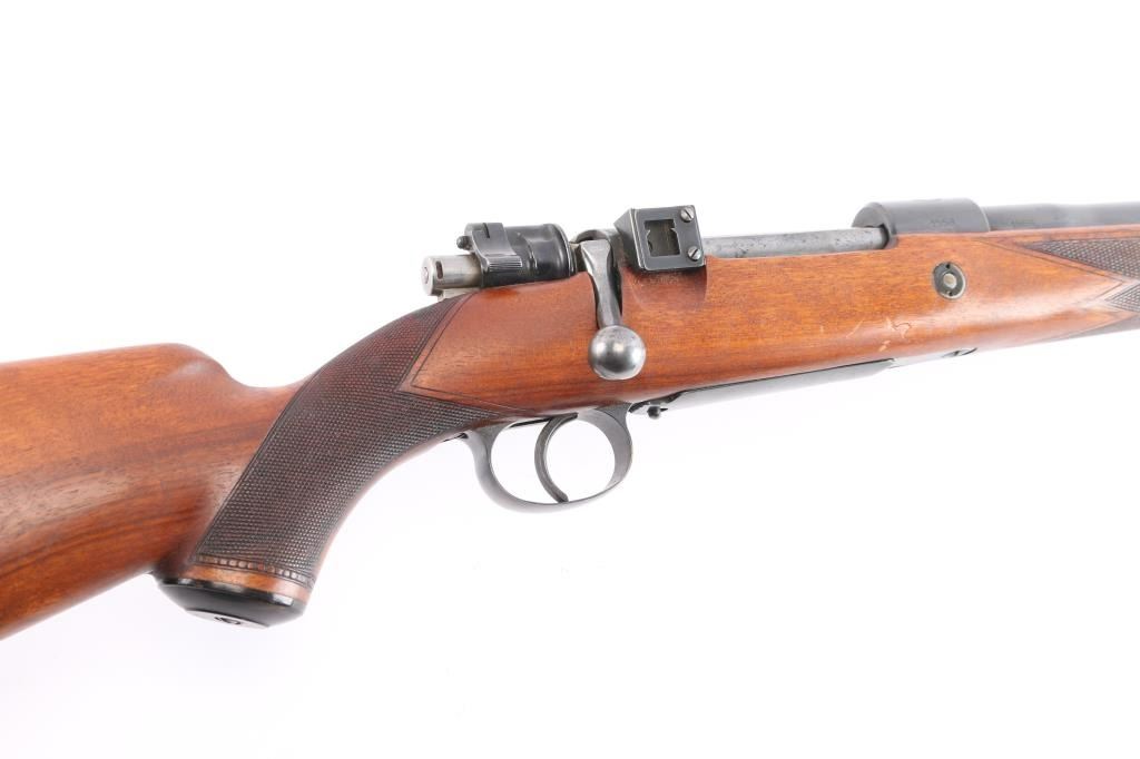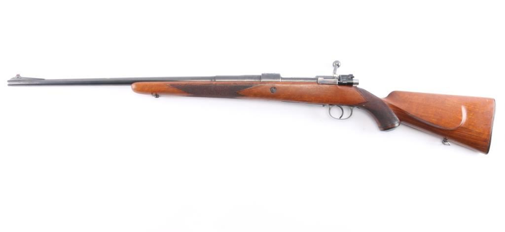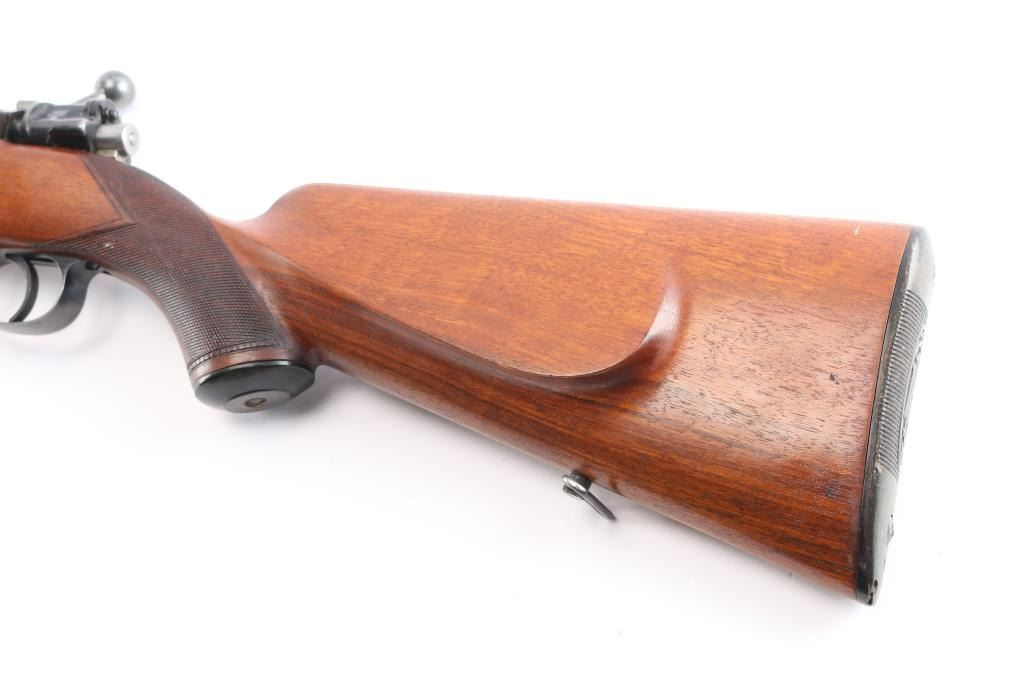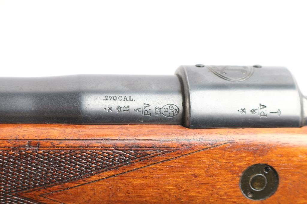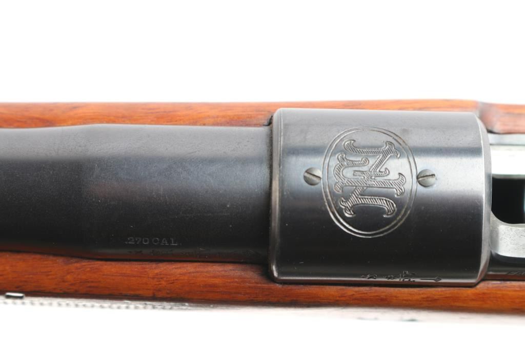 SN: 1558. High quality bolt-action commercial sport rifle chambered in .270 Winchester. Manufactured by Fabrique National D'Armes Herstal-Belique. built on a commercial Mauser 98 action. FN crest on chamber, Belgium, Leige proofs and star over X proof mark (indicates 1937-1964 for manufacture). Blue finish, polished bolt & extractor, 24" barrel with raised blade/bead front sight, rear peep sight base installed on right receiver (Base only) , drilled/tapped for optics, smooth trigger, flag safety, hinged floorplate. One piece nicely grained wood stock with fine point checkered panels at wrist & forearm, factory horn buttplate & grip cap, sling swivels and right-handed shadow line cheek rest. The action is smooth, bore is very good/bright, strong rifling, wood is very good/sound with a few minor scratches and the blue is about 855 with some scratches, rubs on the barrel, some handling wear on the bottom metal and blot release, release still has some bright nitre blue finish.