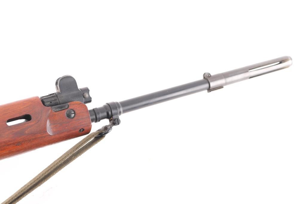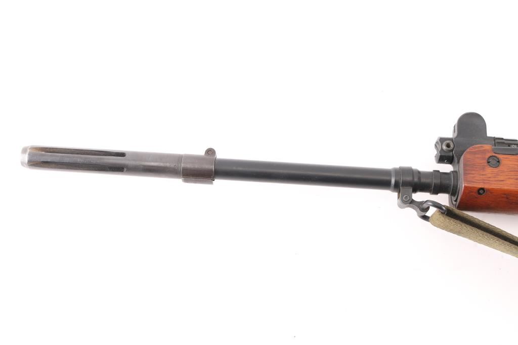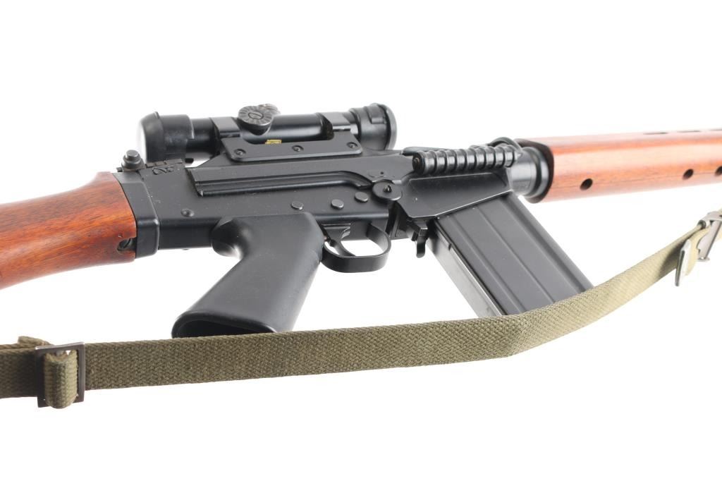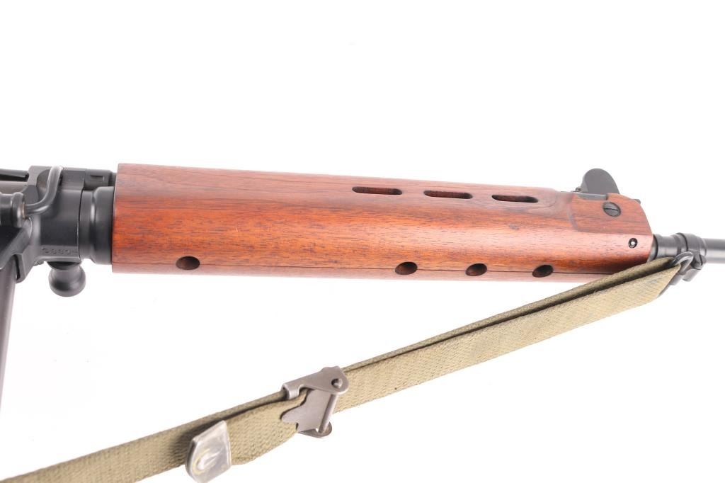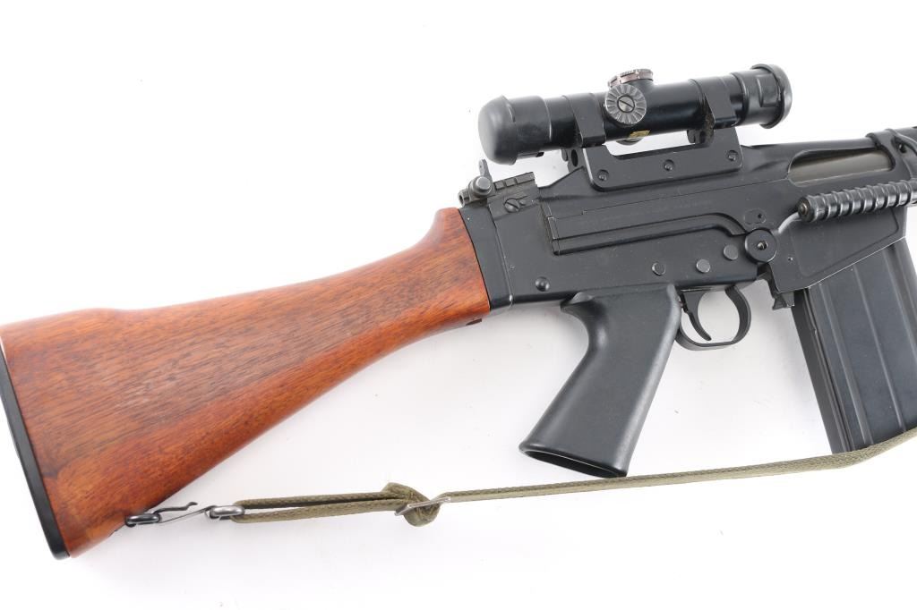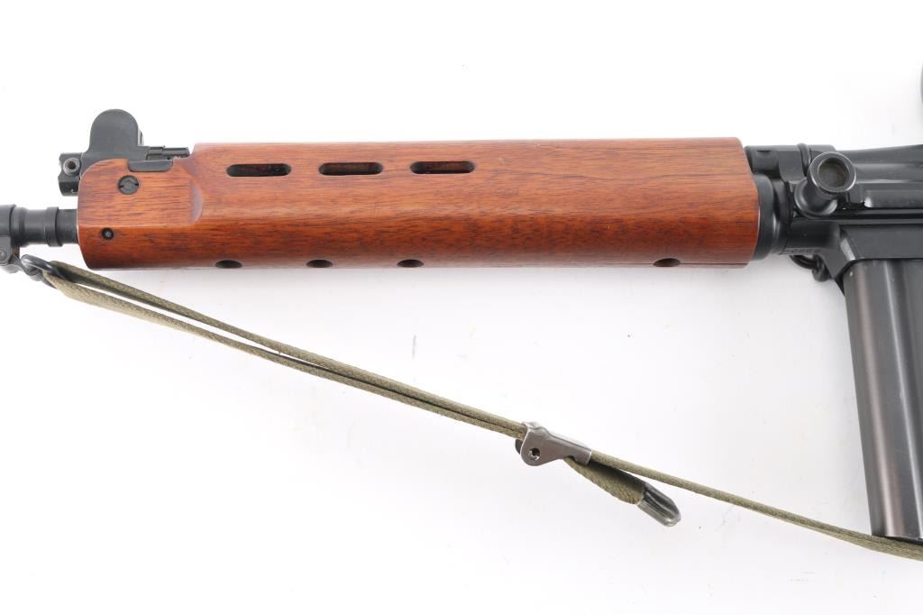 SN: G880. Scarce and Desirable Fabrique Nationale G Series FAL Semi-Automatic Rifle. Produced in Belgium, this rifle is part of a limited importation run performed by Browning Arms in the early 1970s. Originally given a green light by the ATF, an exemption was granted for the rifles that had already brought into the country before the ATF reversed their position, due to the use of sear pocket equipped receivers in the G-series. Post front and military tangent peep sights, with a long flash hider, bayonet lug, and adjustable gas port with grenade setting .Carrying handle, 20" round barrel, 24" with removable ported flash hider. The left side of the upper receiver is marked "F.A.L. cal. 7.62", and the trigger housing has the "S/R/A" selector markings, with the "A" position disabled via selector. Fitted with a smooth plastic pistol grip and a fine hardwood ventilated forearm and buttstock set. Metal buttplate. Includes a green web sling. Mounted with a German made Hensoldt Wetzlar ZF 7.62x51-4x scope. The design of the scope was owned by the West German government post WWII. scopes issued to German Bundeswehr are marked with a supply number 12-120-9556, which this one has. Rubber lens covers, German 3 post reticle, clear optics. Rifles wood and matte black finish are excellent, action is smooth and the bore is excellent/bright. Near new condition.NRA condition-Excellent. C&R Firearm.