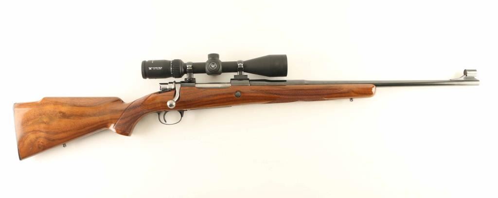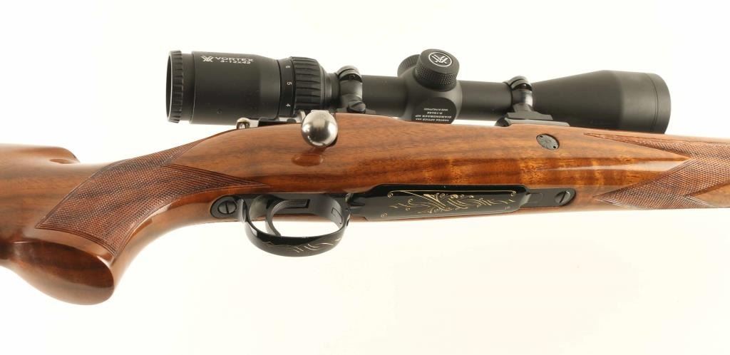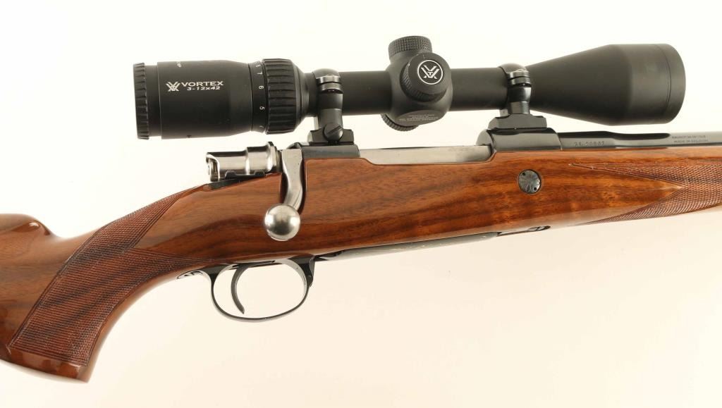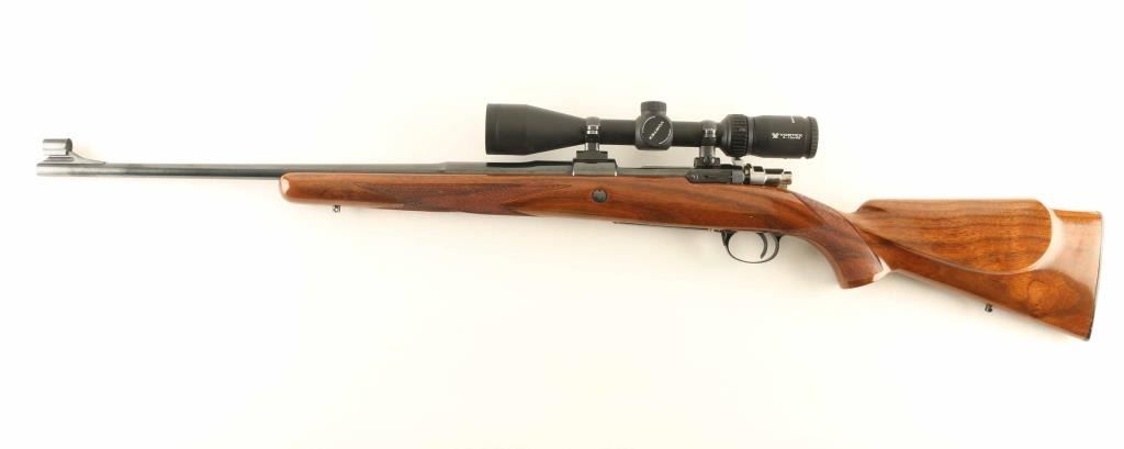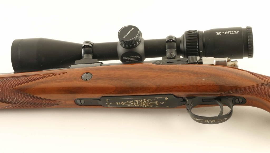 SN: 3L20567 'Safari Grade' Belgian bolt action rifle, manufactured circa 1959, imported by Browning Arms Company, St Louis MO. Features blued finish, high polish bolt assembly, urethane finished fancy figured walnut stock, checkered panels at wrist & forend, flat plastic buttplate, sling studs, right handed cheekpiece, 22.5" barrel, hooded ramp front sight, no rear sight (drilled & tapped with holes plugged for rear sight), two piece Leupold type scope bases & rings, hinged floorplate, manual safety. Bore is very good condition. Retains 95% blue with few handling marks. Bottom metal is engraved with scroll motif design & filled with gold color paint. Stock is excellent condition with few dents & scratches. Mounts a very good condition Vortex Diamondback HP 3-12x42mm scope with Bullet Drop Compensating duplex reticle and clear view. Condition is NRA Excellent *** C&R Firearm ***