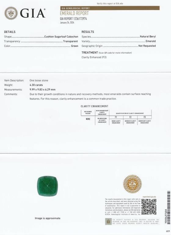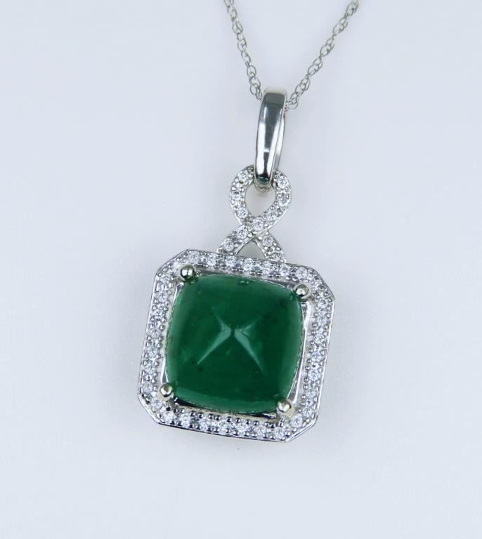 Cabochon Emerald and Diamond Pendant featuring a Natural Emerald with rich Blue Green color accented with 44 round Diamonds with H-I colors and VS clarity set in a detailed 14 karat white gold setting. Full Retail Appraisal - $7,800.00