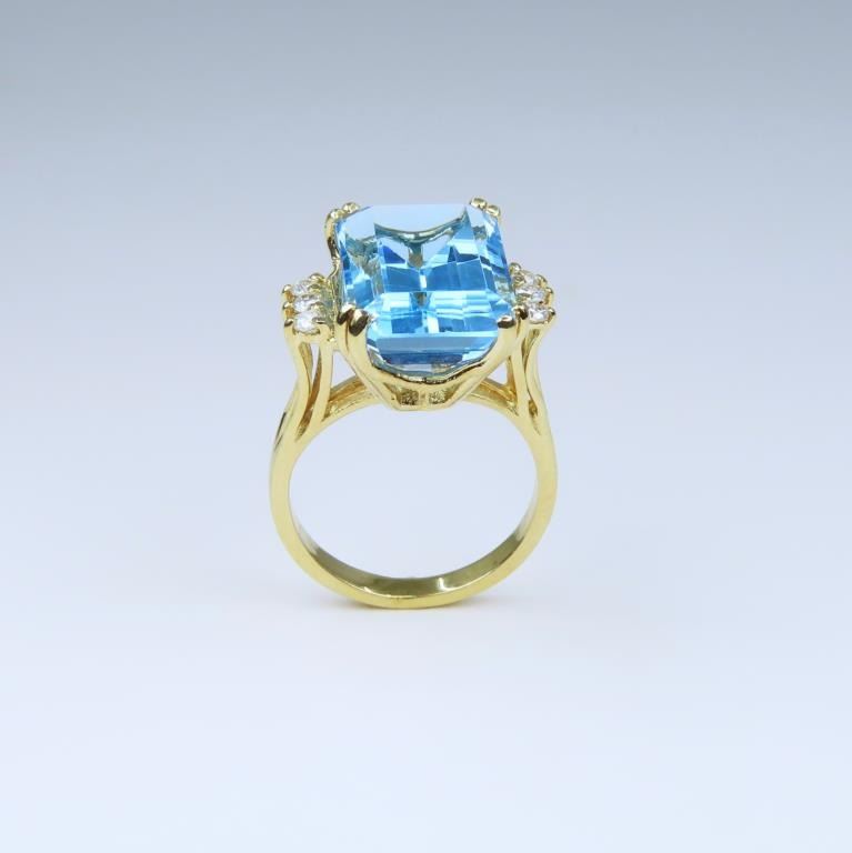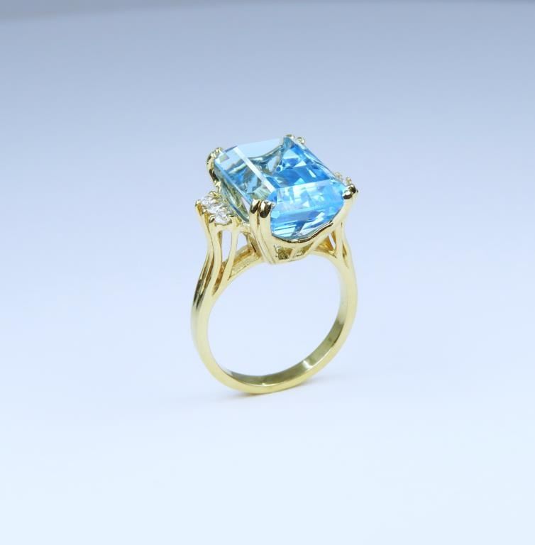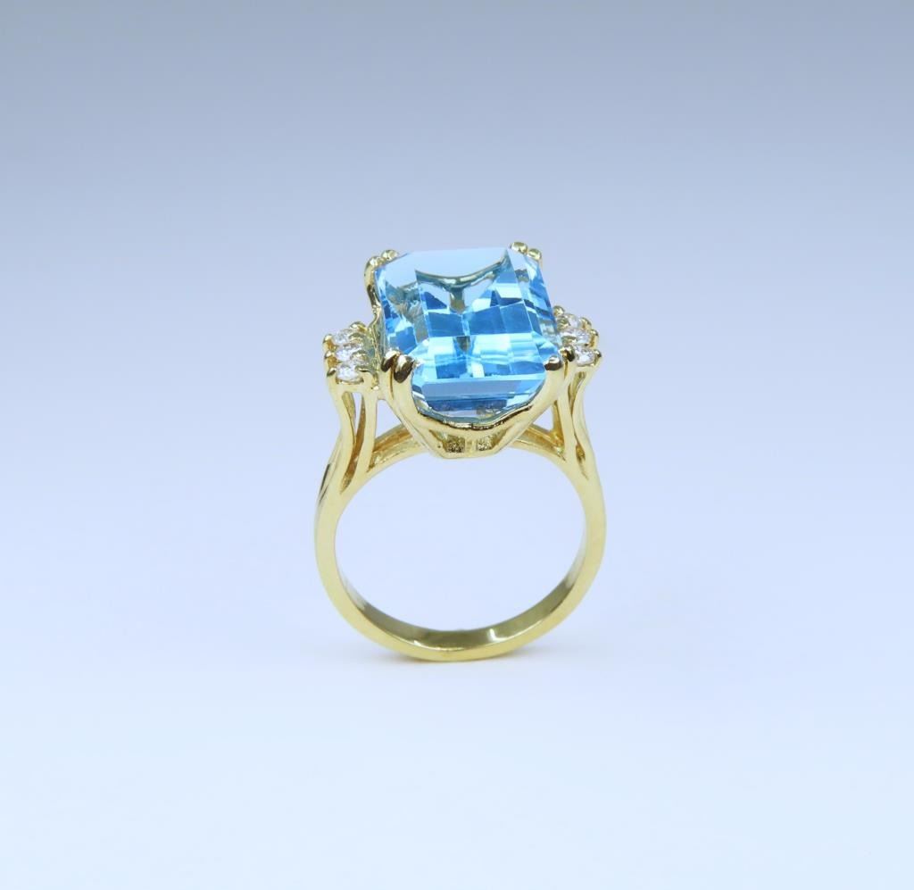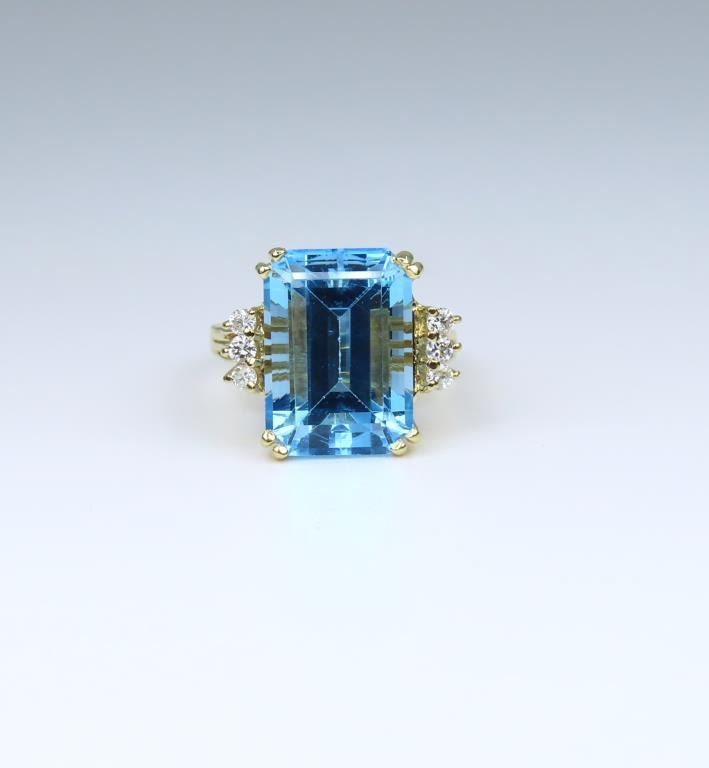 featuring an emerald cut bright Blue Topaz weighing approx. 10.00 carats accented with 6 round cut Diamonds with F-G colors and VS clarity set in a 14 karat yellow gold setting, Size 5.