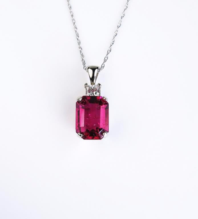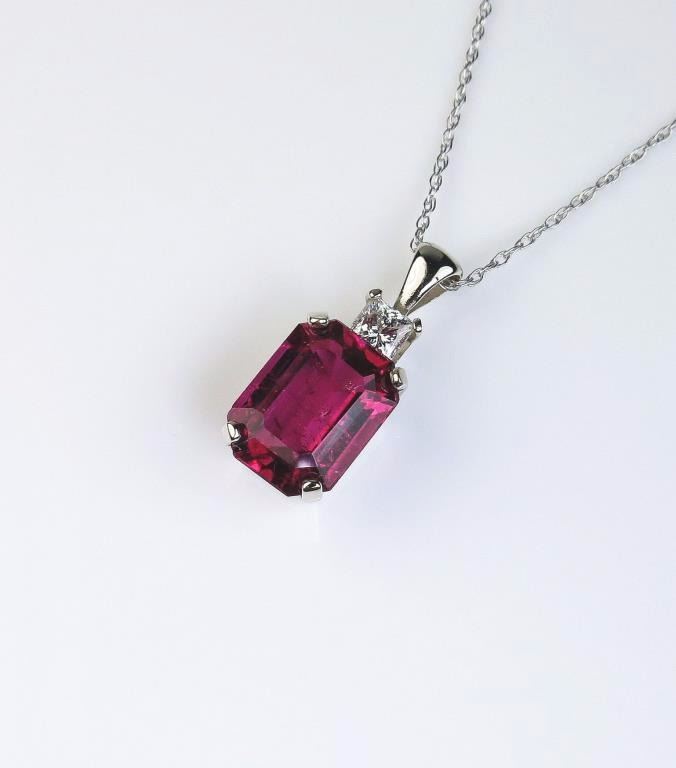 Tourmaline weighing 5.10 carats and accented with an ‘IDEAL’ princess cut diamond weighing 0.45 carats of F-G color and VS clarity set in a 14 karat white gold custom made setting. Retail $4,000-$6,000 Estimates $3,000-$4,000