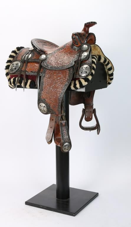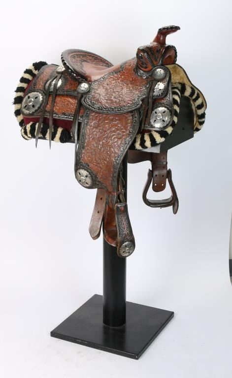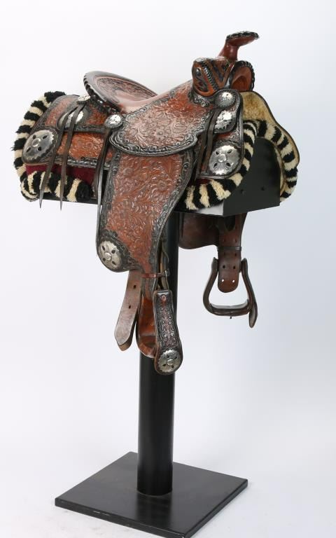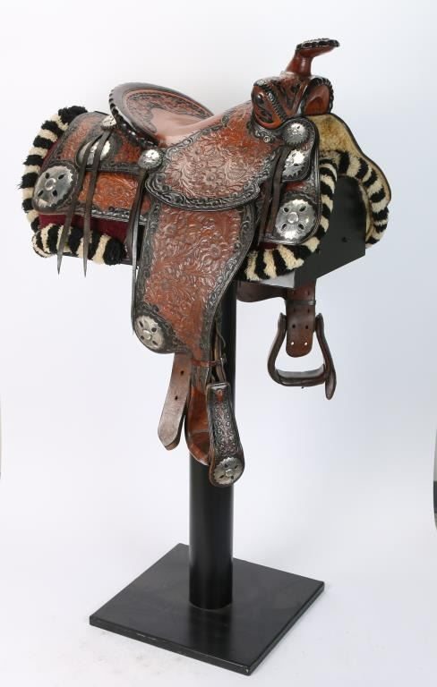black and brown two tone floral deep engraved leather from Southern California show saddle maker marked. A tooled eagle on back of the rope style cantle and 2"-3" three dimensional scalloped edge sterling silver conchos with pierced accents in a floral design .The form and silver continue on to the drop decorated stirrups. The saddle is 14"seat and is overall in excellent condition. In includes and white and black wool corona.