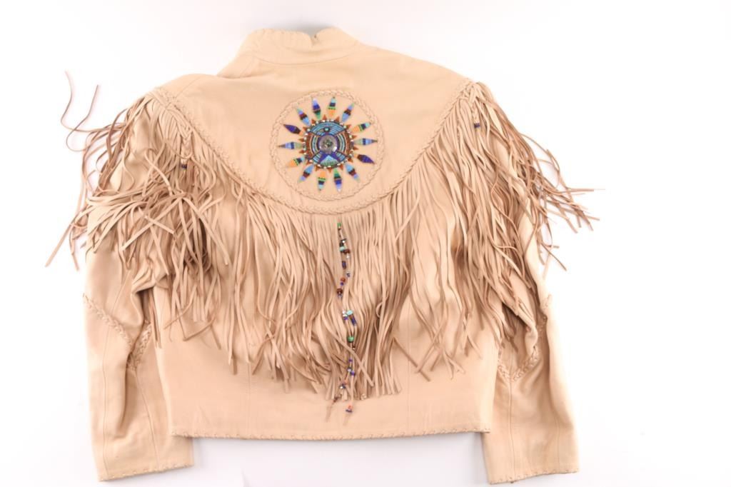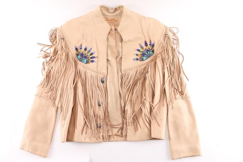 Made by Gossmer Wings, Santa Fe. Brown leather coat with beaded design with concho buttons, fringe, size L.