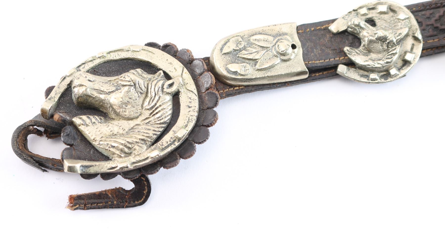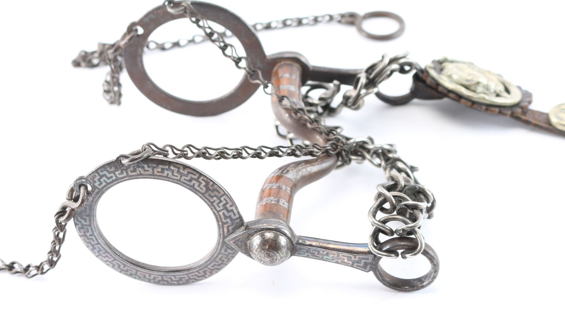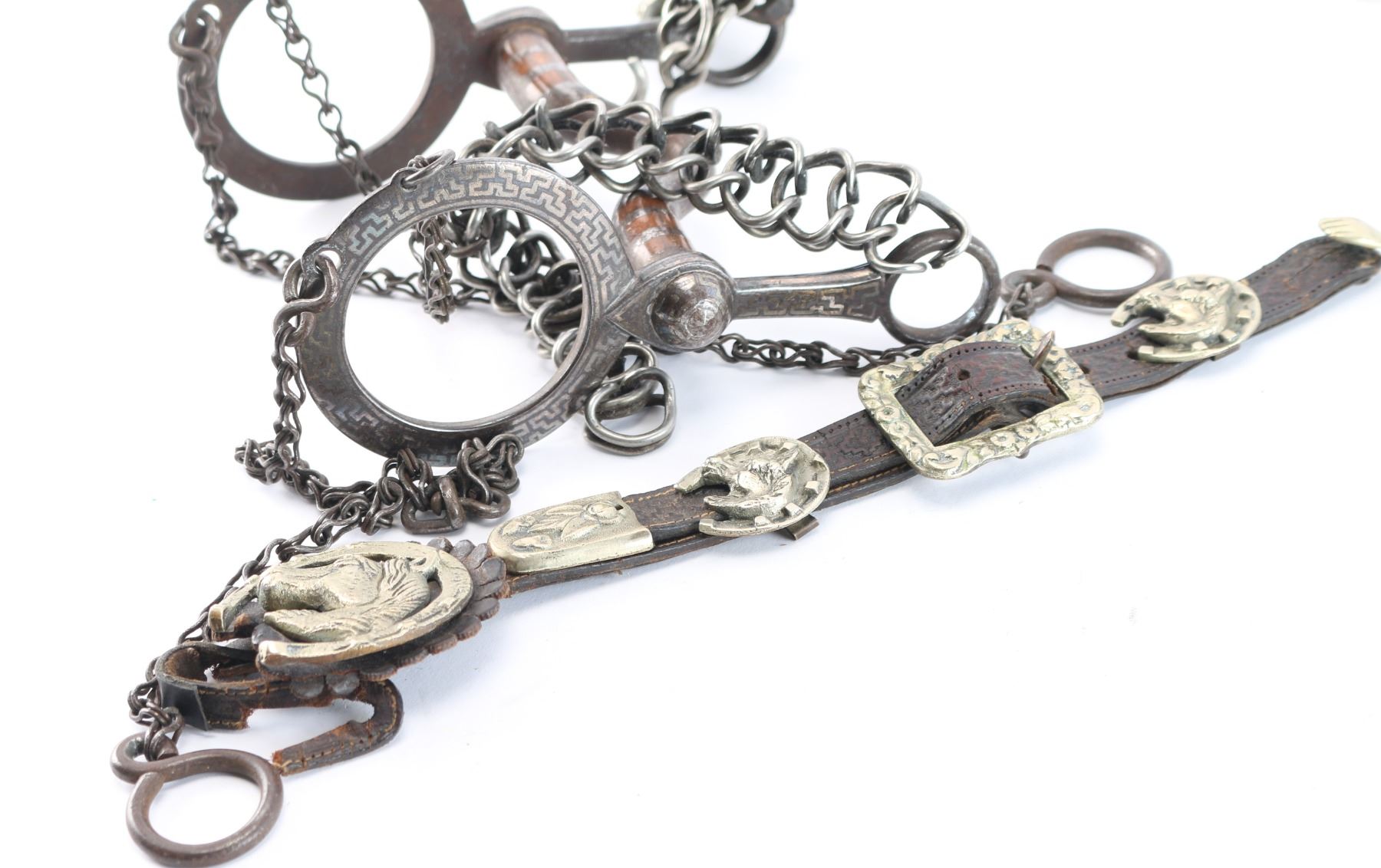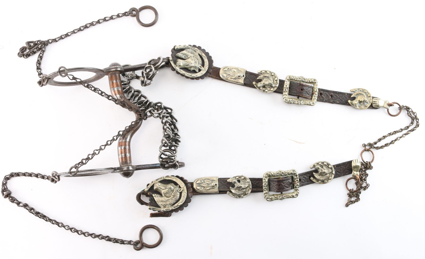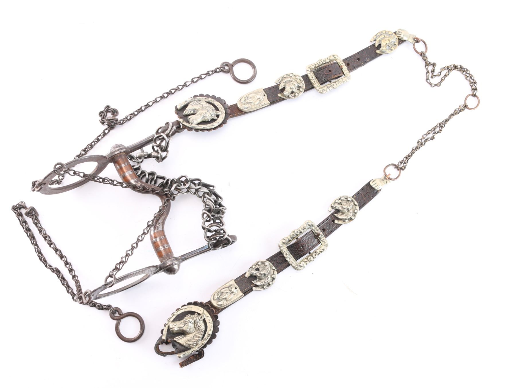 Silver overlaid bit with geometric design maker marked "BM" includes leather bridle with nickeled conchos with horse head and horse shoe design.