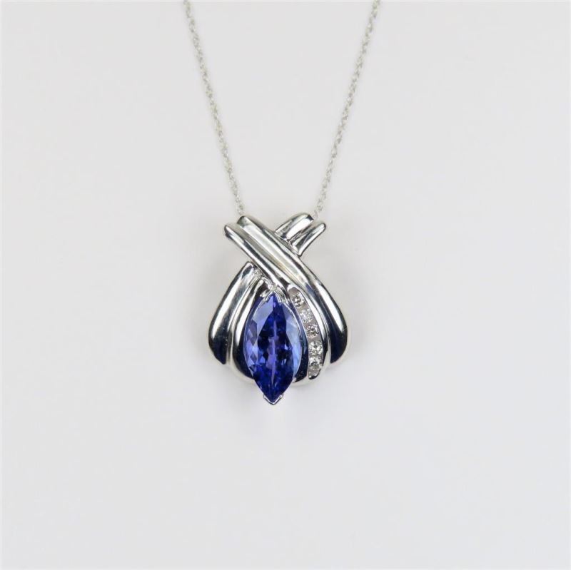 featuring a marquise cut Tanzanite with rich Blue Violet color weighing approx. 2.00 carats accented with 5 round cut channel set Diamonds set in contemporary style 14 karat white gold pendant.