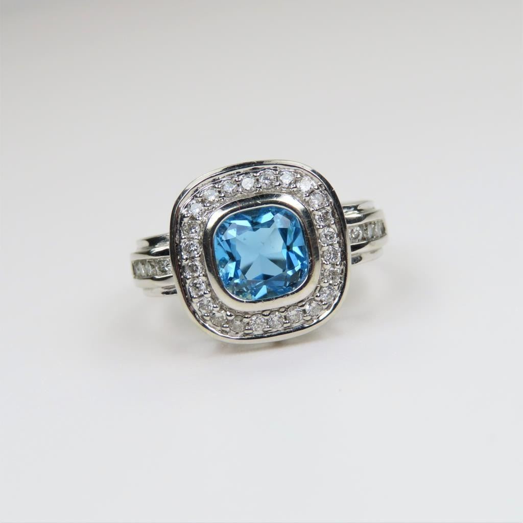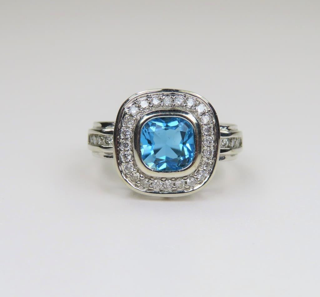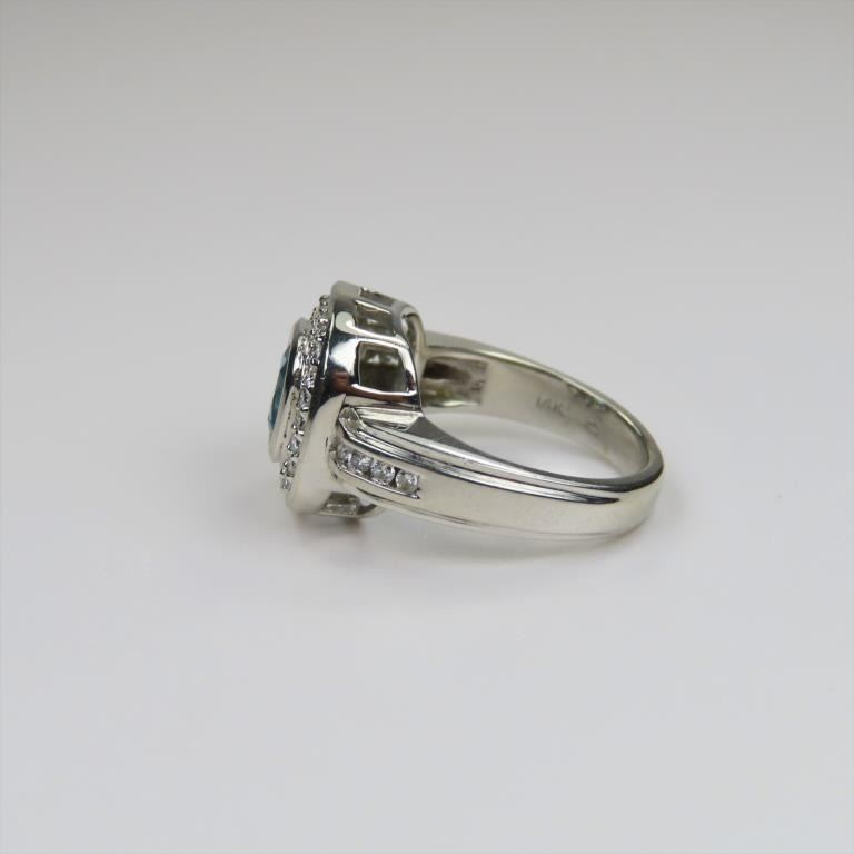 featuring a Topaz with electric Blue color framed with 28 round cut Diamonds weighing approx. 1.00 carats with F-G colors and VS/SI clarity set in a contemporary style 14 karat white gold setting. Retail $2,000-$3,000