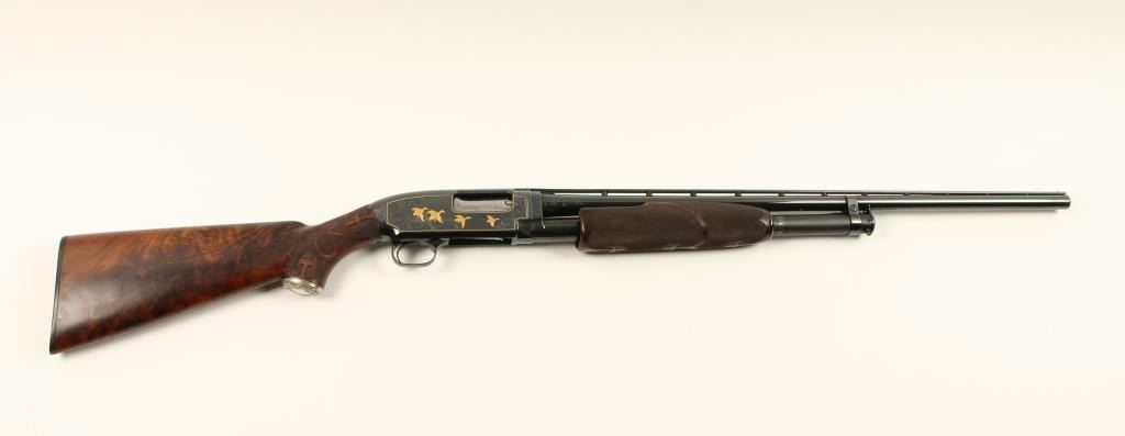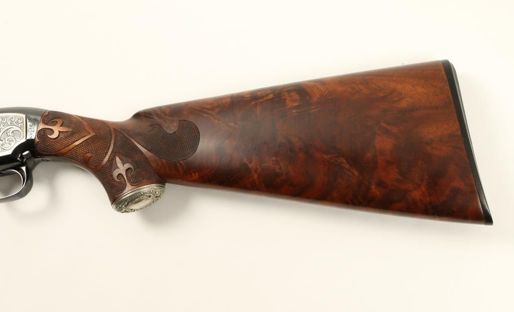 Fantastic Winchester Model 12 takedown pump action shotgun, 28 gauge, 25” barrel, S/N 1676665, fully and finely engraved by Jasper Salerno in 12-5 pattern with gold inlaid borders and game scenes on both sides of the receiver, royal blue finish,deluxe fleur d’ lis raised carved stocks with beautiful flame graining and deluxe pistol grip cap. This Winchester is in overall excellent condition displaying the majority of its royal blue finish, fine bore, action, markings and wood; accompanied by a Winchester lined and leather covered carry case in overall very good condition with some scattered old scuffing to the exterior lid from handling and storage. (Modern). Est.: $8,000-$16,000.