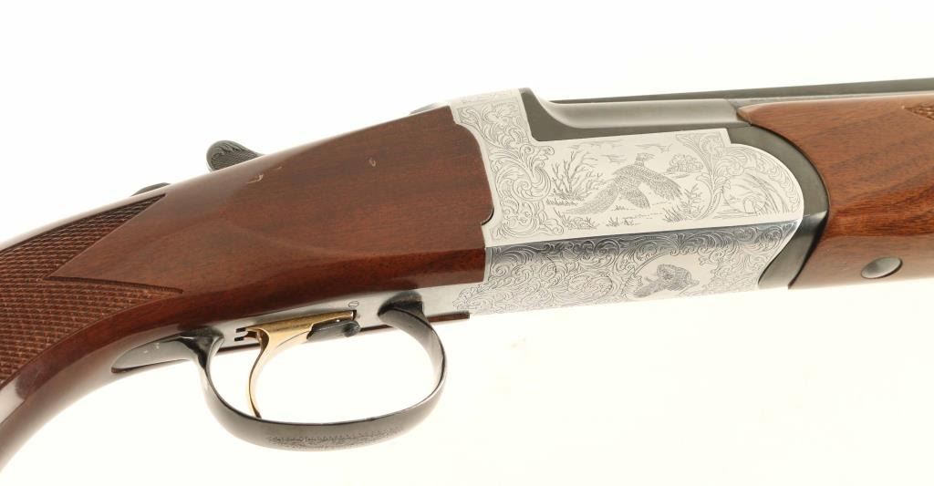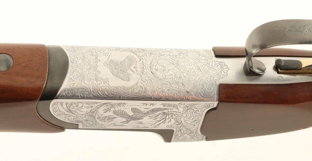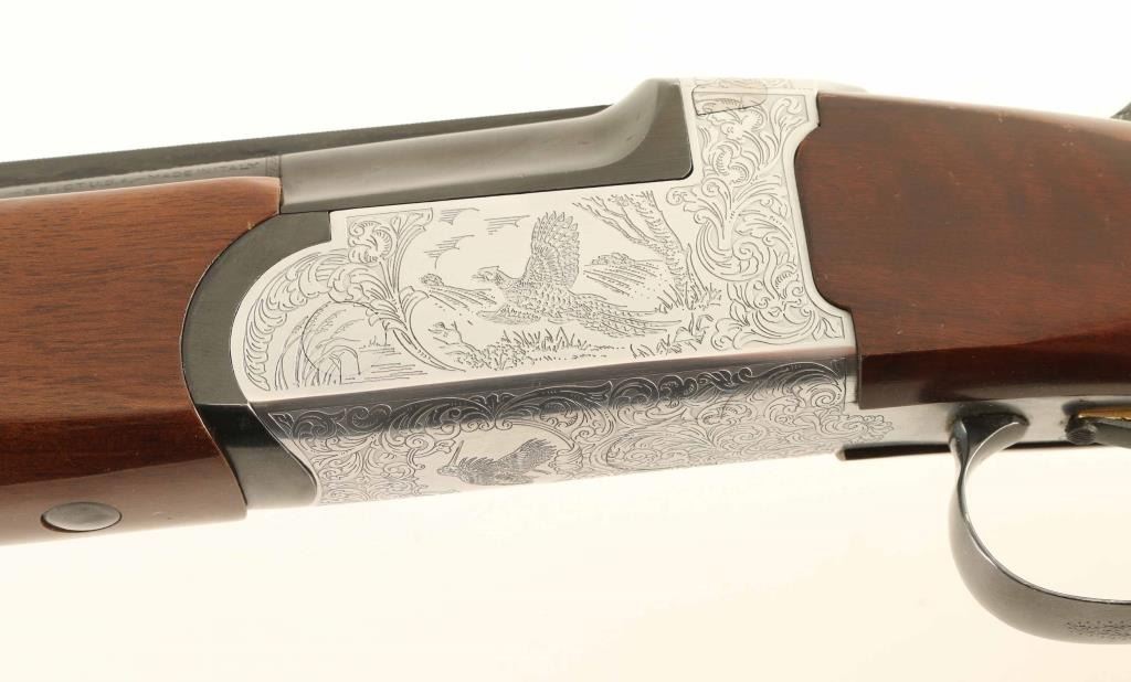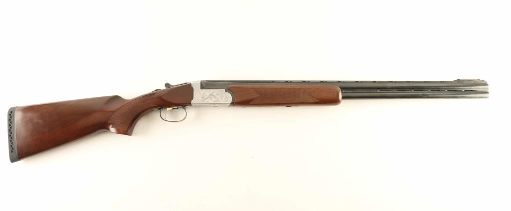 Italian over-under shotgun imported by Traditions, Old Saybrook, CT. Features 26" blued vent rib barrels, IC / M chokes, takes up to 3" shells, fiber optic insert front sight, tang safety, gold accented single trigger with selector lever, bright silver colored receiver, ventilated rubber recoil pad, checkered panels at wrist and forend. Receiver and tang are highly engraved with floral scrolls, pheasants on sides, hummingbird on bottom. Top lever and trigger guard have matching floral scroll engraving. Bores are excellent. Retains 90% deep blue with signs of use and handling, dings to trigger guard, solder lines at barrel rib. Gold color finish on trigger shows wear from use. Urethane finished wood is very good condition, some figure visible at butt, has small dents and dings. Approx stock measurements: 14-1/4" Length of Pull, 1-3/8" drop at comb, 2-1/2" drop at heel. Condition is NRA Very Good+ *** Modern Firearm ***