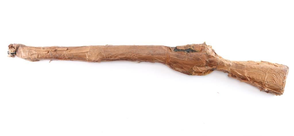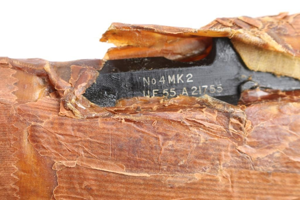 Excellent "Mummy Wrapped" British Lee-Enfield ROF Fazakerley "UF 55" No.4 Mk 2 Bolt Action Rifle. Still covered in factory preservative grease and wax wrapping paper, with the original government label stamped " Rifle, No.4, MK 2. CR 18GA. Normal Butt. FAZ Aug 1955. New." over the buttplate. It was made at the Royal Ordnance Factory Fazakerley (ROF F) in 1955 and was placed into storage shortly thereafter. Left receiver rail stamped "UF55". UF is the manufacturer's code for the Royal Ordnance Factory, Fazakerley, near Liverpool, UK. 55 indicates the year of manufacture or refurbishment (1955).