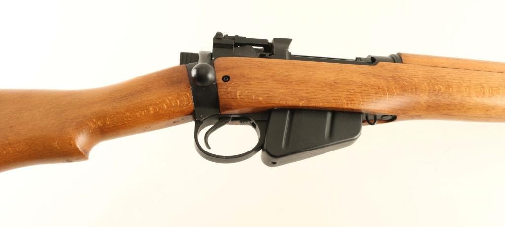 British military magazine fed bolt action service rifle chambered in .303 British, manufactured circa 1955. Imported by CAI of St. Albans, VT with import marks on the right side of the barrel. Features a black painted finish, 25.2" barrel with integral bayonet lugs, shrouded patridge front sight, receiver mounted folding aperture sight graduated to 1,300 yards, two barrel bands, smooth trigger, detachable 10 round magazine, manual safety on the left side of the receiver, sling swivels, integral charge loading guide cuts in the receiver, smooth full-length blonde wood handguard & forend and straight grip shoulder stock with brass trapdoor buttplate. Matching serial numbers are found on the receiver, bolt handle, magazine and forend. The left side of the receiver is marked "No 4 MK 2/UF 55 A20399". Rifle retains approximately 96% of its black painted finish showing minor wear/losses. Action is smooth, the bore is excellent and the wood stocks are fine. Condition is NRA Excellent. ***C&R Firearm***