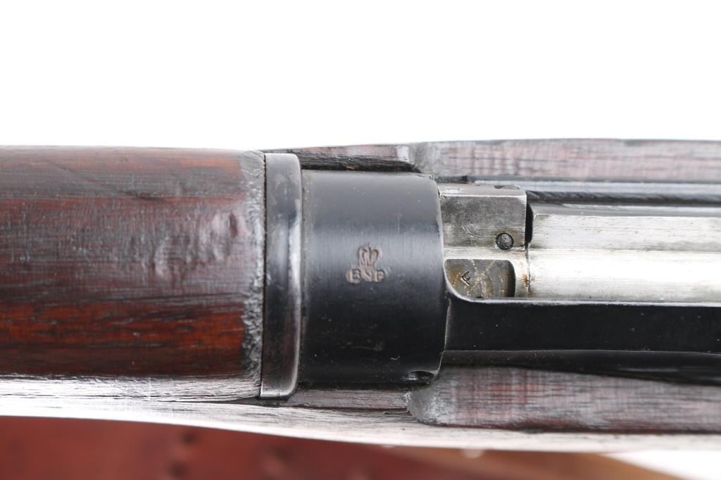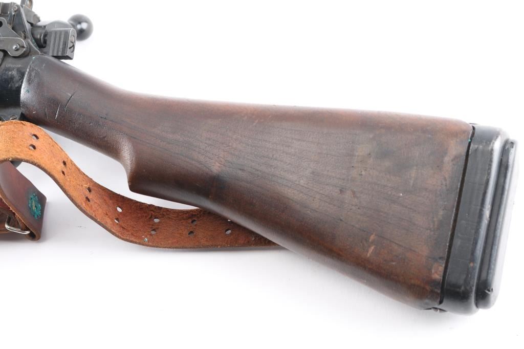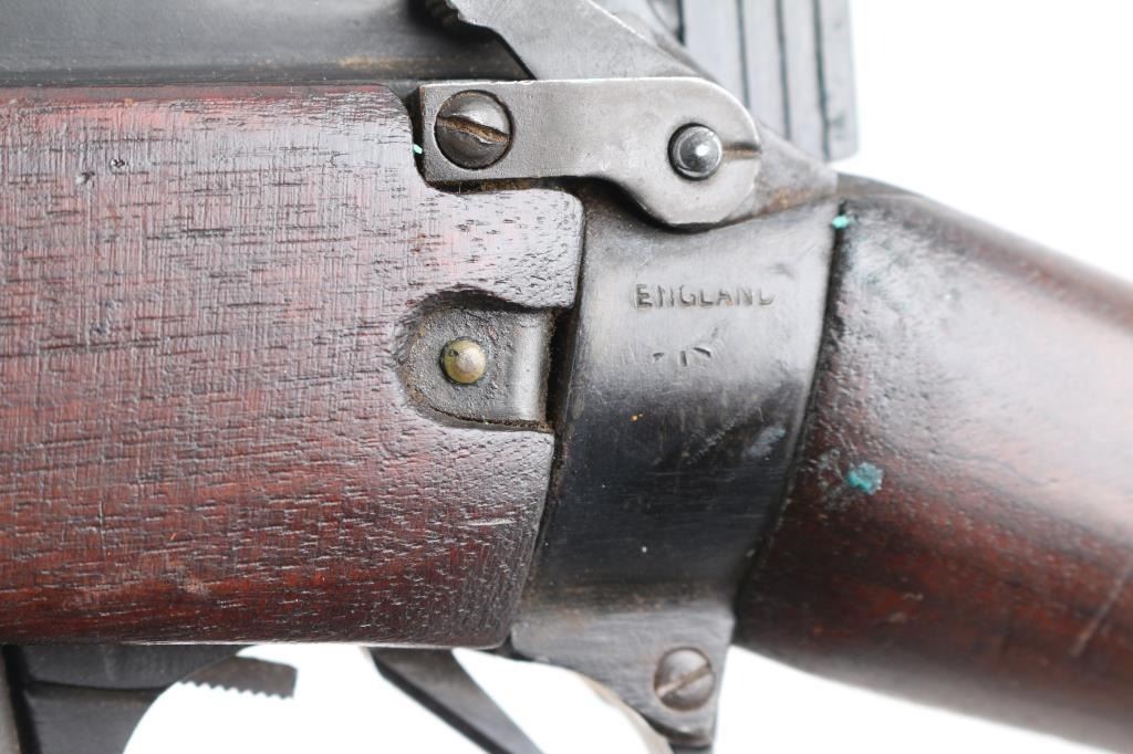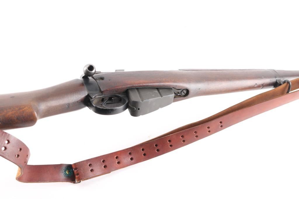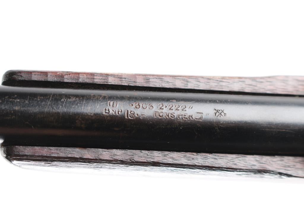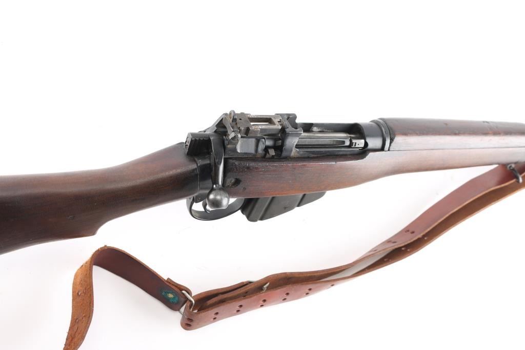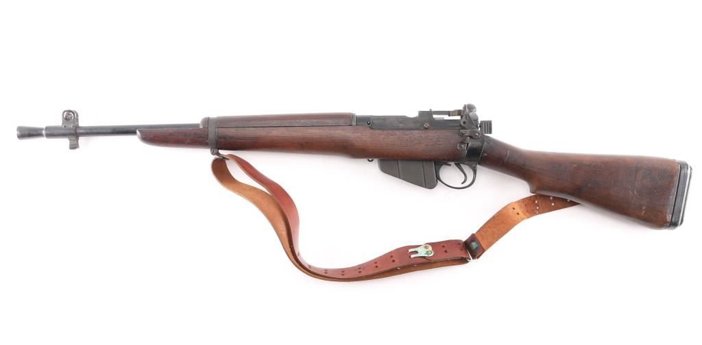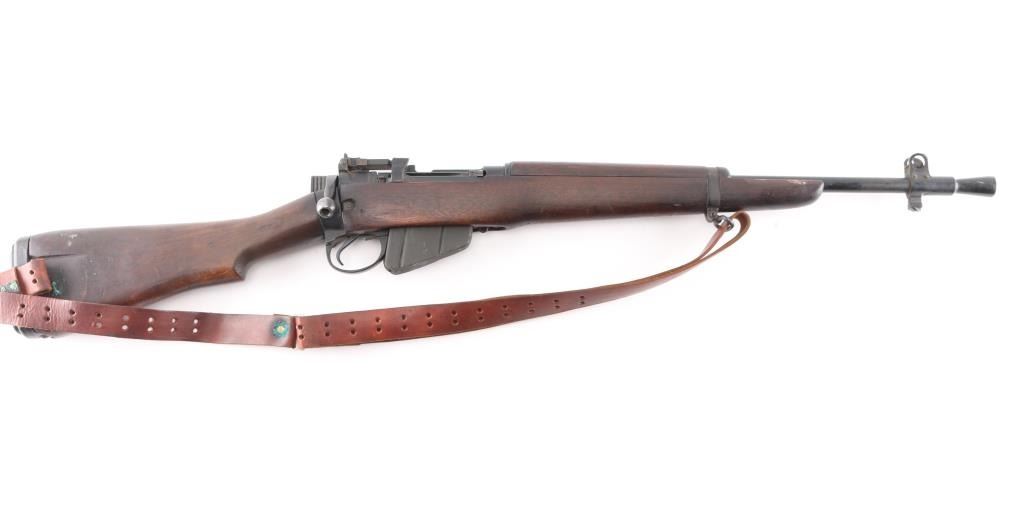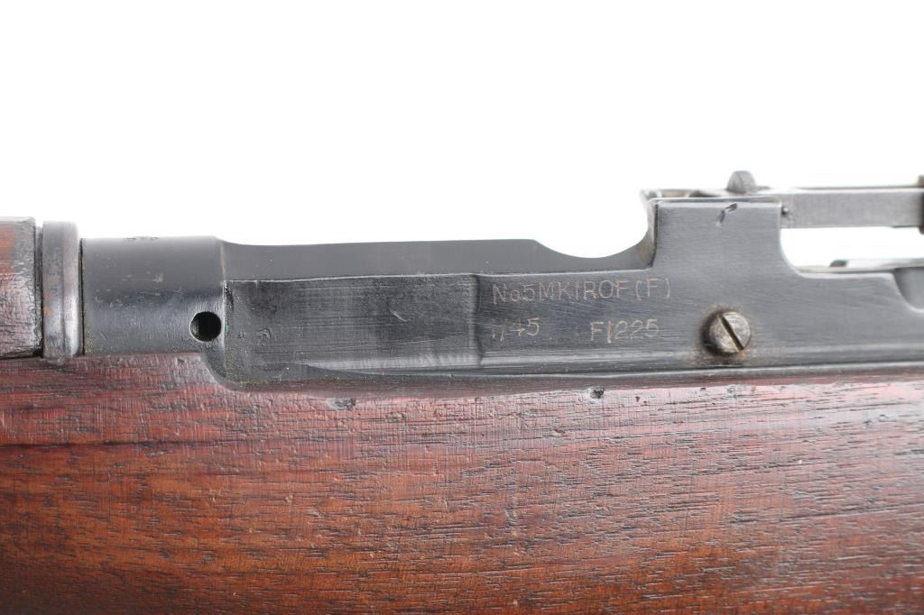 Jungle Carbine. WW2 era British military magazine fed bolt action service rifle chambered in .303 British, manufactured at the Royal Ordnance Factory in Fazakerley, Liverpool circa 1/45. Features a matte black finish, 20.5" barrel, dovetailed front sight base with protective sight ears, cone style flash suppressor & bayonet lug, dovetailed patridge front sight, receiver mounted folding aperture sight graduated to 800 meters, smooth trigger, manual safety on the left side of the receiver, 10 round parkerized detachable magazine, sling points, hollowed bolt handle, steel buttplate with rubber recoil pad, and smooth wood stocks. Left receiver rail marked "No. 5 MK I ROF(F) 1/45 F1225", British proofs and broad arrow marks. Left butt socket marked "England". Rifle retains most of its black painted finish with edge wear. Action is smooth, the bore is good with strong rifling. The wood stocks are very good/sound. Incorrect brown leather sling attached.NRA Condition-Good++. C&R Firearm.