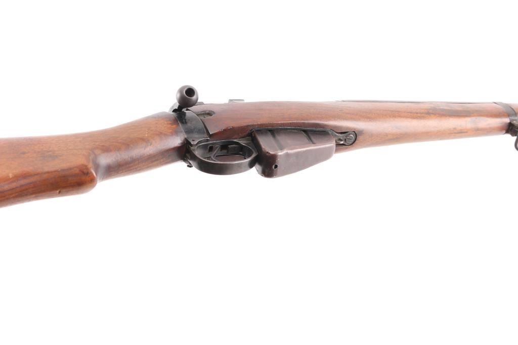 "Jungle Carbine" British military bolt action rifle dated 1947, no importer marks observed. Features black paint over blued finish, 20.5" barrel, pinned front sight base with protective sight ears, cone style flash suppressor & bayonet lug, dovetailed patridge front sight, receiver mounted folding aperture sight, smooth trigger, manual safety on the left side of the receiver, 10 round detachable magazine, sling swivel, hollowed bolt handle, steel buttplate with rubber recoil pad, three-piece smooth wood stocks. Non-matching bolt. The left side of the receiver is marked "No5 MK1 ROF(F)” and the left side of the butt socket is stamped “ENGLAND”. Bore is fair to good condition, dark, with strong rifling. Rifle retains traces of black paint, blued surface have mostly faded to a brownish color, with edge losses & handling marks. Flash hider assembly shows scattered pinprick patina and rust. Magazine is mostly patina brown, with darker colored bluing retained in bottoms of side ribs. Wood is good condition, many scrapes and scratches. Condition is NRA Good++ *** C&R Firearm ***